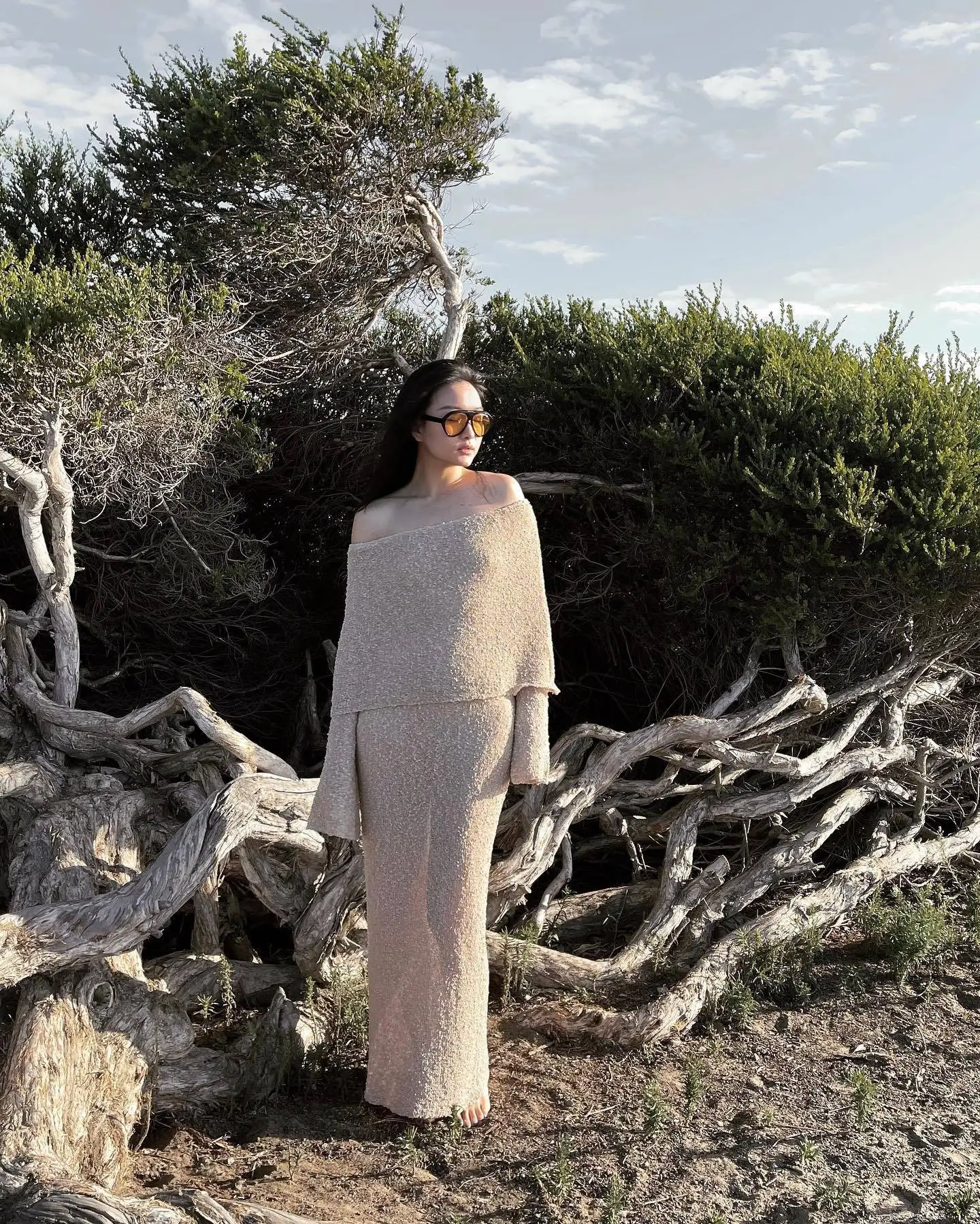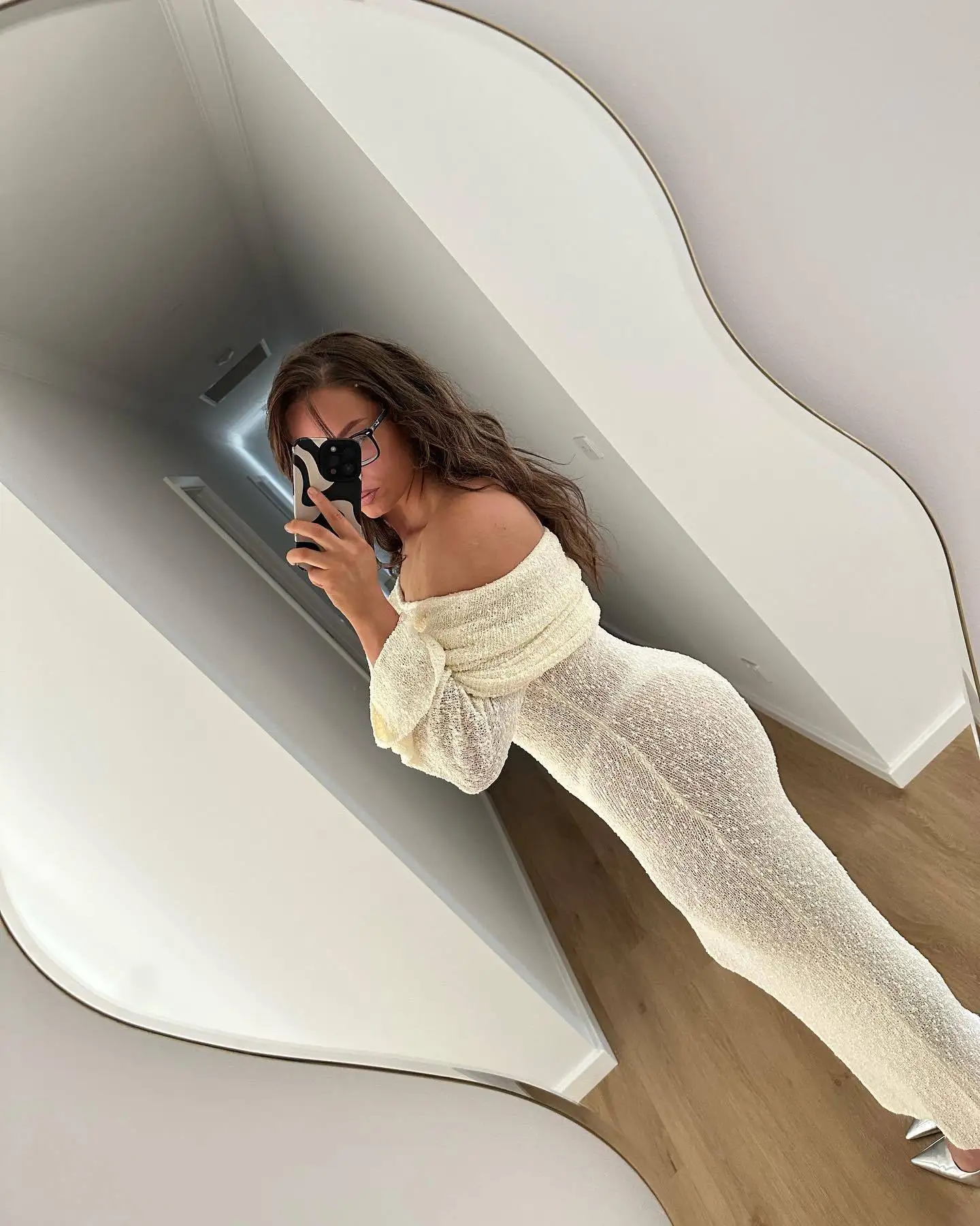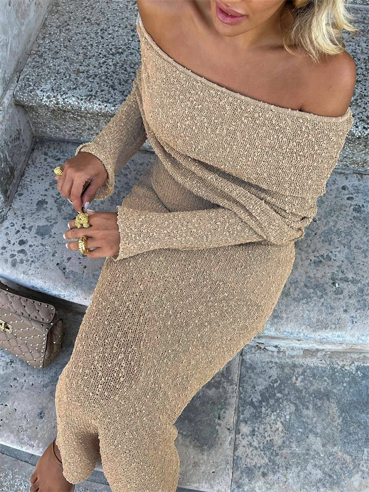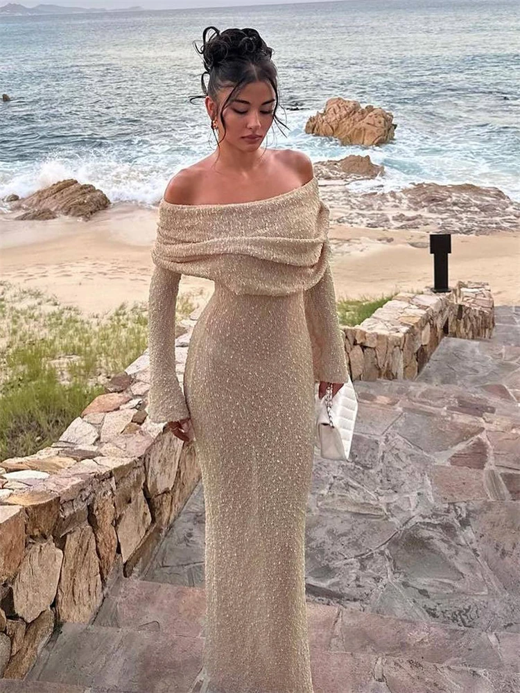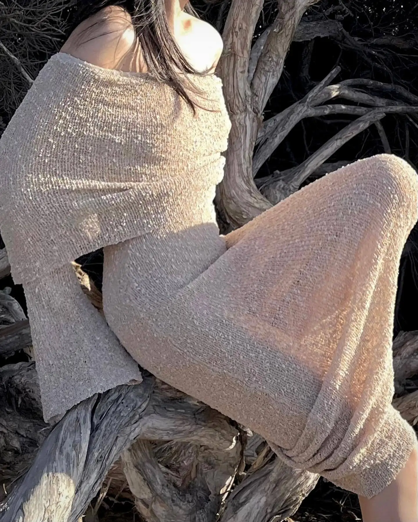 Yipinpay Knit Hollow Out Off-Shoulder Maxi Dress Female Cover up Loose Long Sleeve Holiday Beach Party Dress Women Knitwear Dress