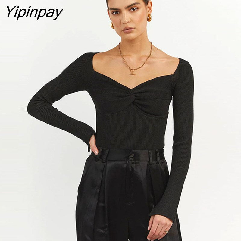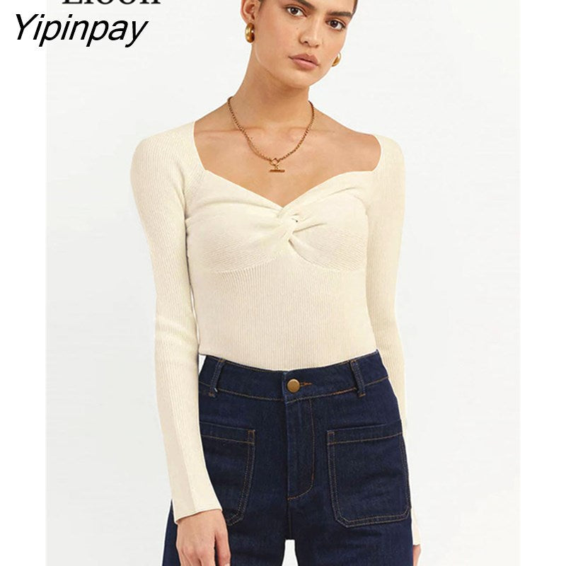 Yipinpay Knit Ribbed T Shirt Women Ruched Corset Top Autumn Long Sleeve V Neck Basic Tees Sexy Bodycon Tshirt Knitted Tops