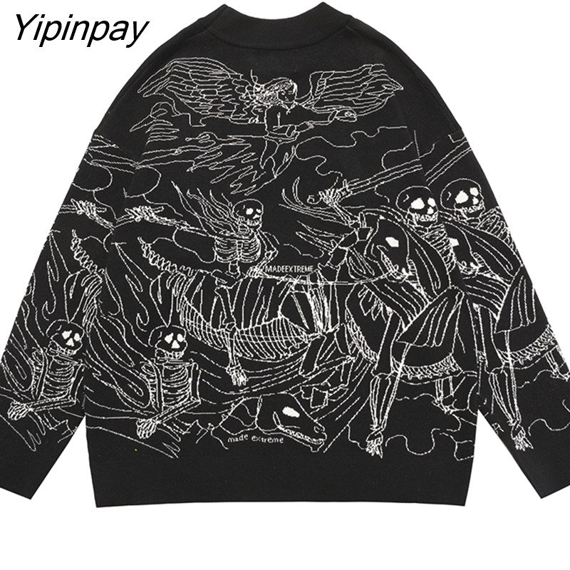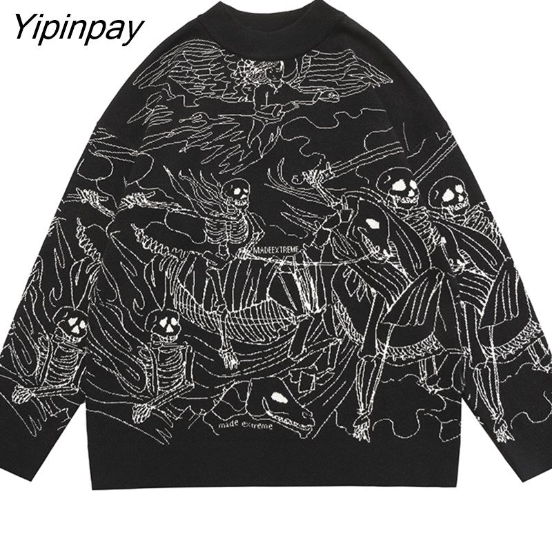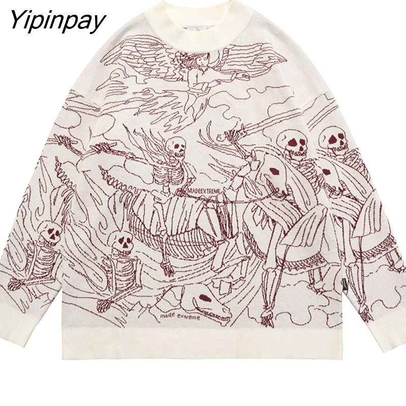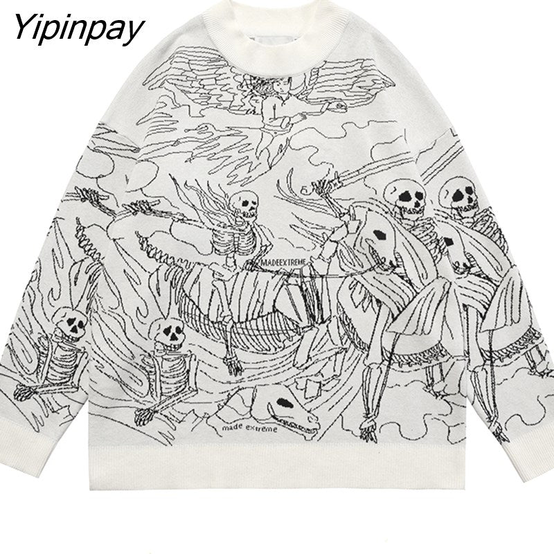 Yipinpay Knitted Sweater Harajuku Ukiyo-e Style Skull Graffiti Pullover 2023 Autumn Streetwear Sweater Men Women Cotton Knitwear
