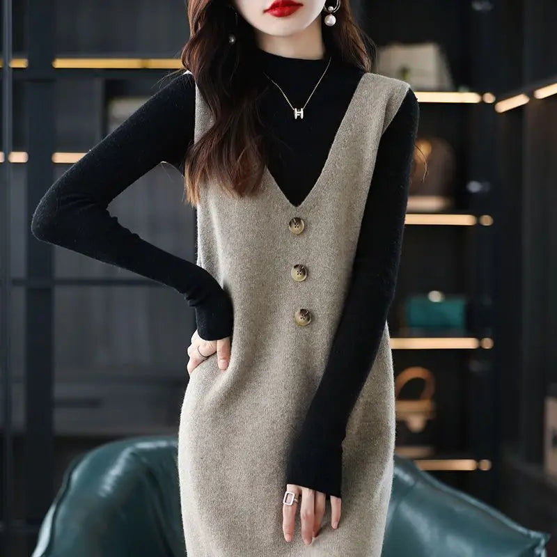Yipinpay knitted vest skirt long V-neck casual loose sweater solid 2024 autumn and winter knitted sleeveless women vest sweater