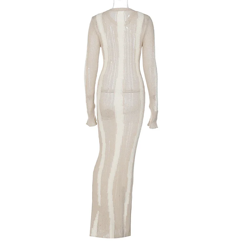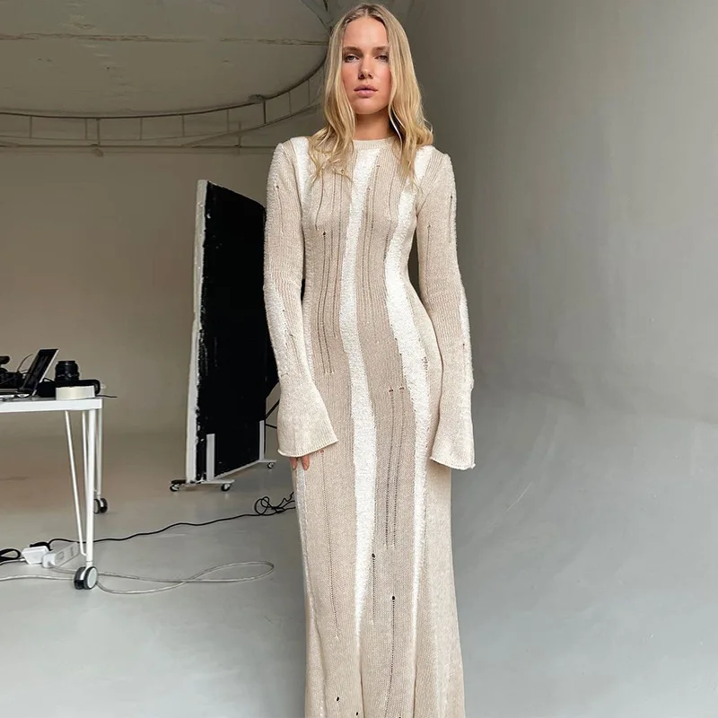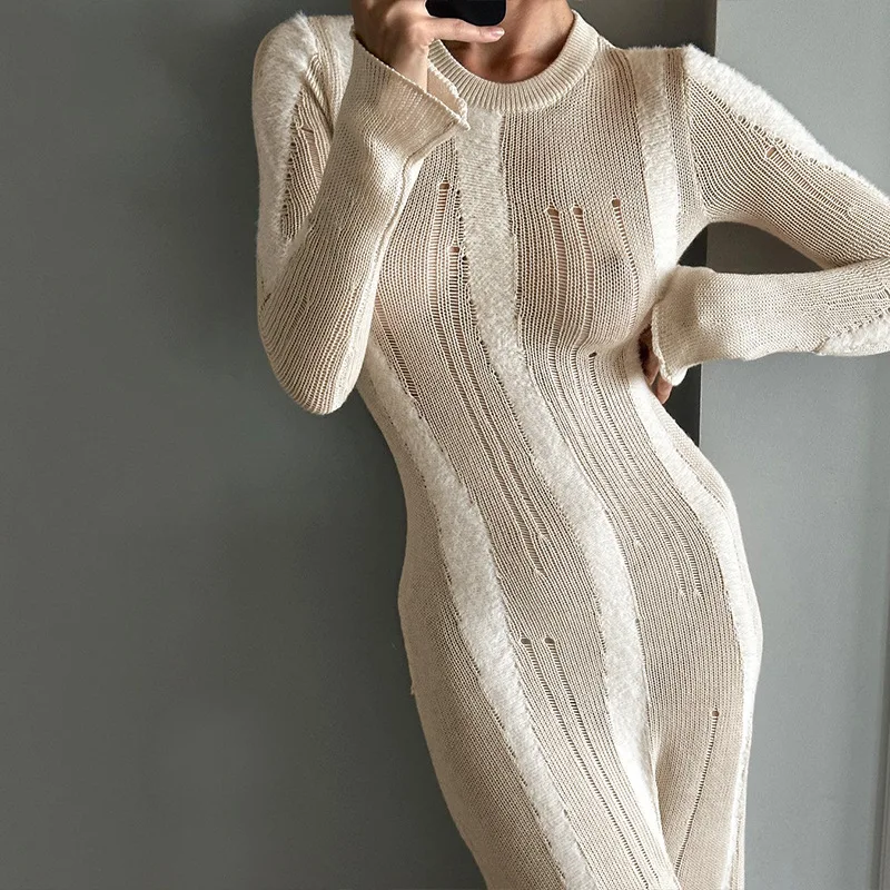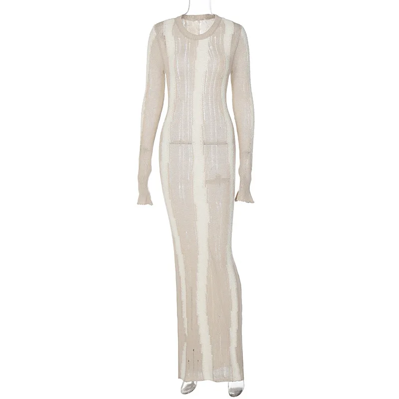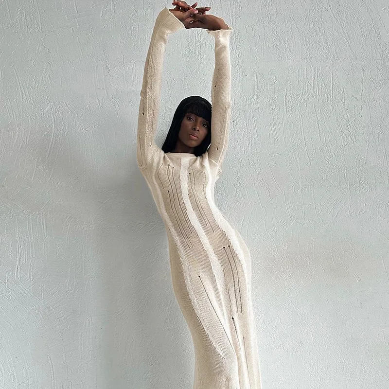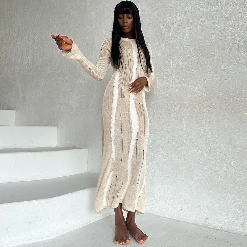 Yipinpay Knitwear Hollow Out Solid Maxi Dress For Women See-Through High Waist Loose Knit Autumn Dress Fashion Elegant Party Dress