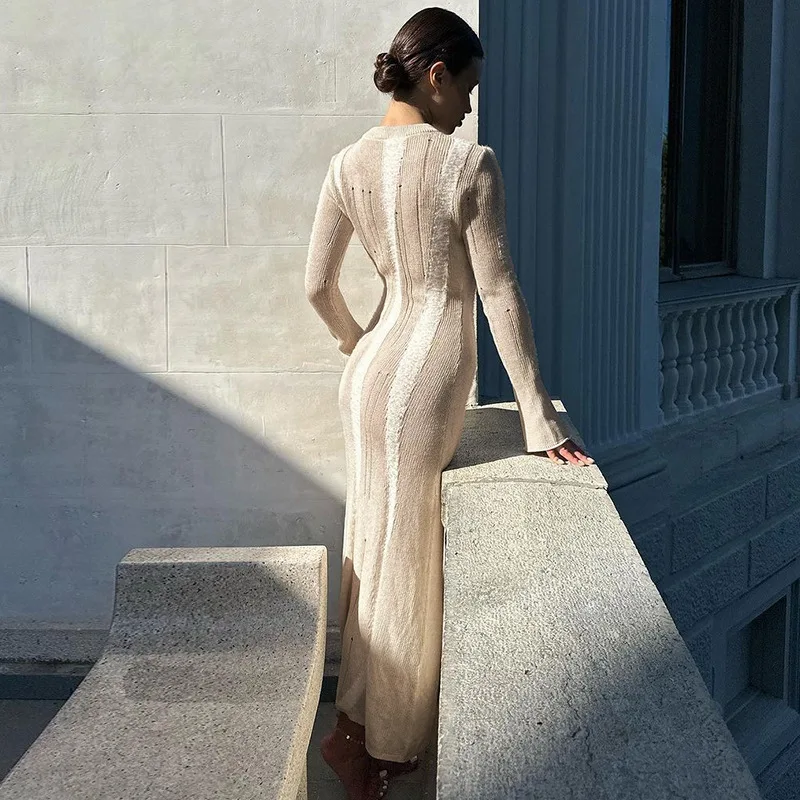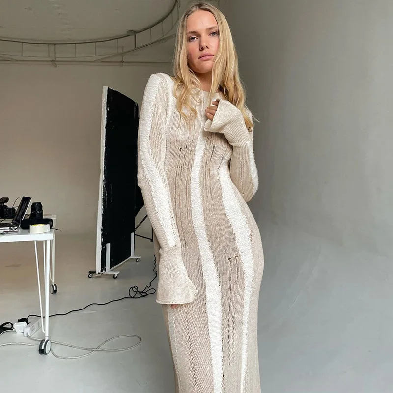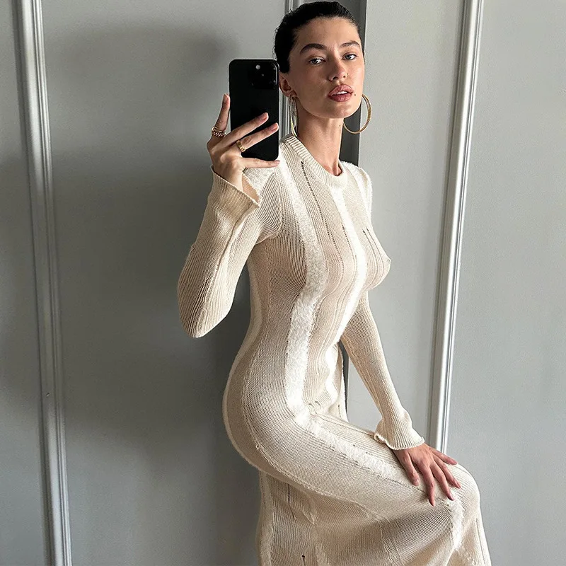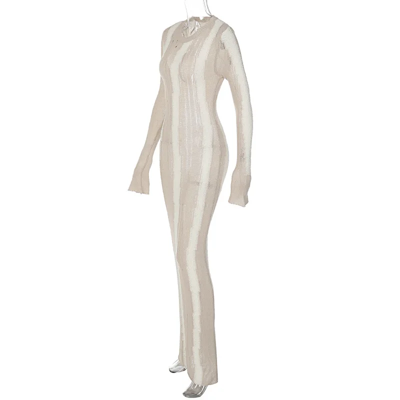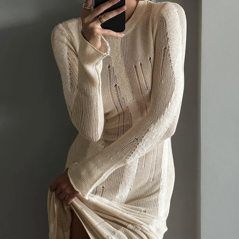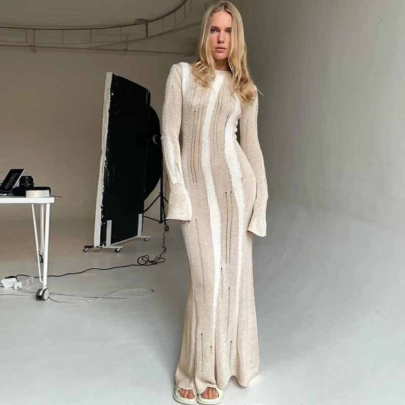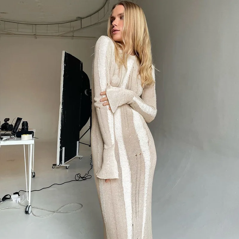 Yipinpay Knitwear Hollow Out Solid Maxi Dress For Women See-Through High Waist Loose Knit Autumn Dress Fashion Elegant Party Dress