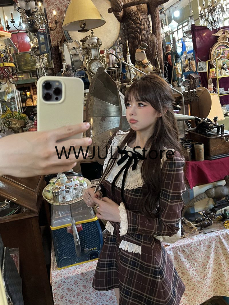 Yipinpay Korean Preppy Style Mini Plaid Dress Women Vintage One Piece Dresses Y2k Jk Uniform Long Sleeve Tunic Princess Vestidos