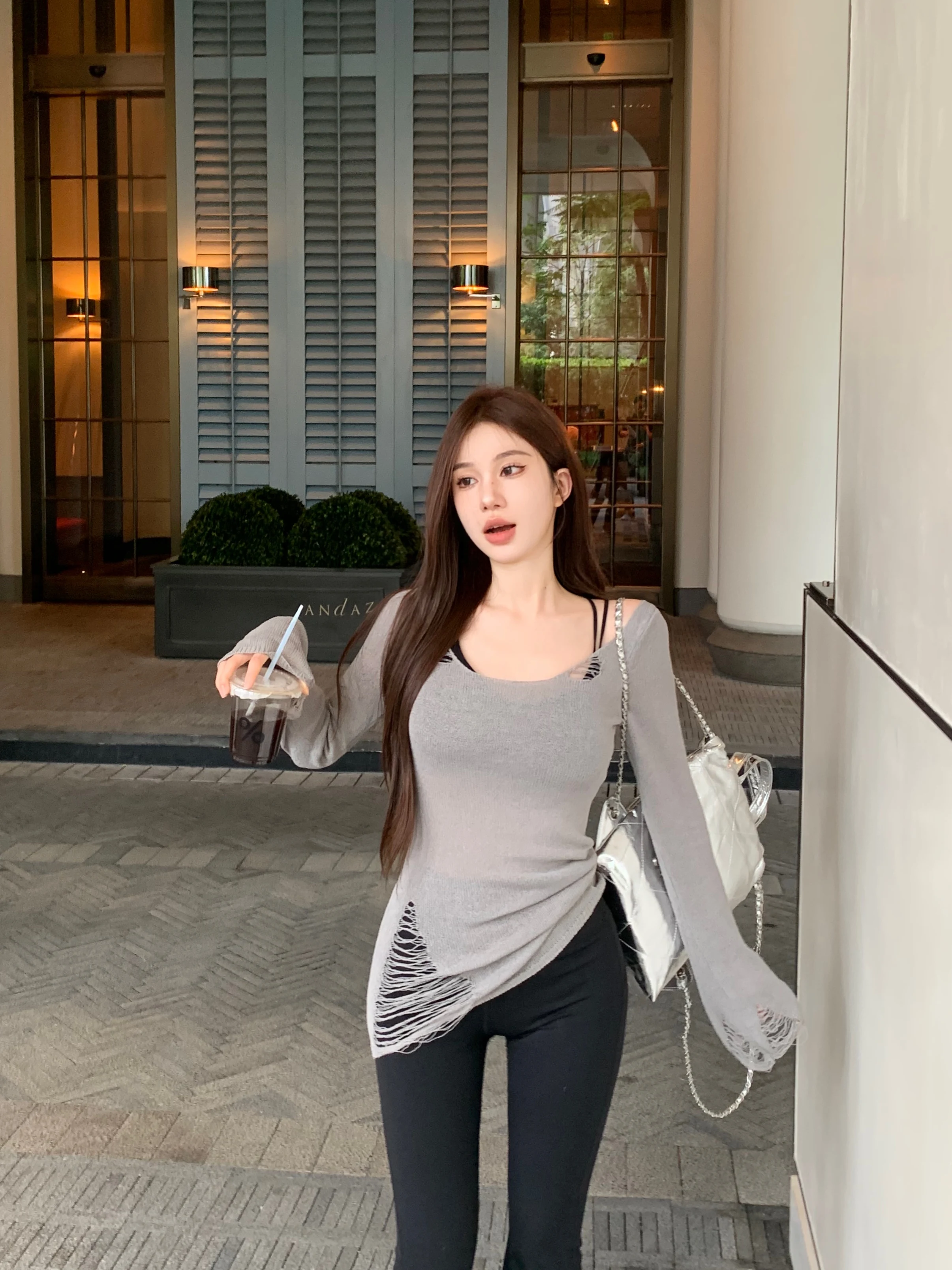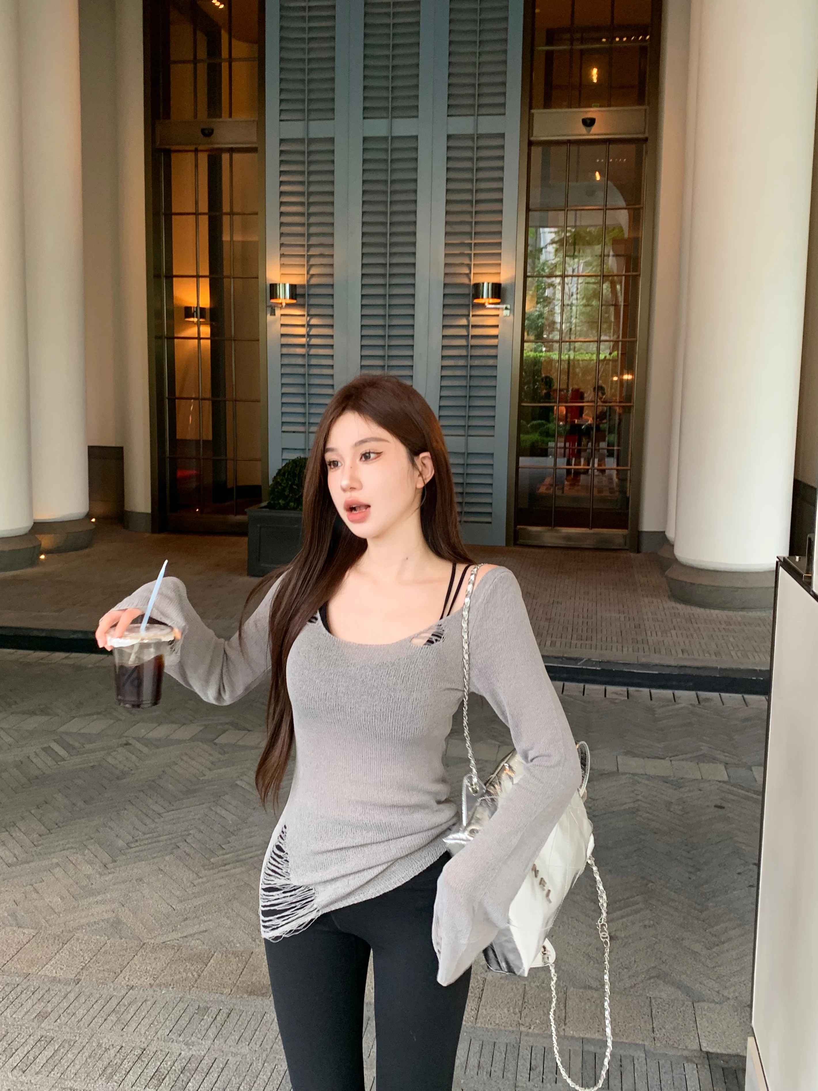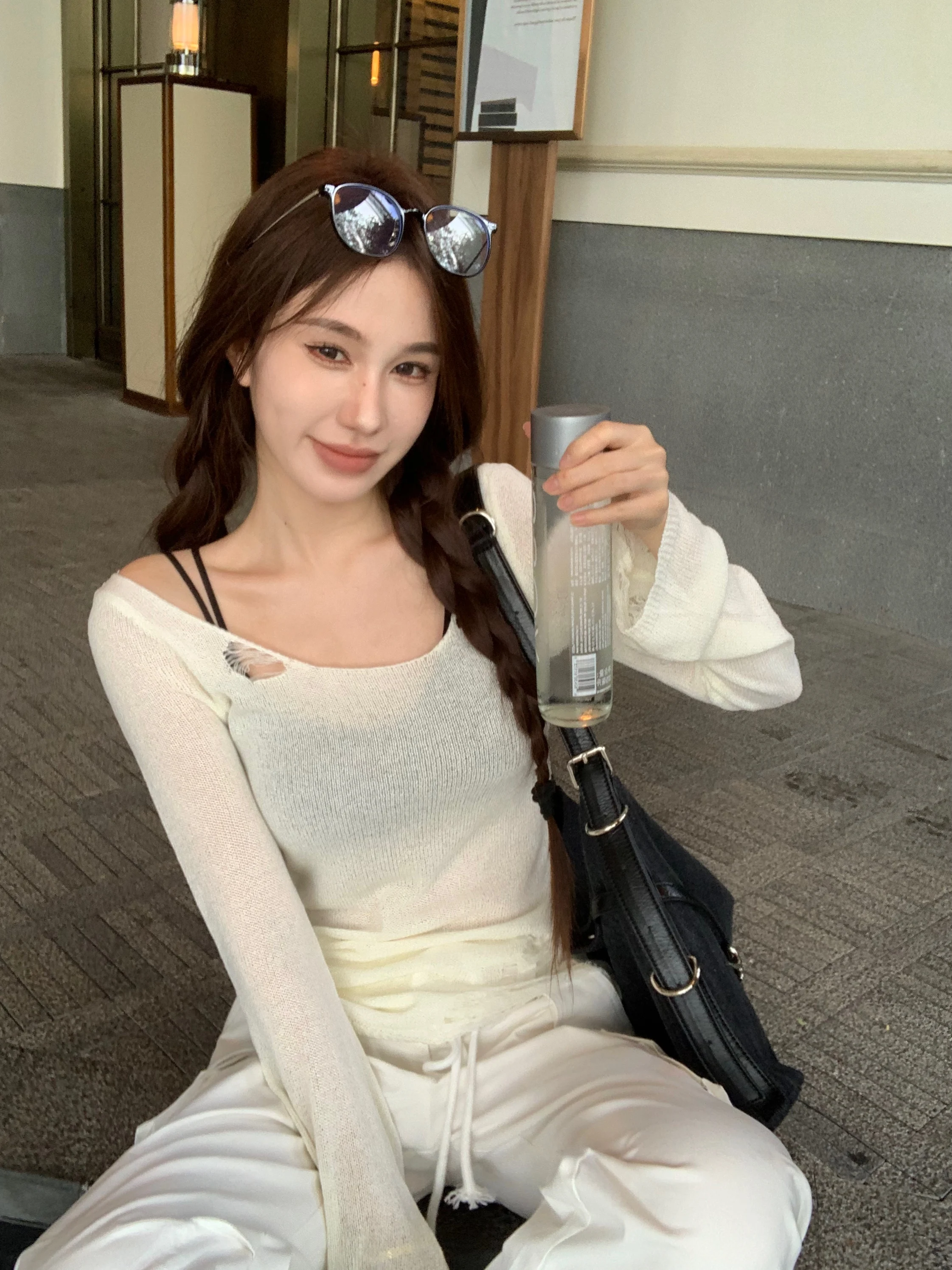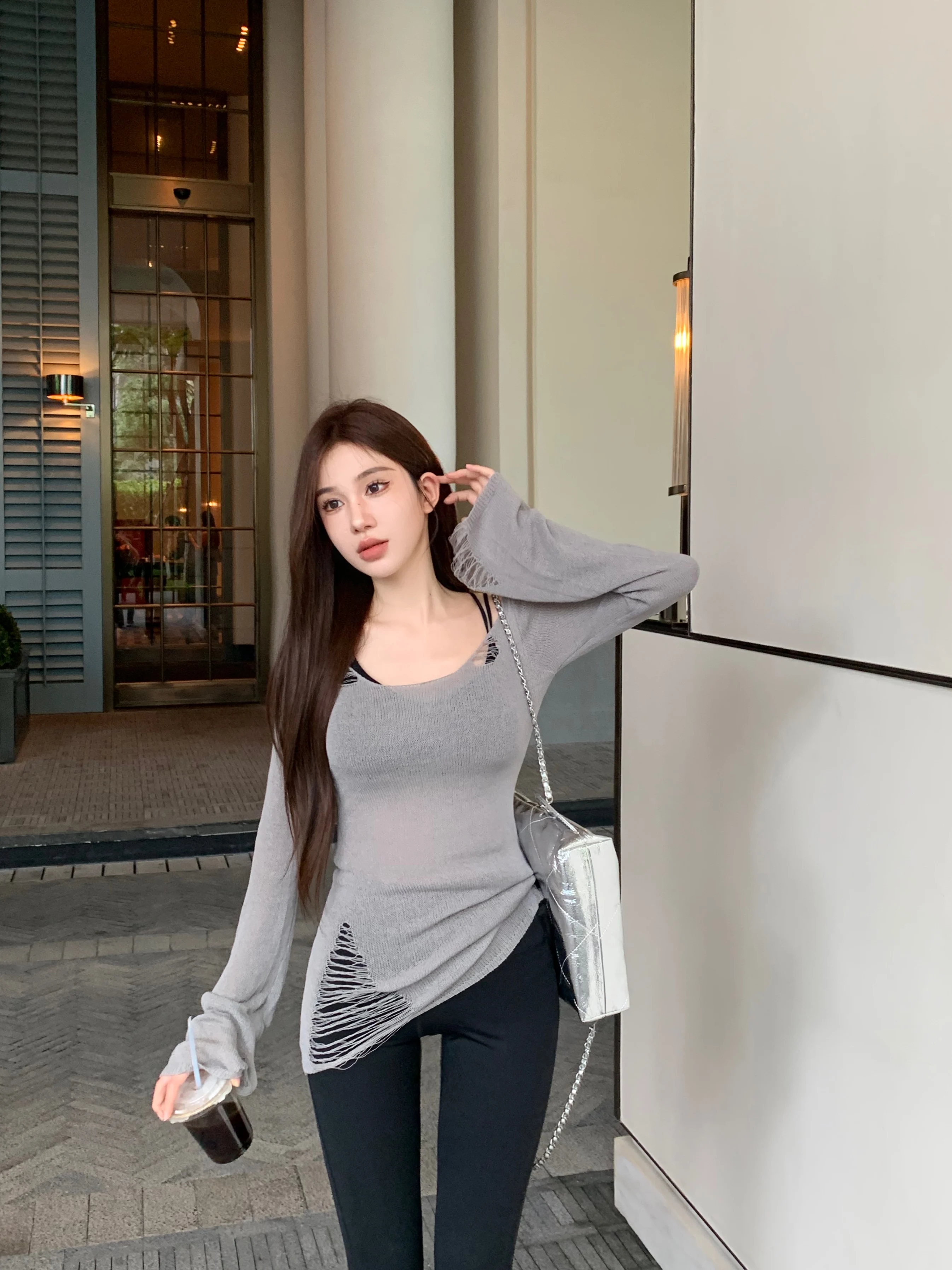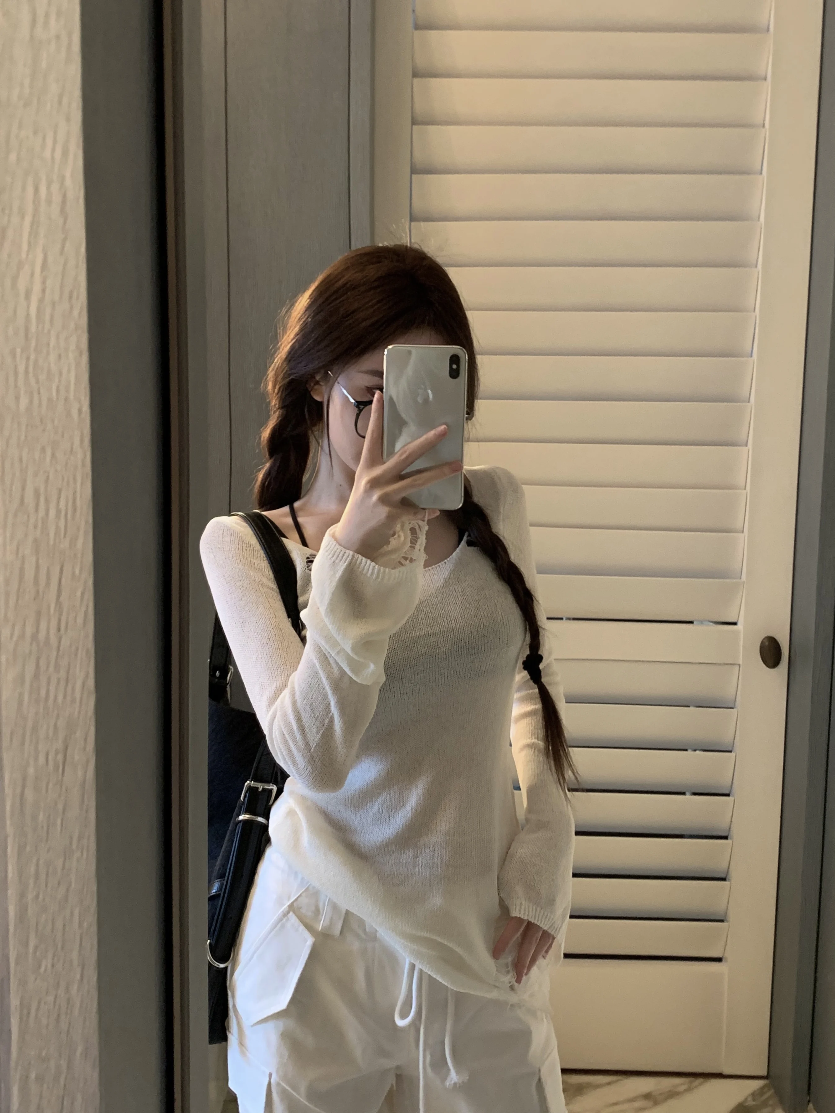 Yipinpay Korean Style Long-sleeved Ripped Thin Knitted Sunscreen Blouse T-shirt Tops With Small Tube Top Fashion Women's Clothing