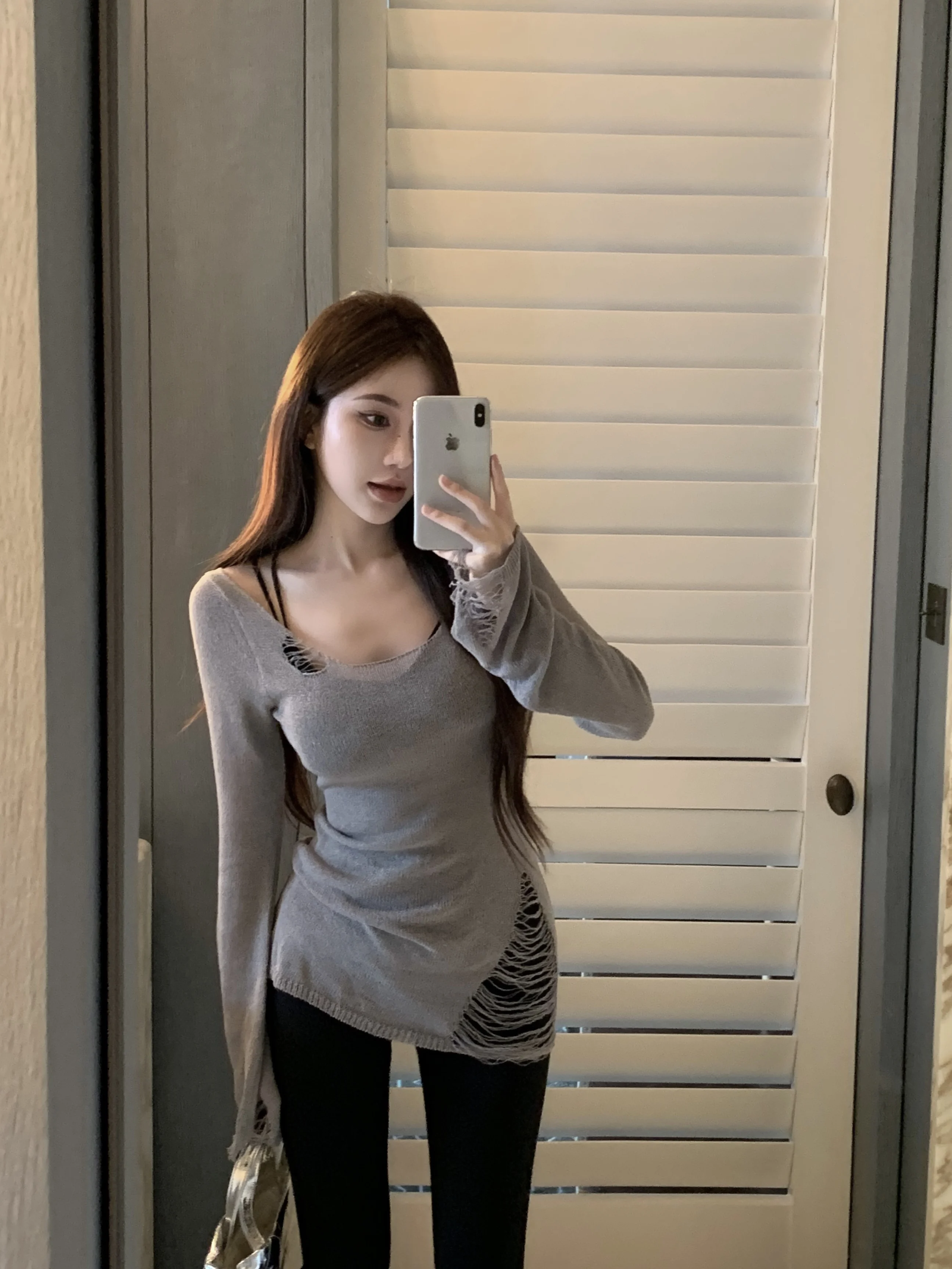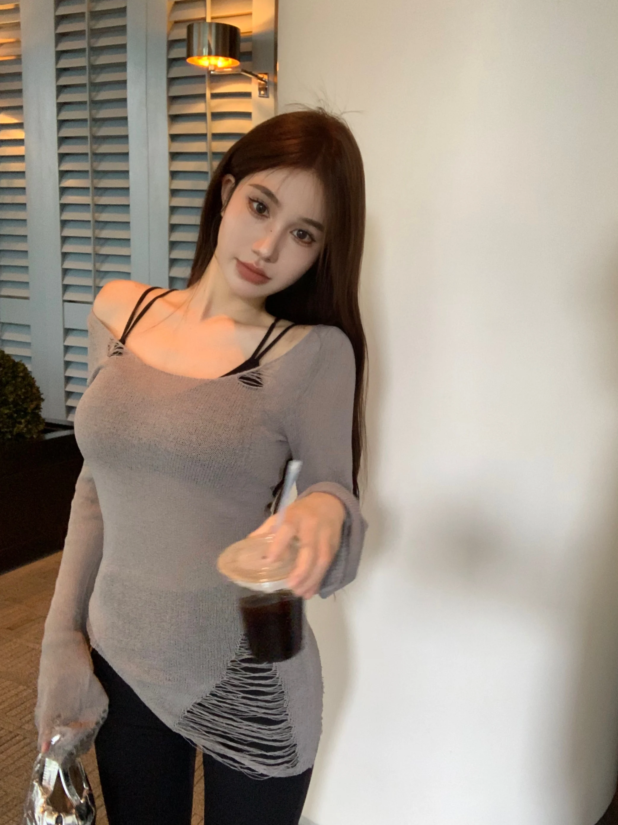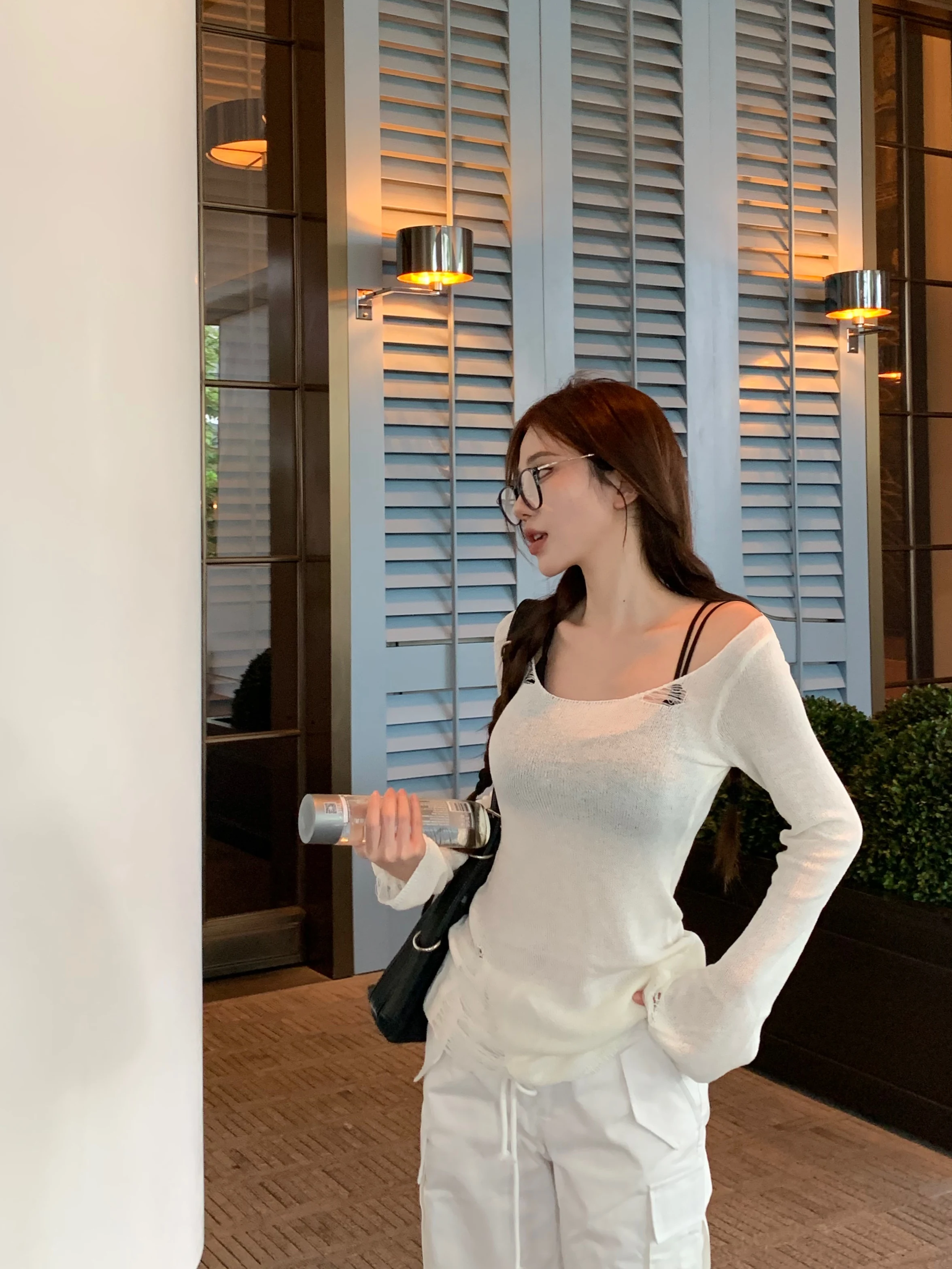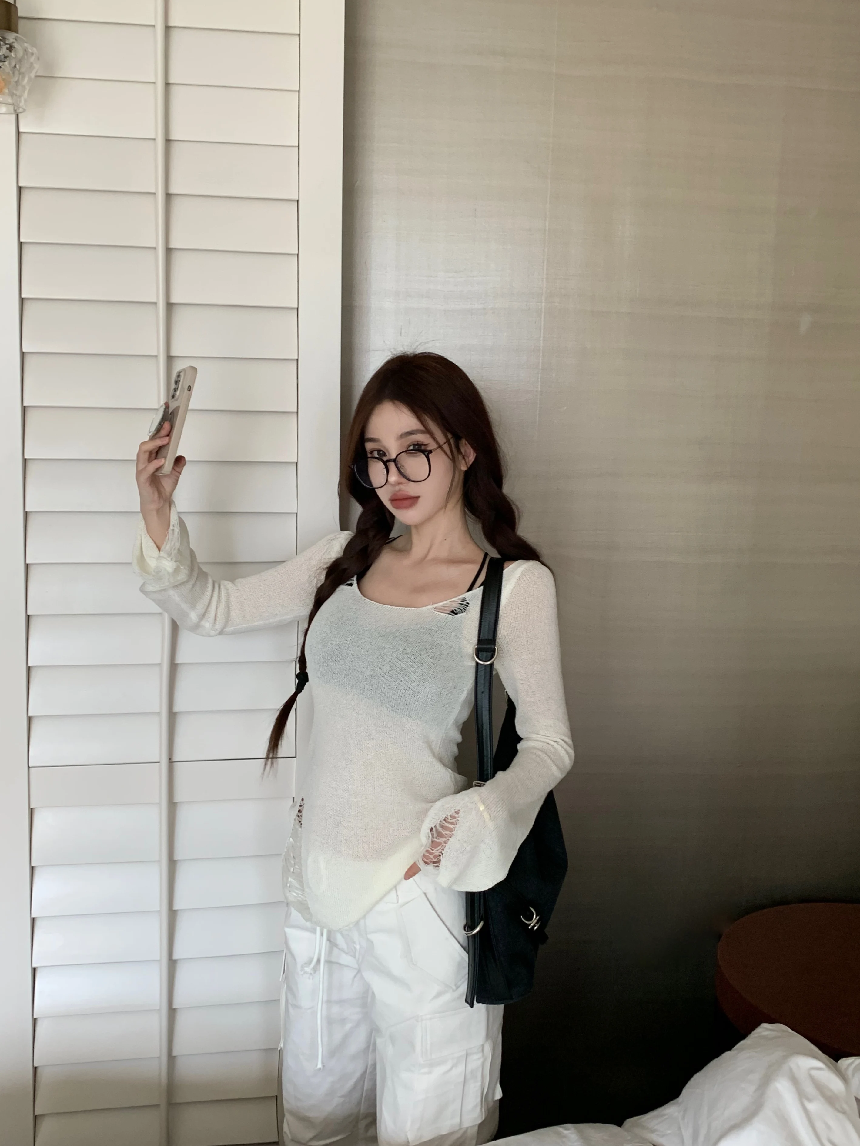 Yipinpay Korean Style Long-sleeved Ripped Thin Knitted Sunscreen Blouse T-shirt Tops With Small Tube Top Fashion Women's Clothing