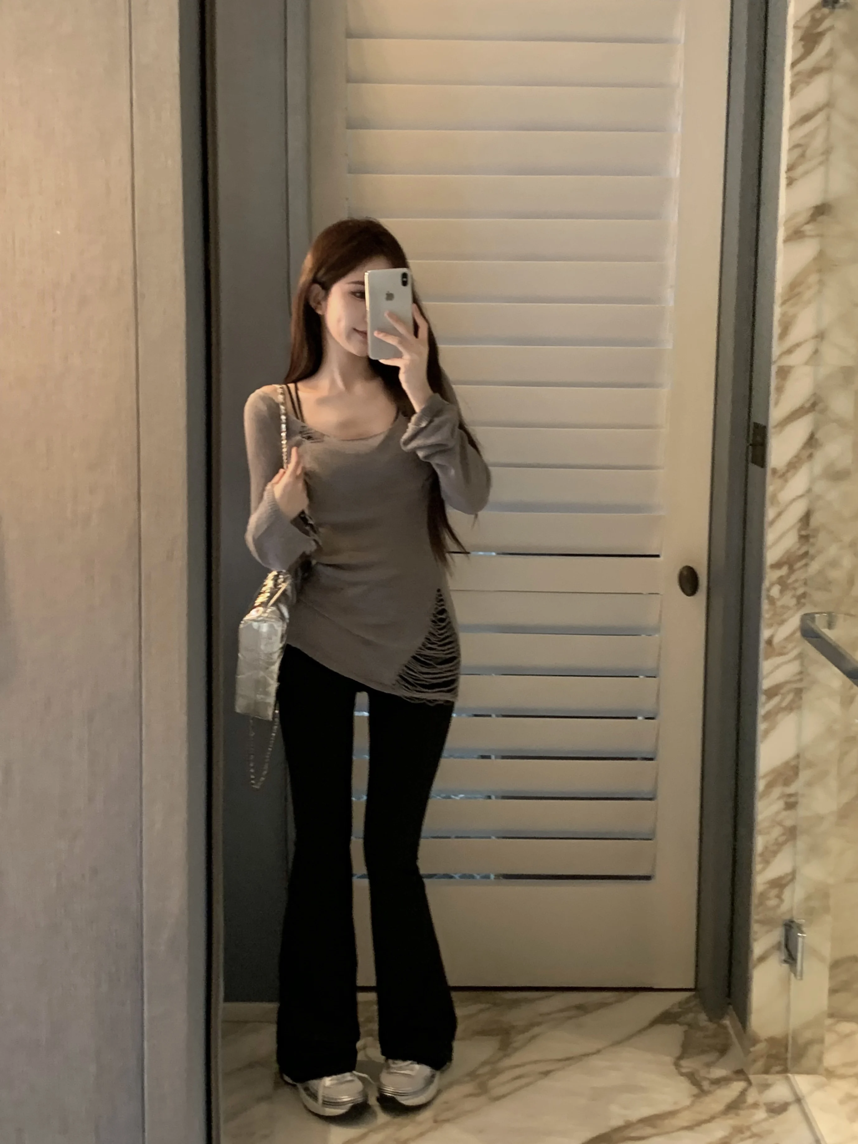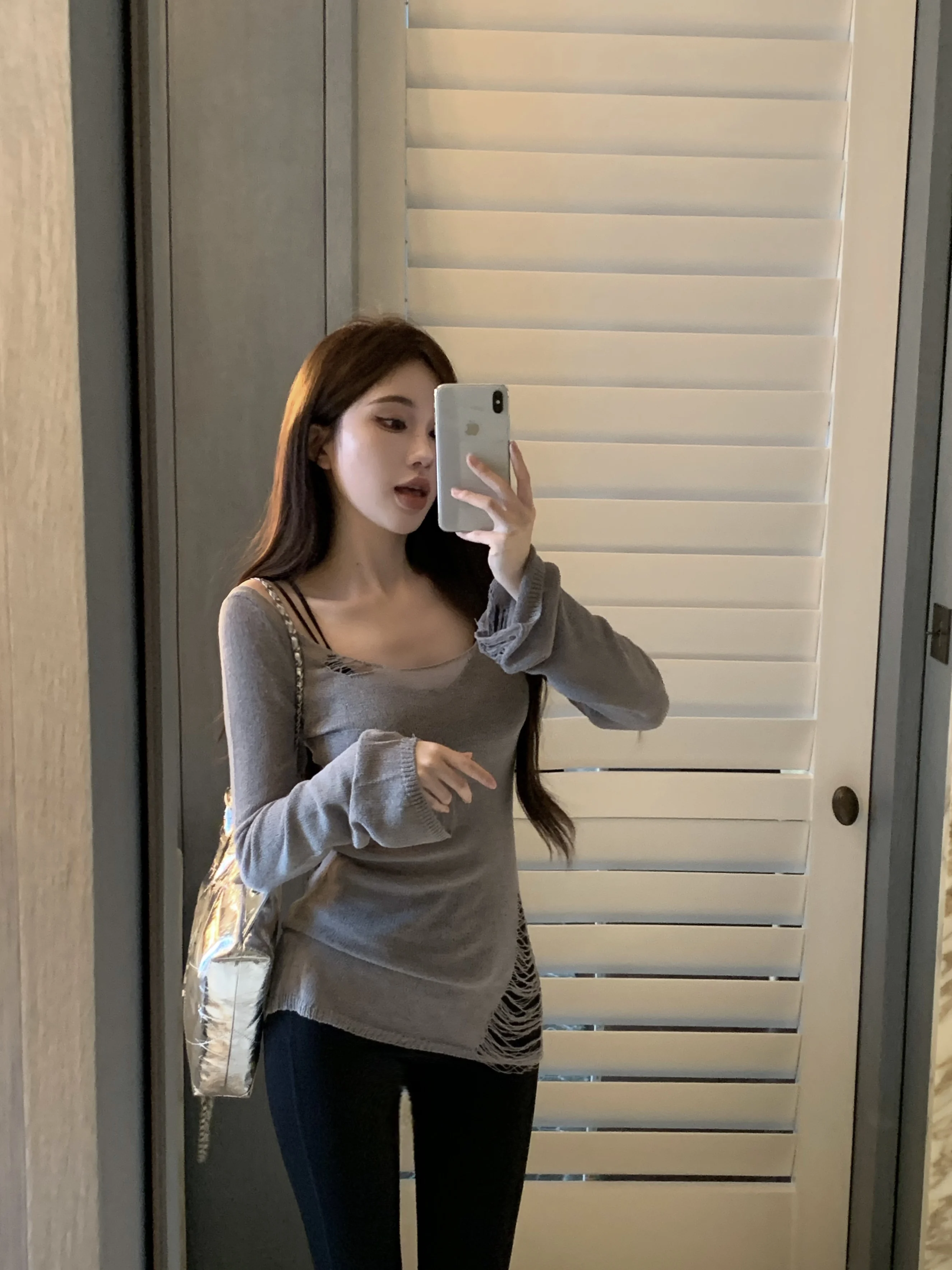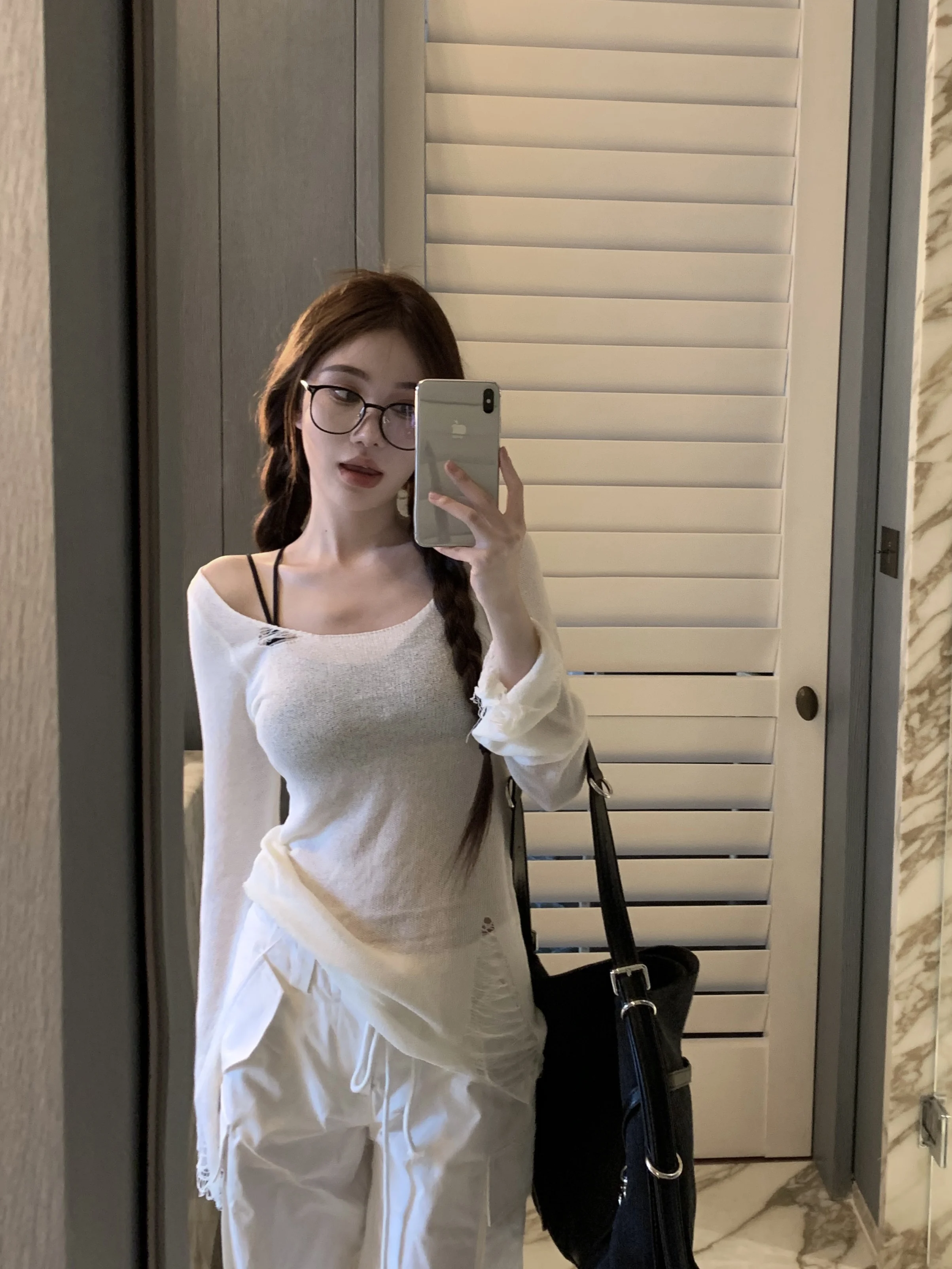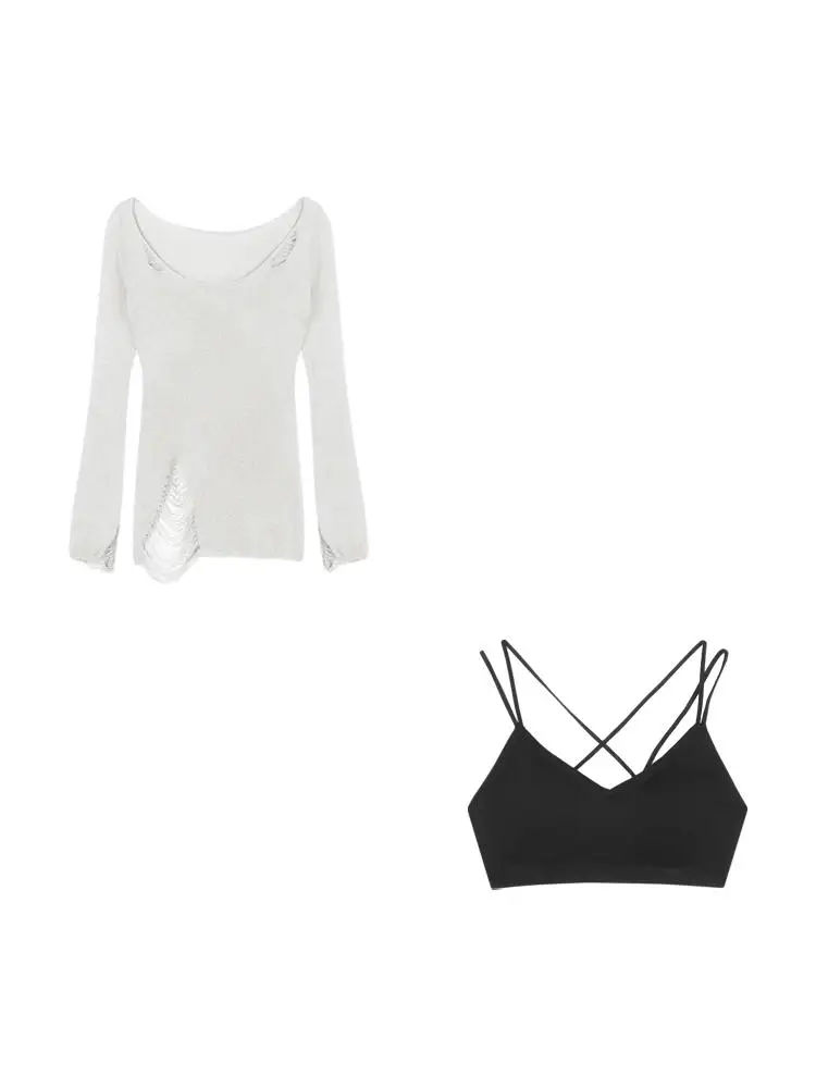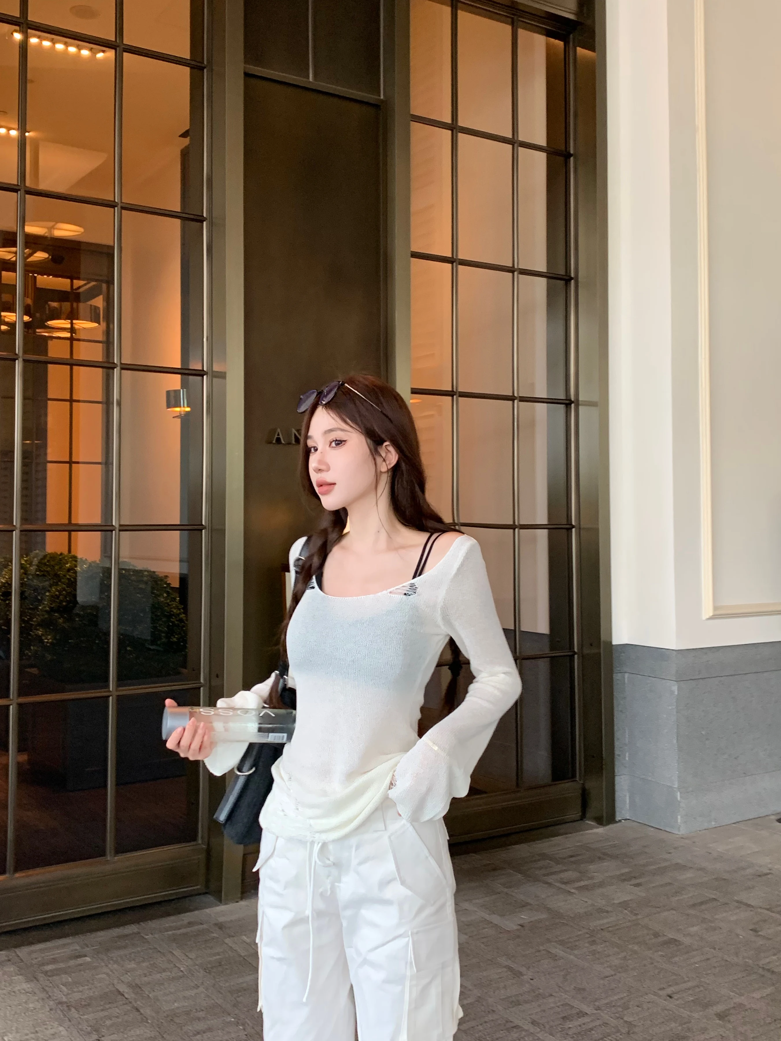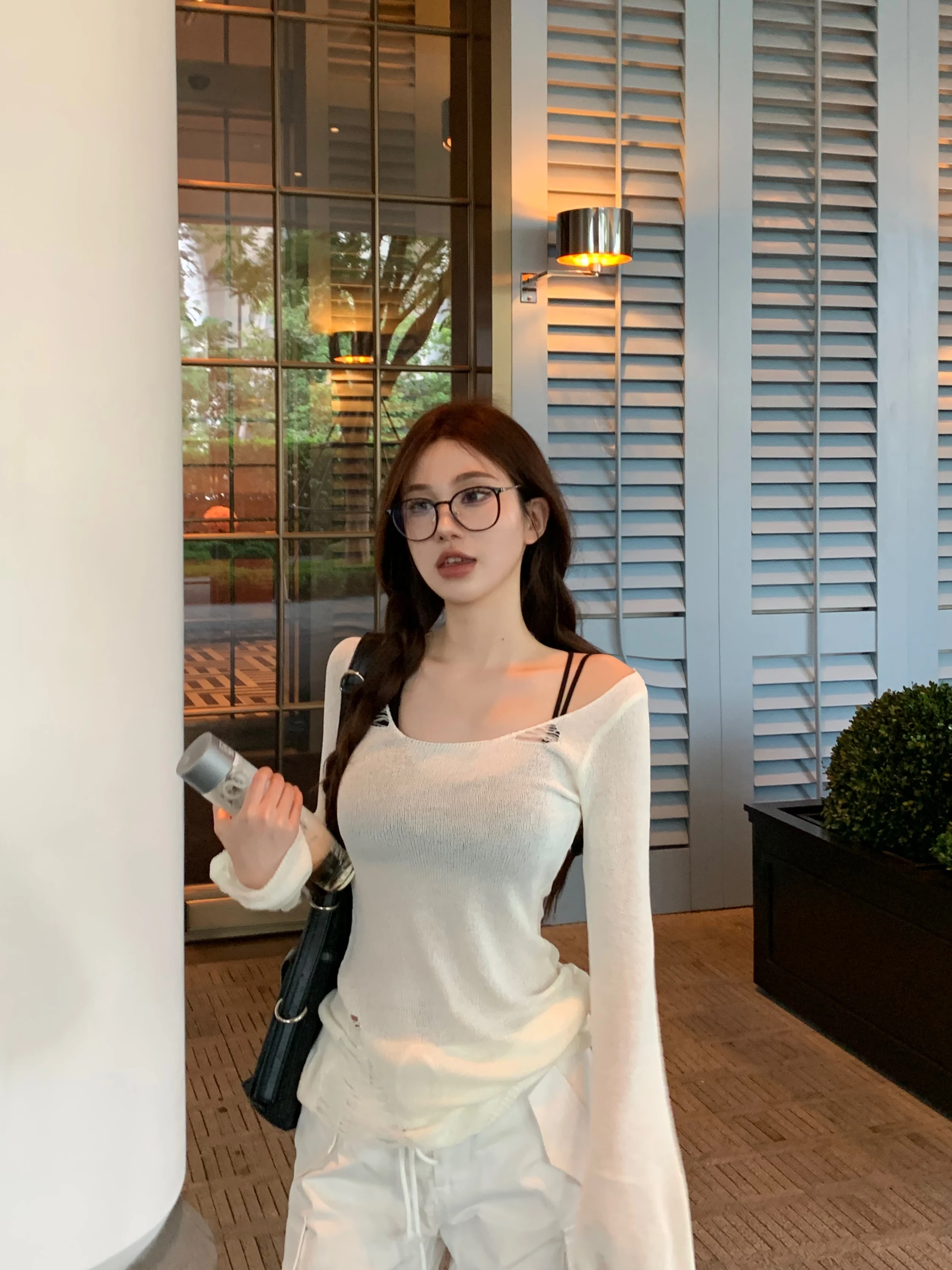 Yipinpay Korean Style Long-sleeved Ripped Thin Knitted Sunscreen Blouse T-shirt Tops With Small Tube Top Fashion Women's Clothing