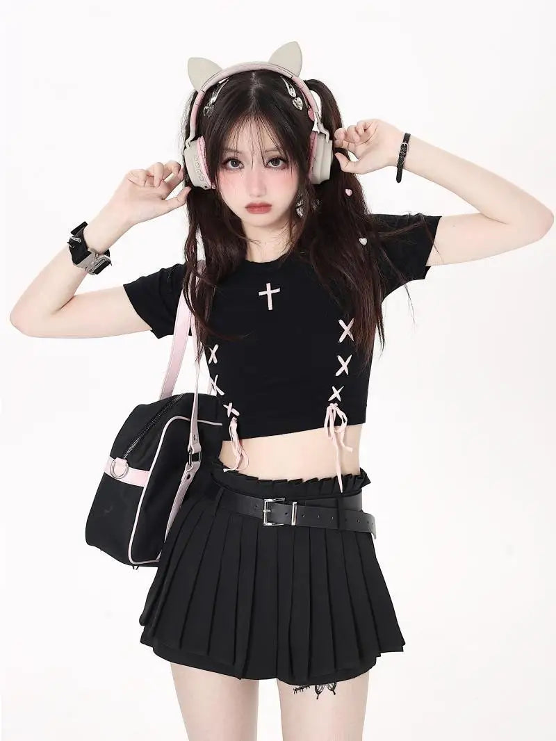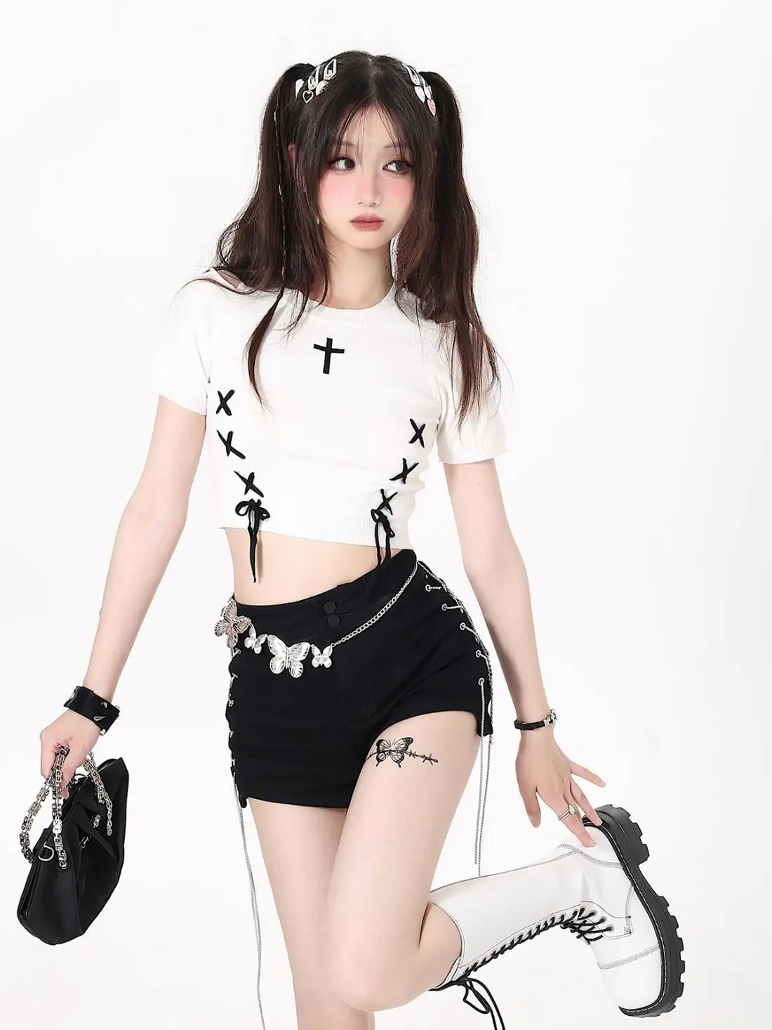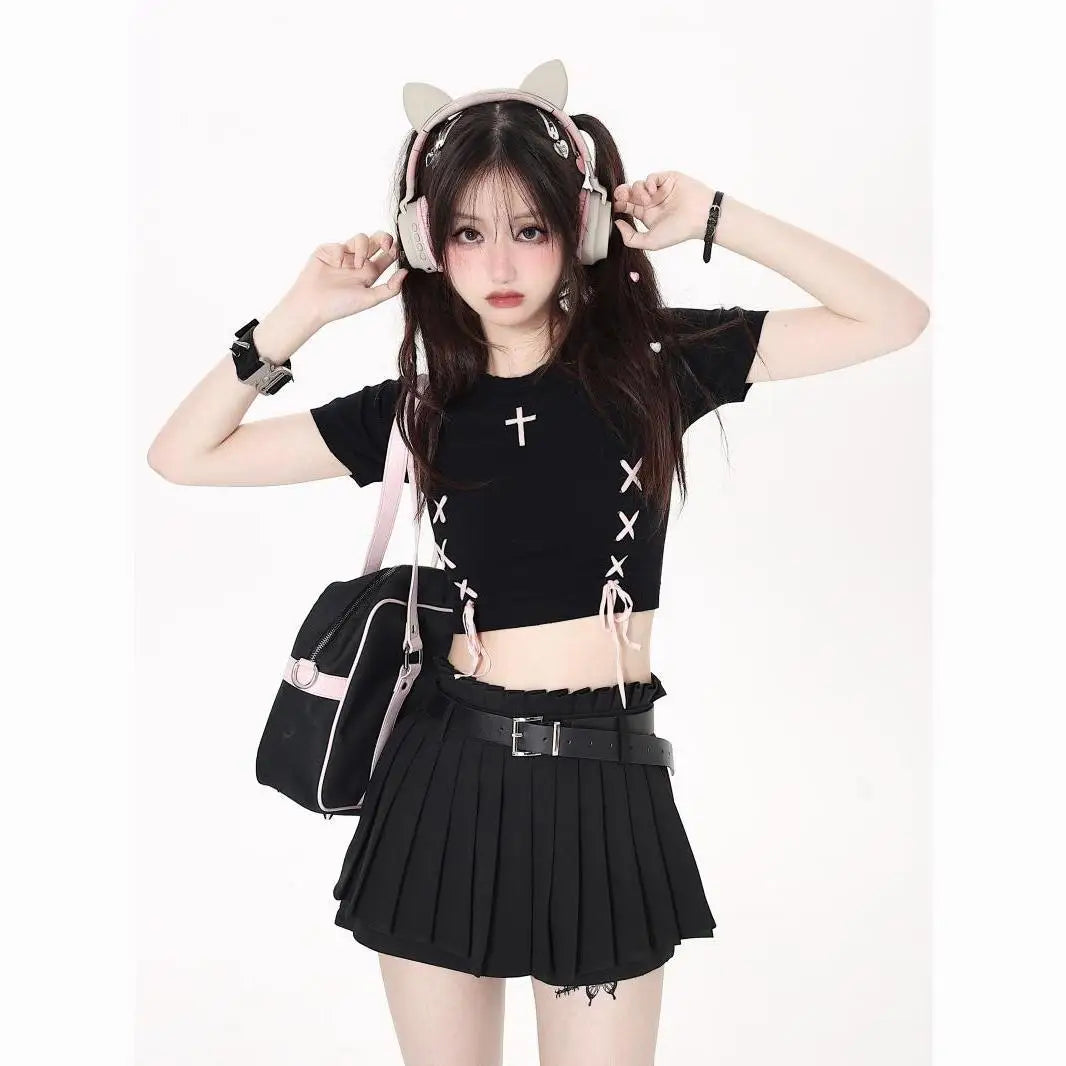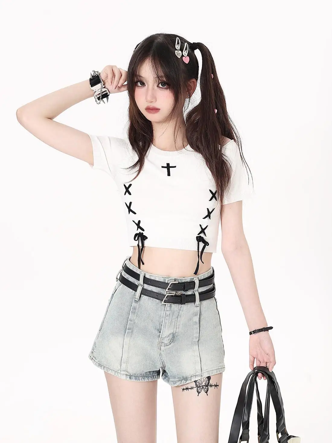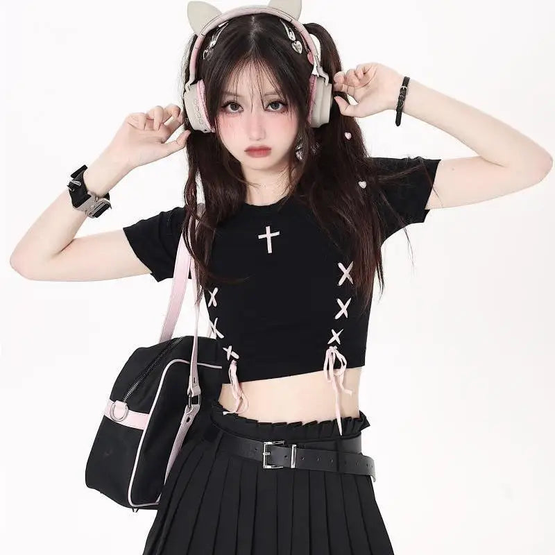 Yipinpay Korean Sweet Spicy Girl Lace up Cross Crop Top for Women Slim Fit Short Sleeve T-shirt Women Summer New Fashion Clothing