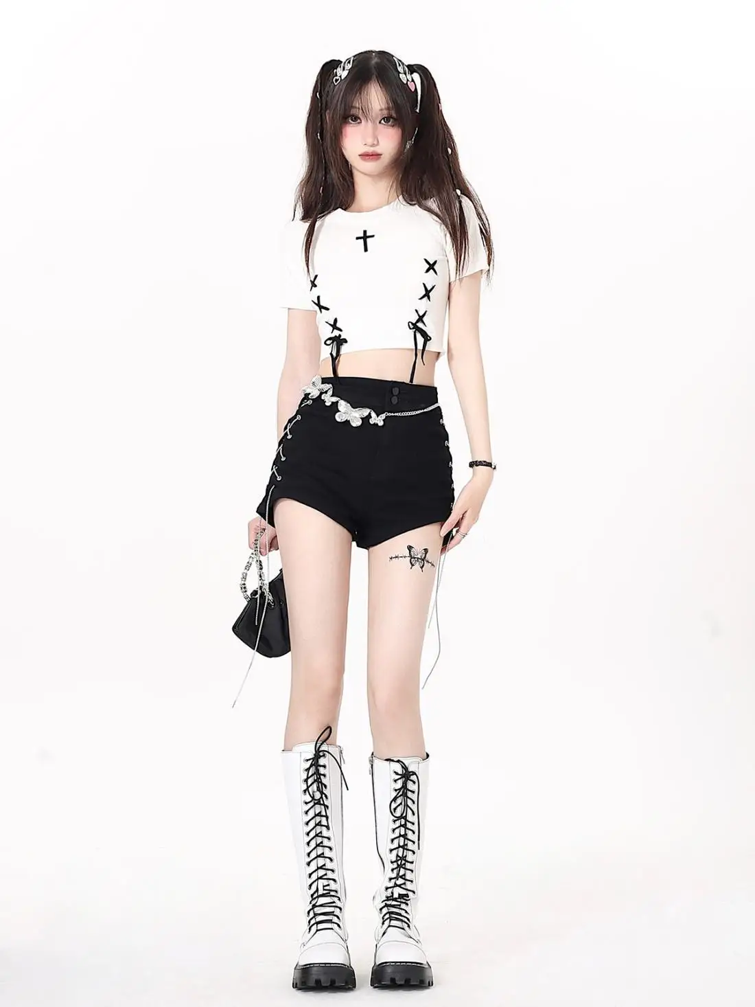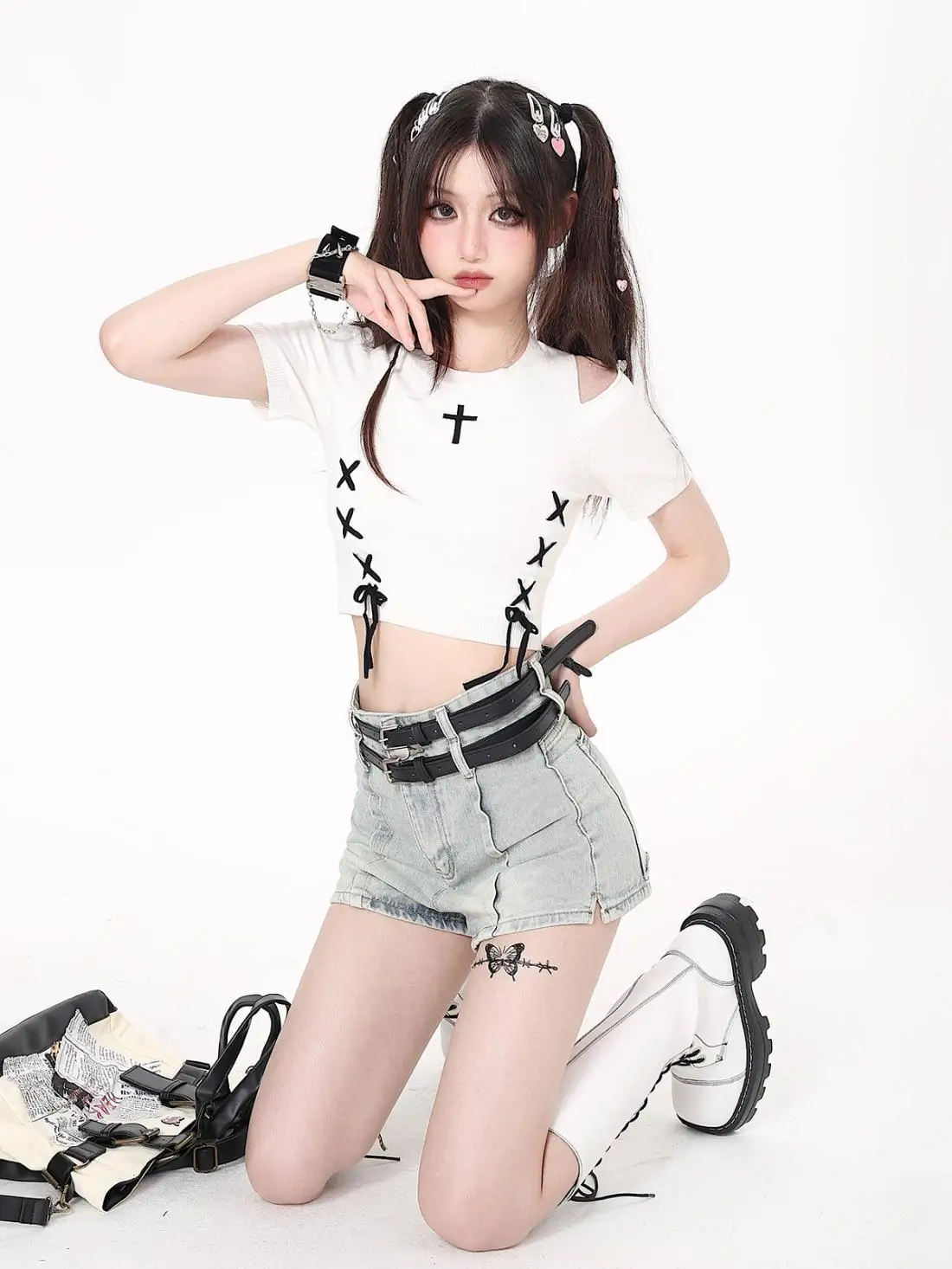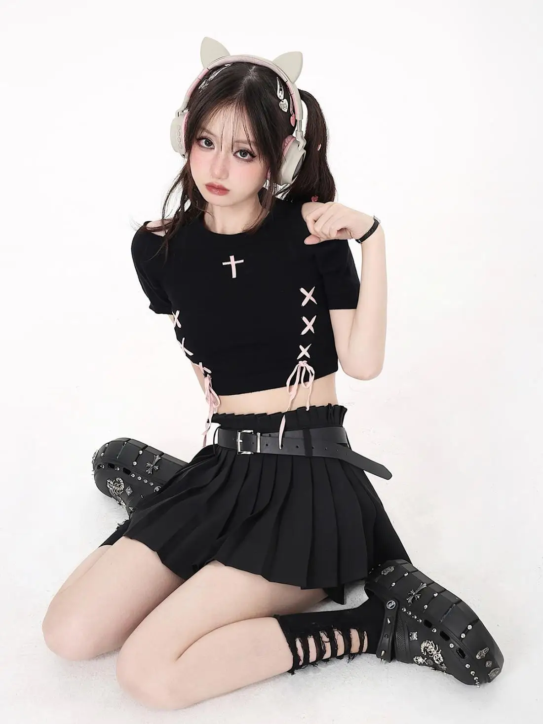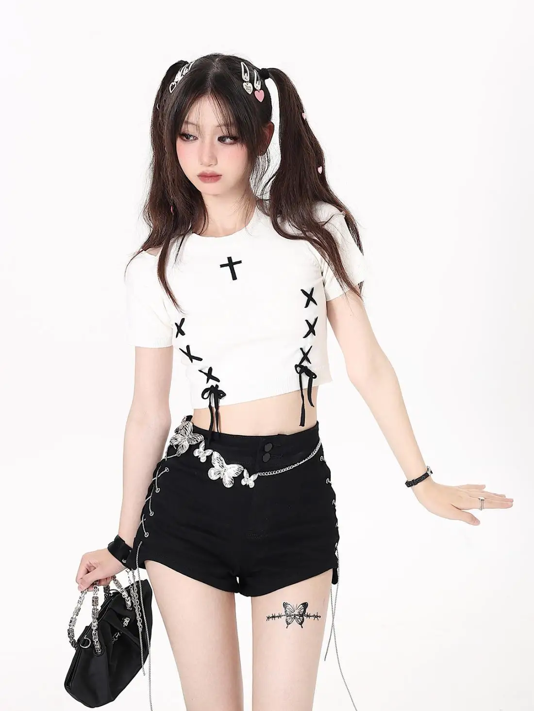 Yipinpay Korean Sweet Spicy Girl Lace up Cross Crop Top for Women Slim Fit Short Sleeve T-shirt Women Summer New Fashion Clothing