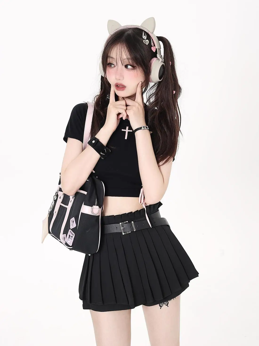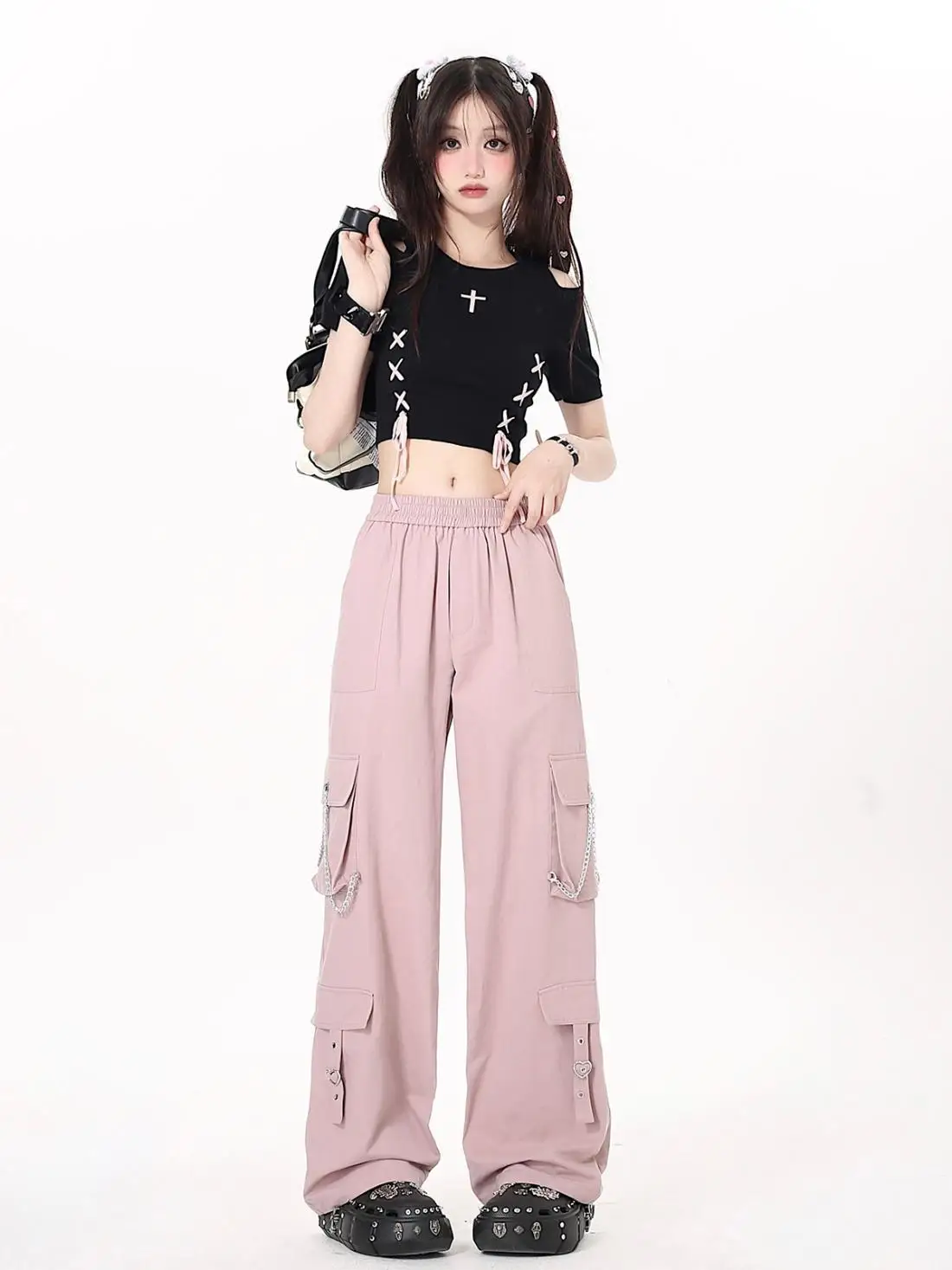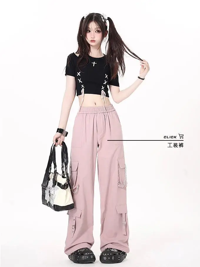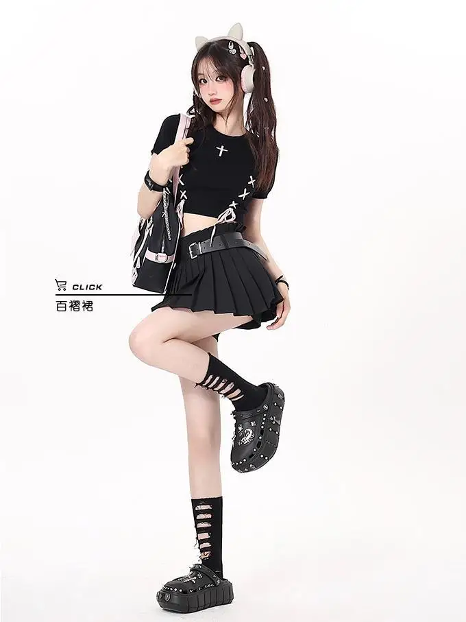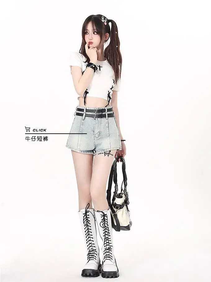 Yipinpay Korean Sweet Spicy Girl Lace up Cross Crop Top for Women Slim Fit Short Sleeve T-shirt Women Summer New Fashion Clothing