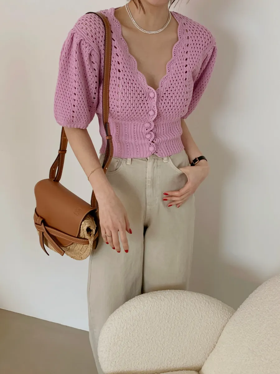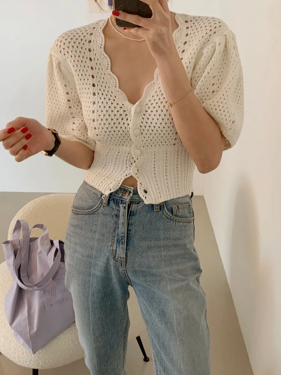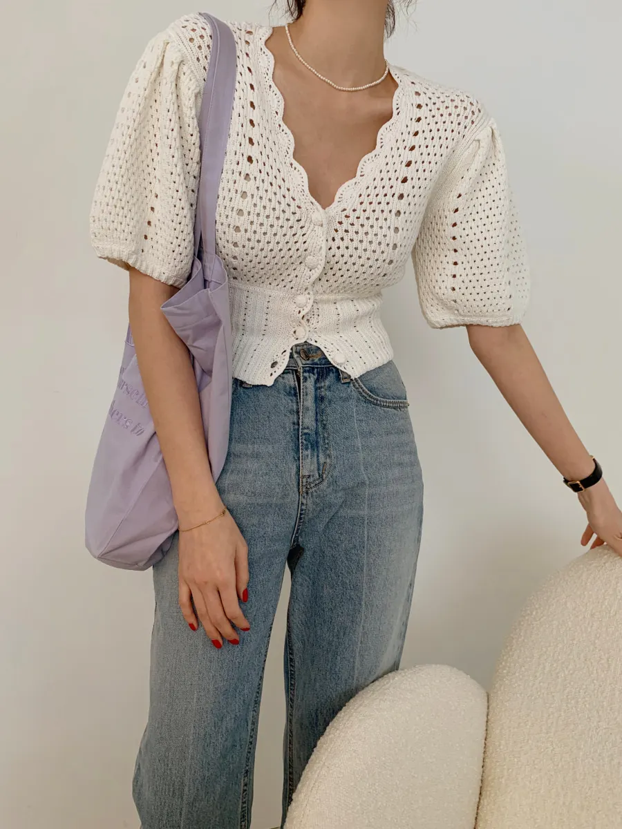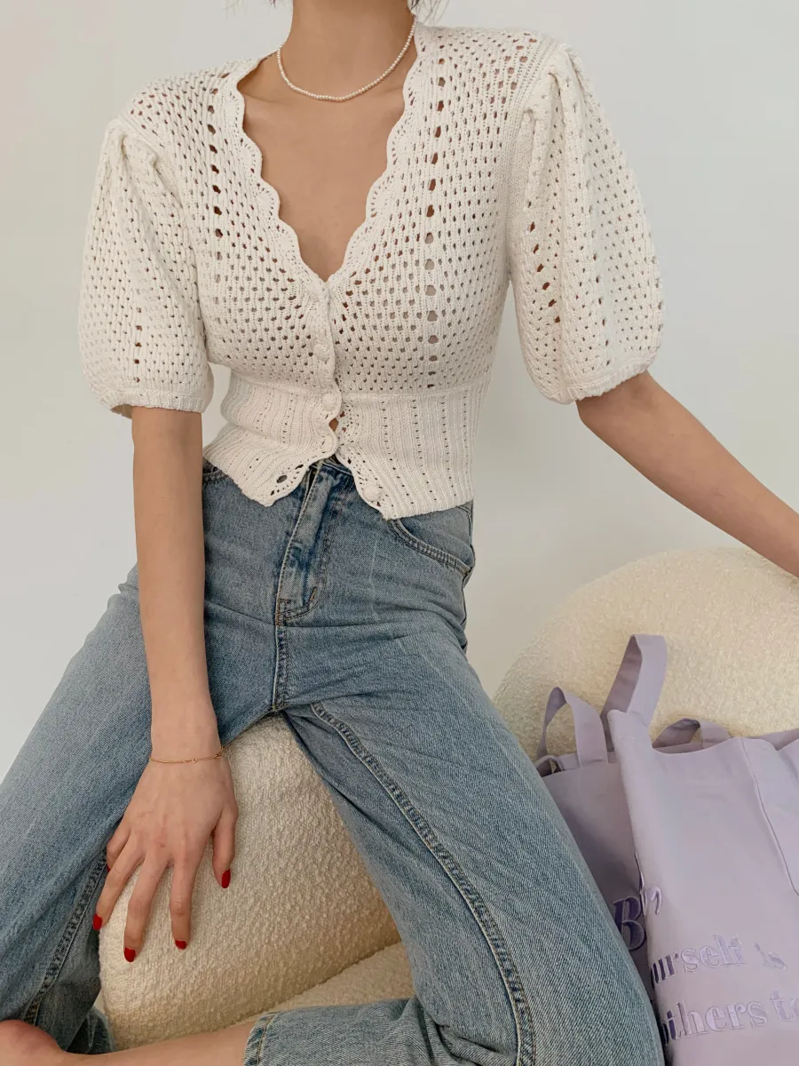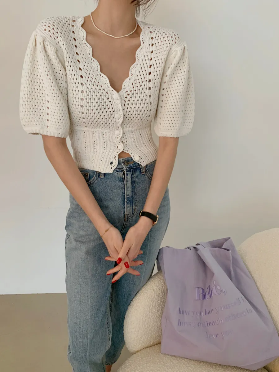 Yipinpay Korean V Neck Crop Top Puff Short Sleeve Sweater Mujer Summer Cardigan Knitted Cropped Cardigan Sueters Hollow Sweet