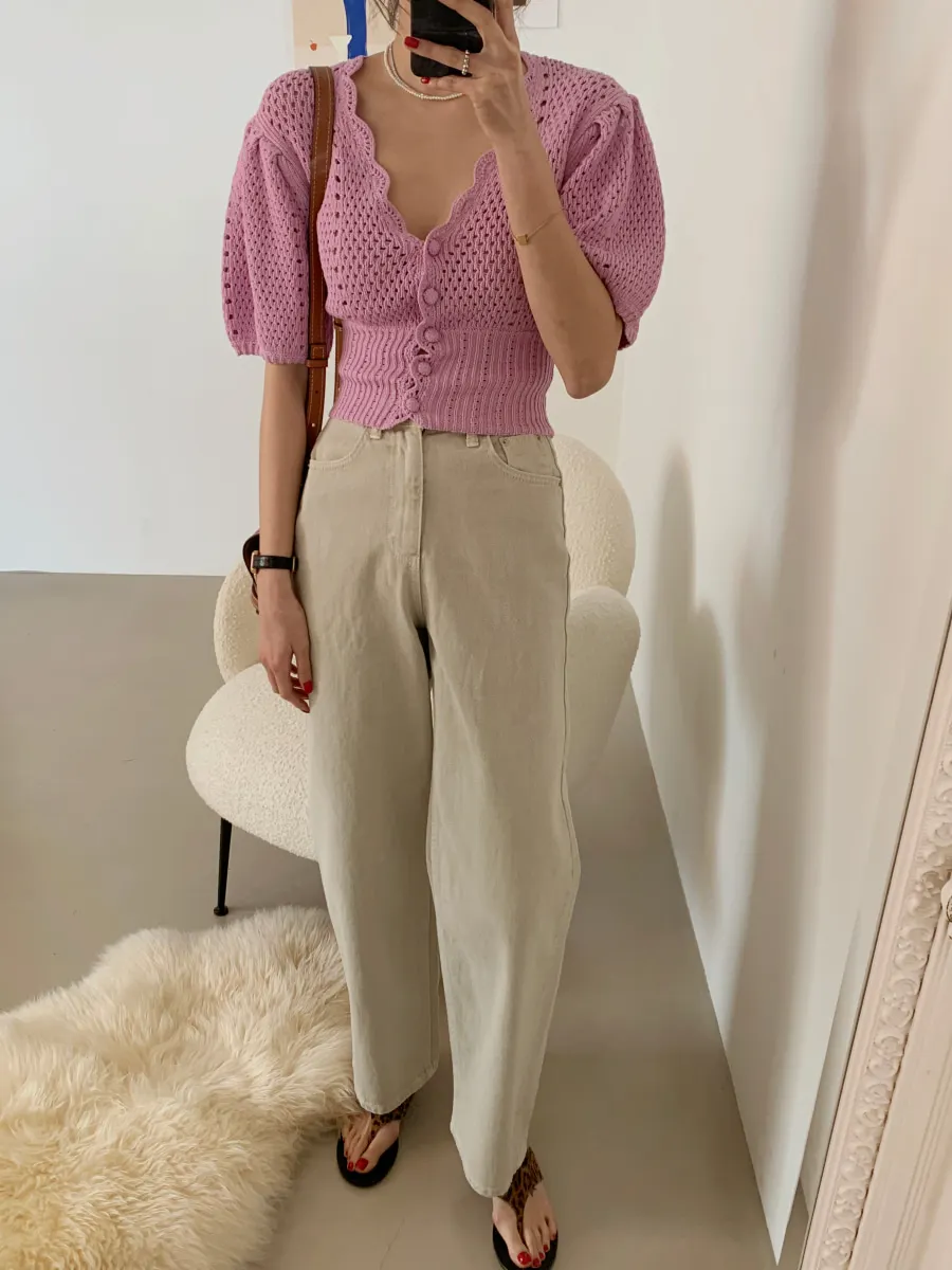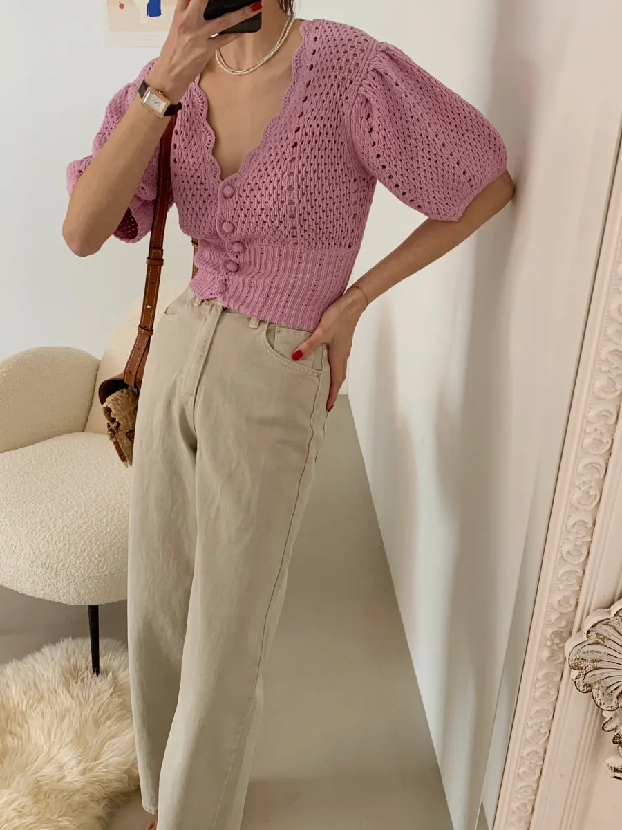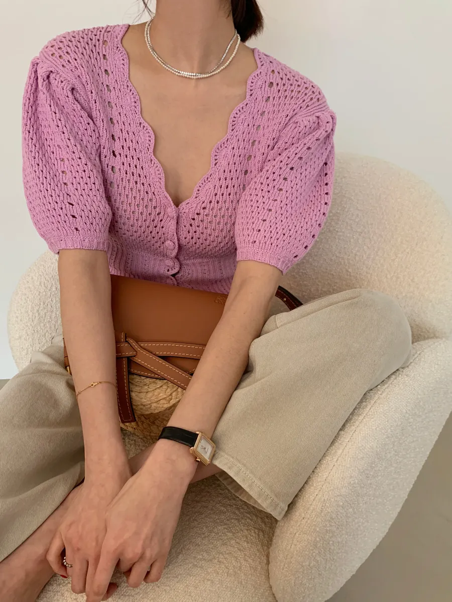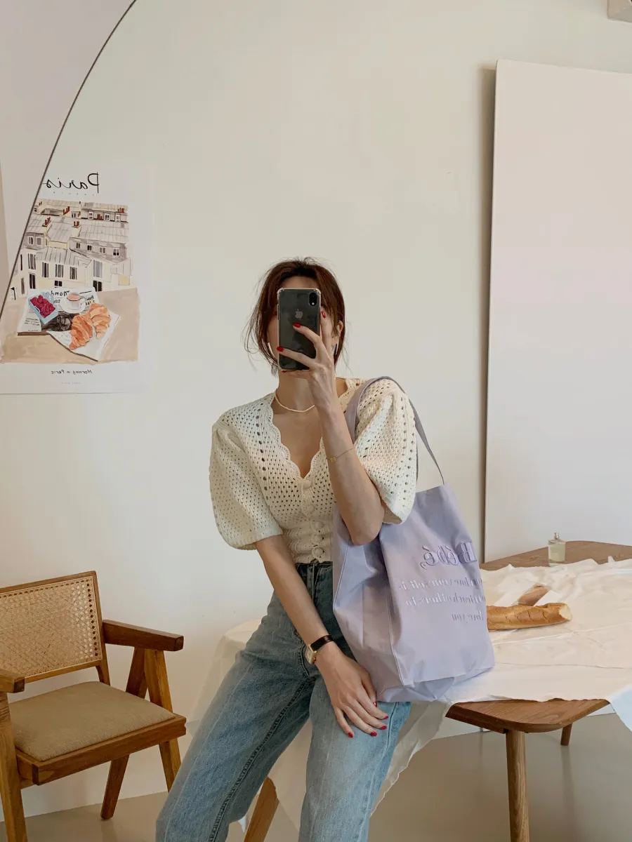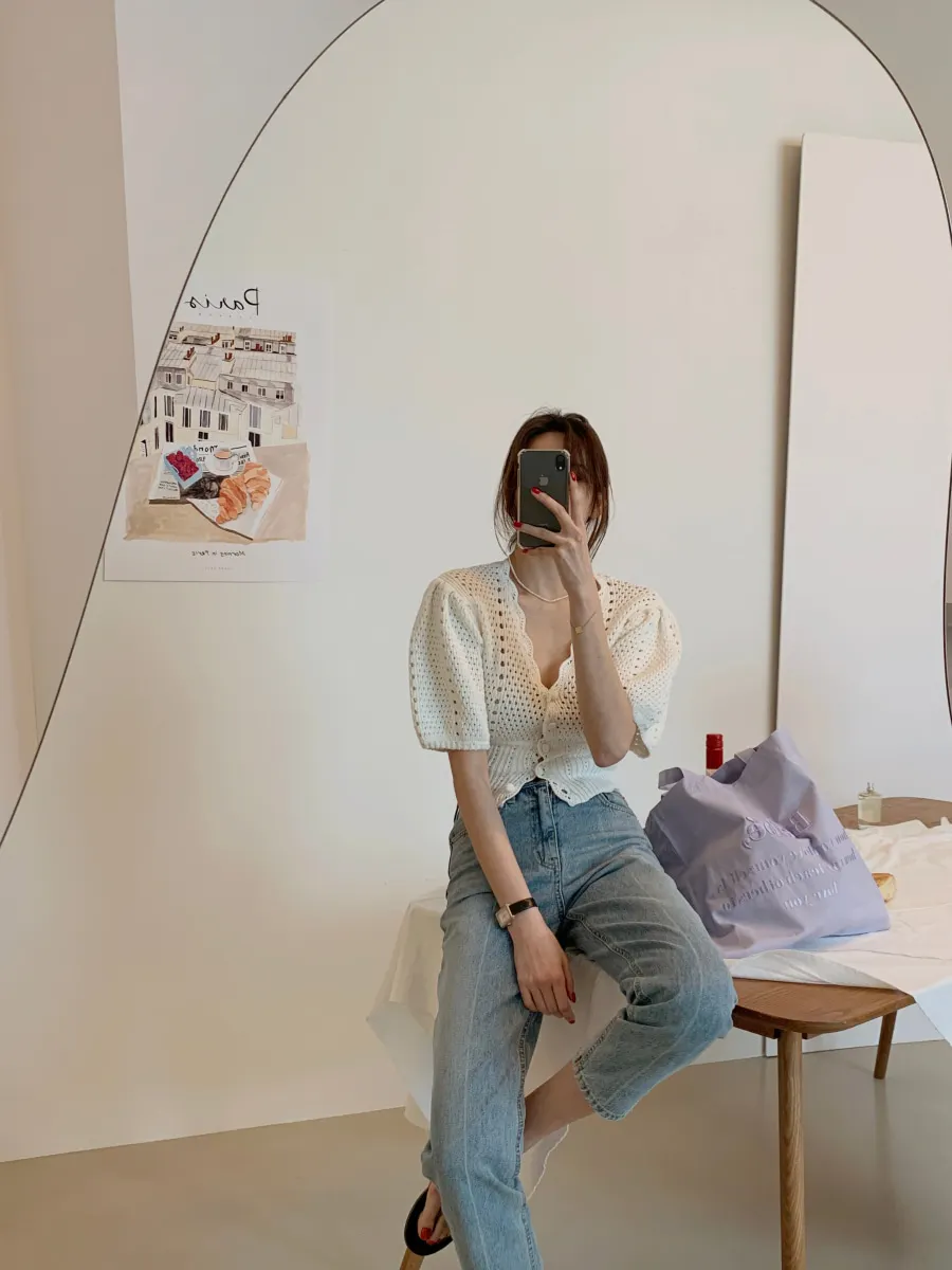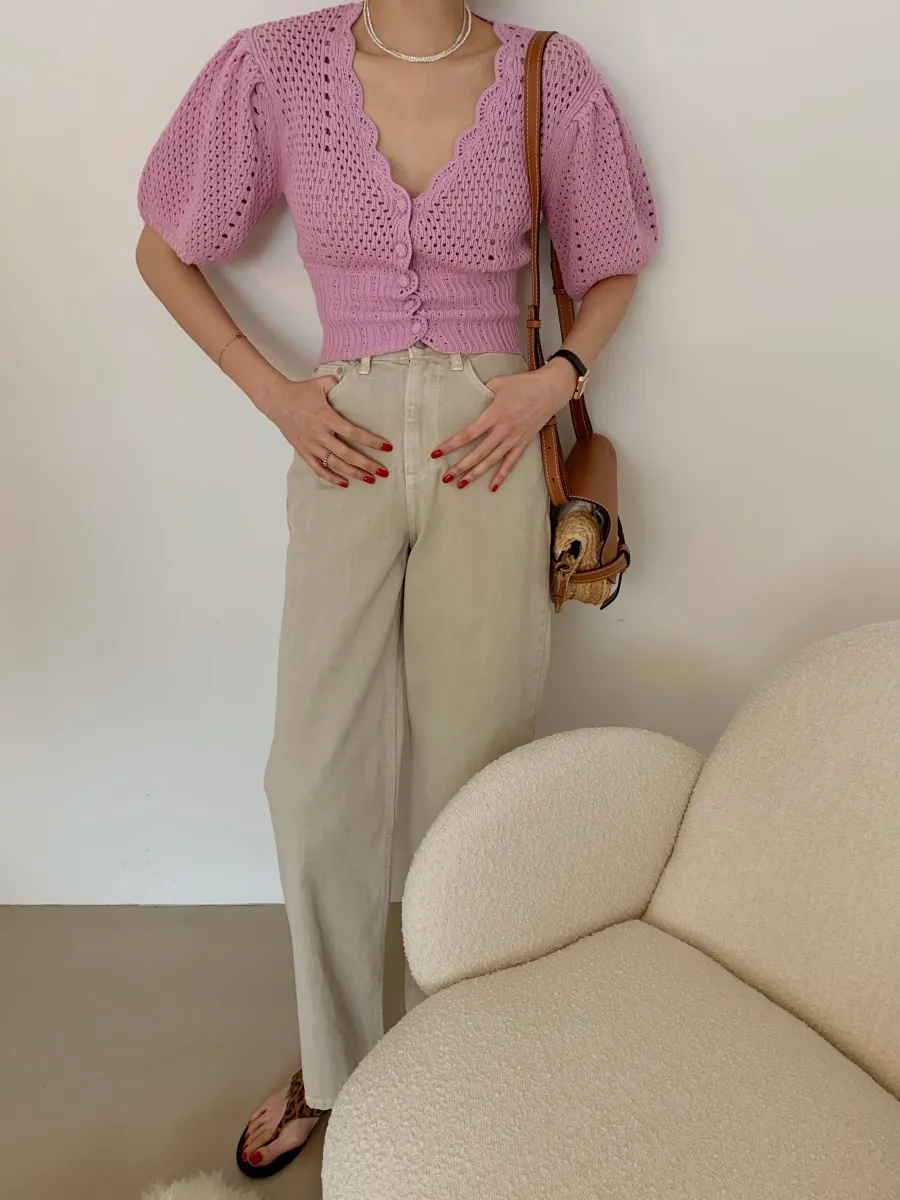 Yipinpay Korean V Neck Crop Top Puff Short Sleeve Sweater Mujer Summer Cardigan Knitted Cropped Cardigan Sueters Hollow Sweet