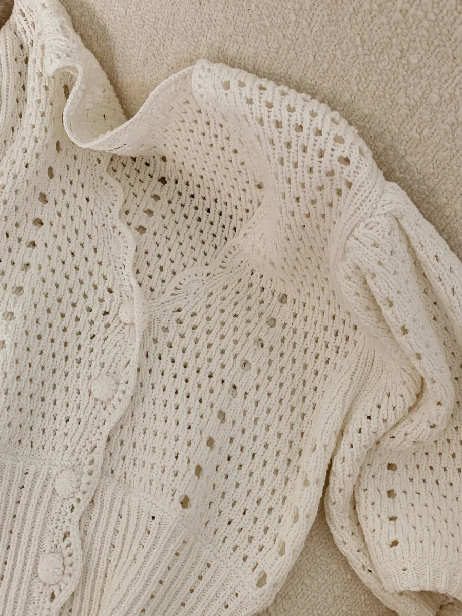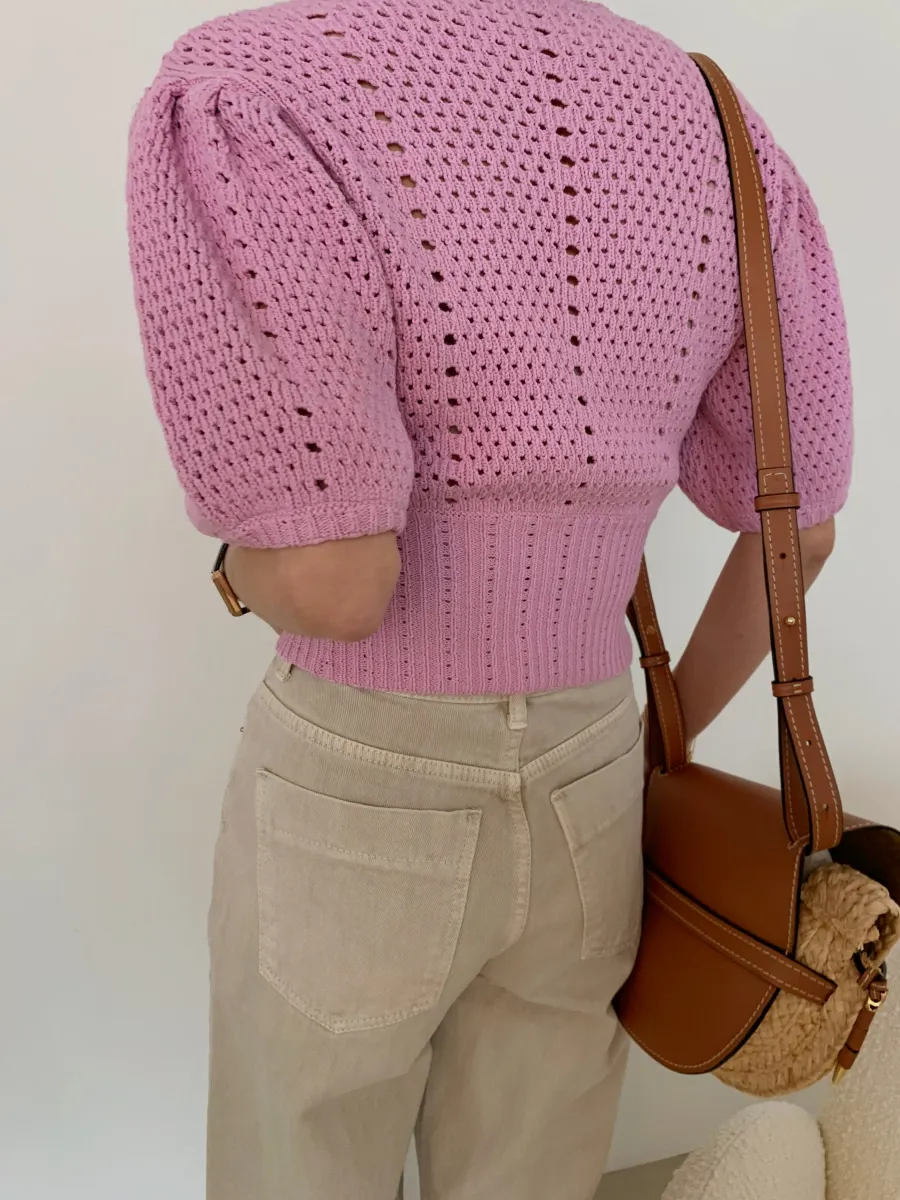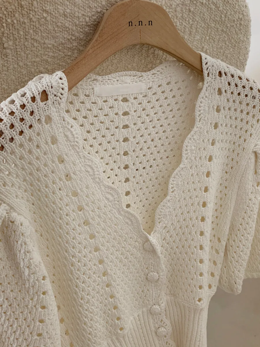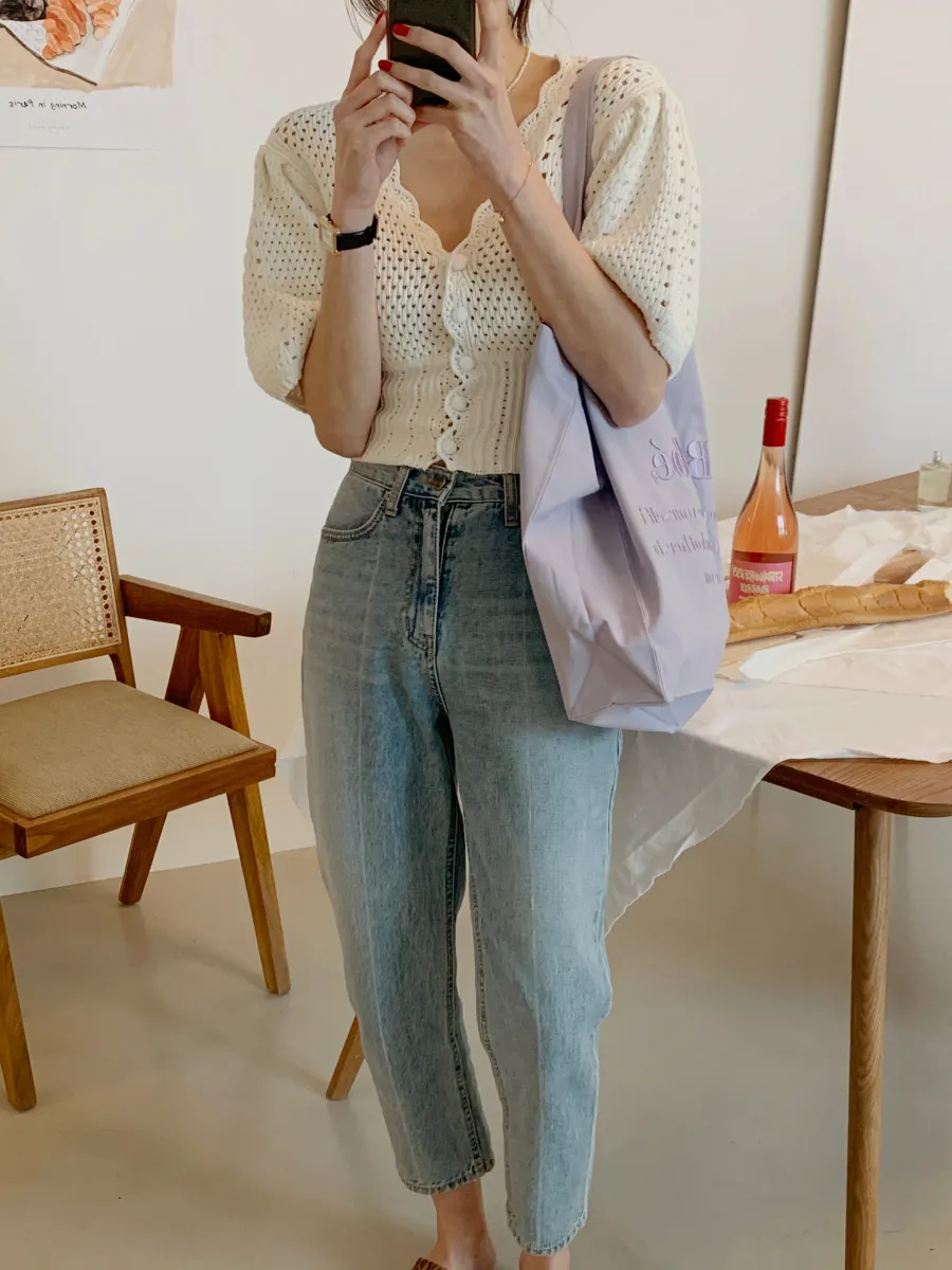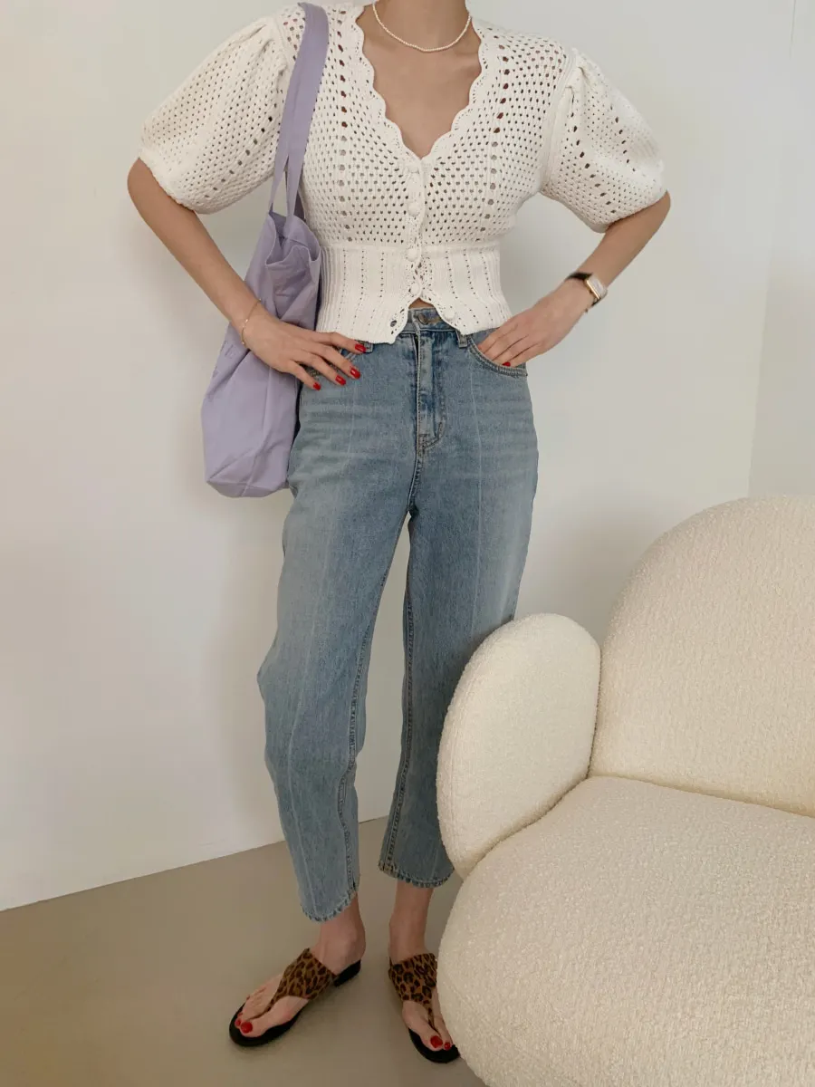 Yipinpay Korean V Neck Crop Top Puff Short Sleeve Sweater Mujer Summer Cardigan Knitted Cropped Cardigan Sueters Hollow Sweet