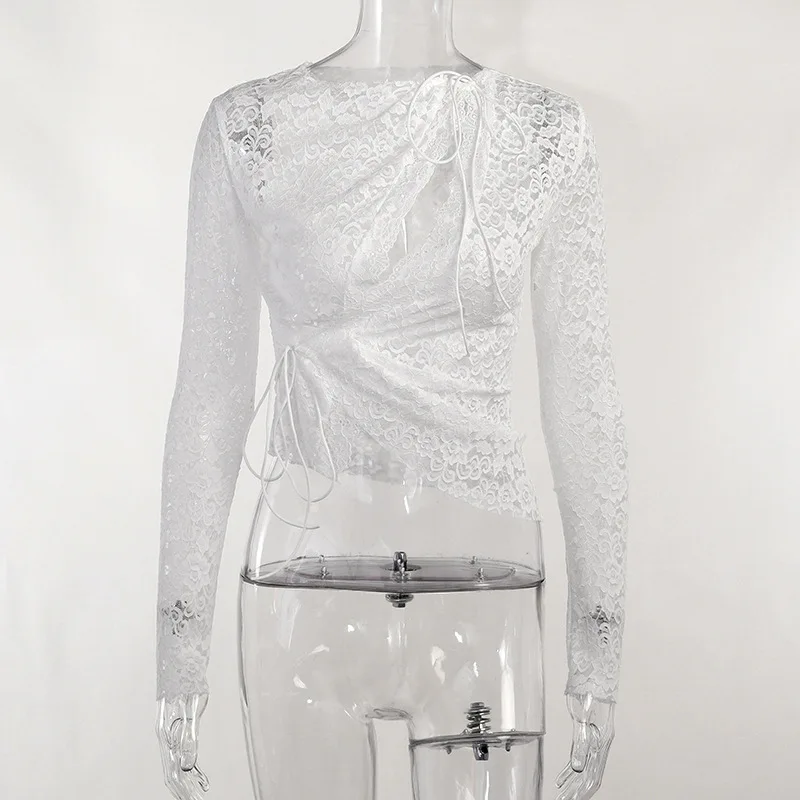Yipinpay Lace Hollow Out Printed T-shirt Cardigan For Women See-Through Sexy Inner Crop top Patchwork Lace-Up Elegant Y2k Top 2024