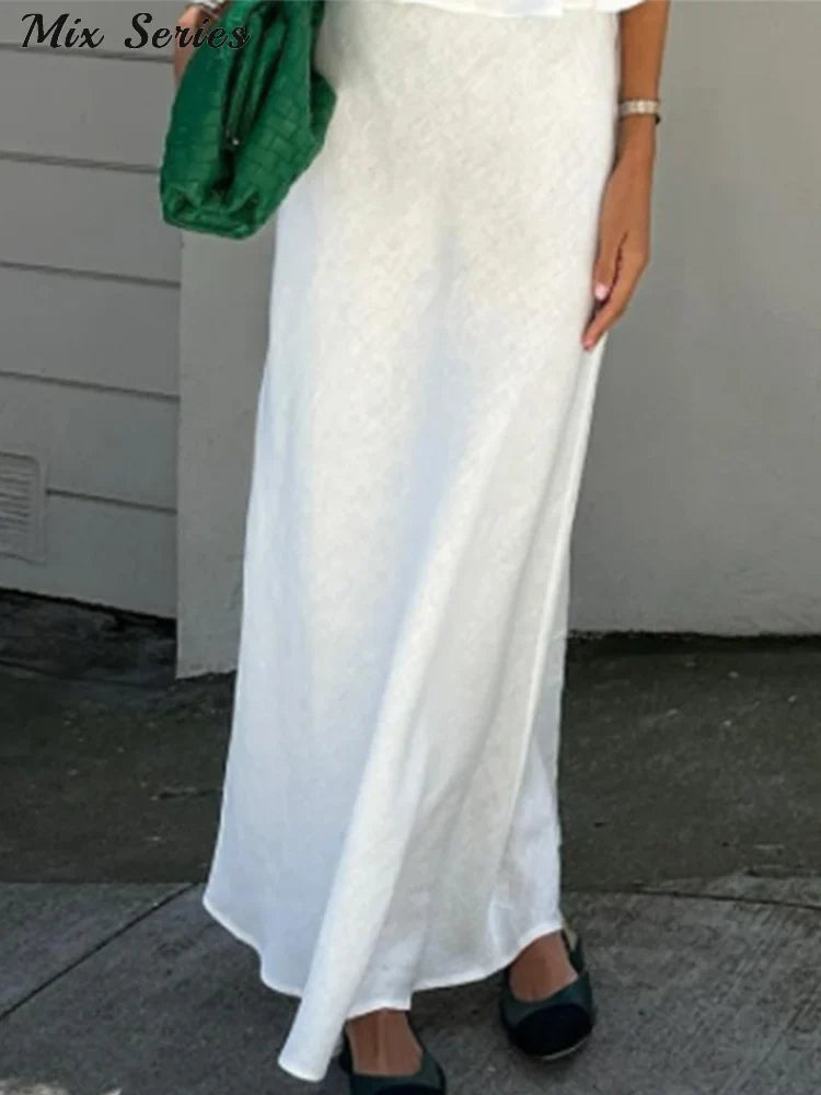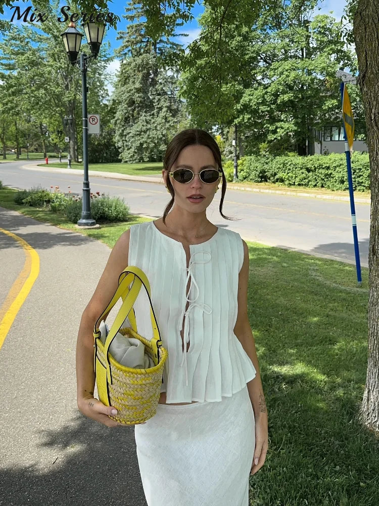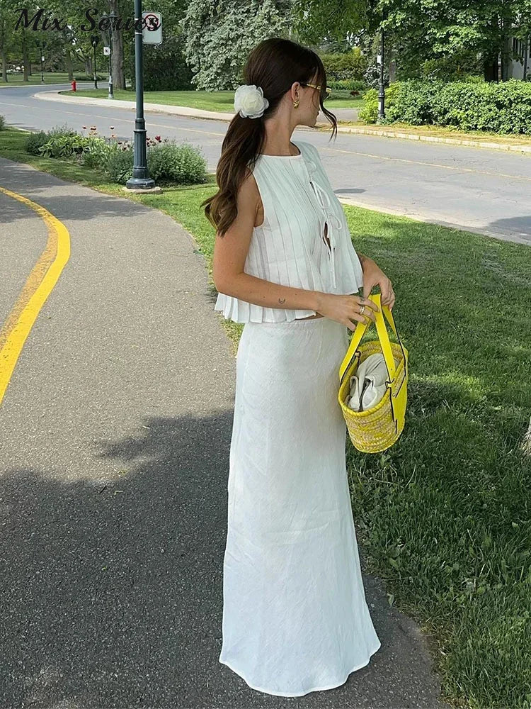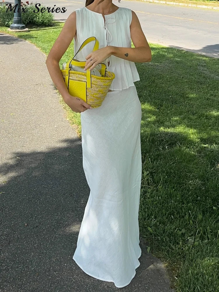 Yipinpay Lace-up Tank Top Skirts Set Women Sleeveless O-neck Ruffles Shirt Long Skirt 2024 Summer New Chic Lady Elegant Outfits