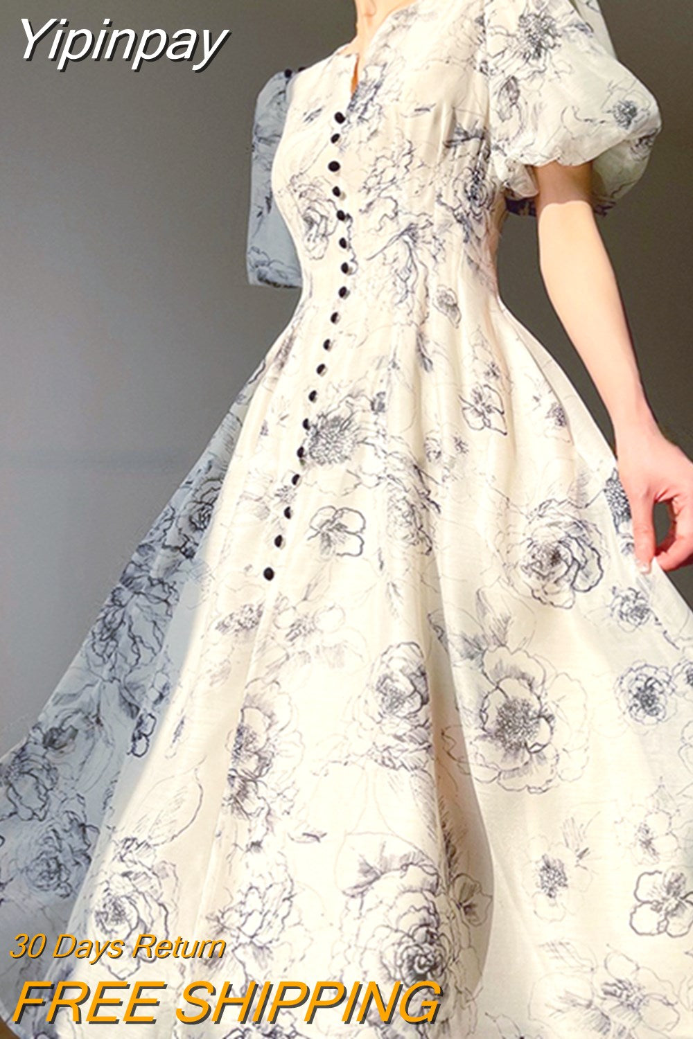 Yipinpay Lady Elegant Floral Midi Dress Formal One Piece Dress Korean Party Beach Long Sleeve Casual Dress Woman 2023 Summer Chic