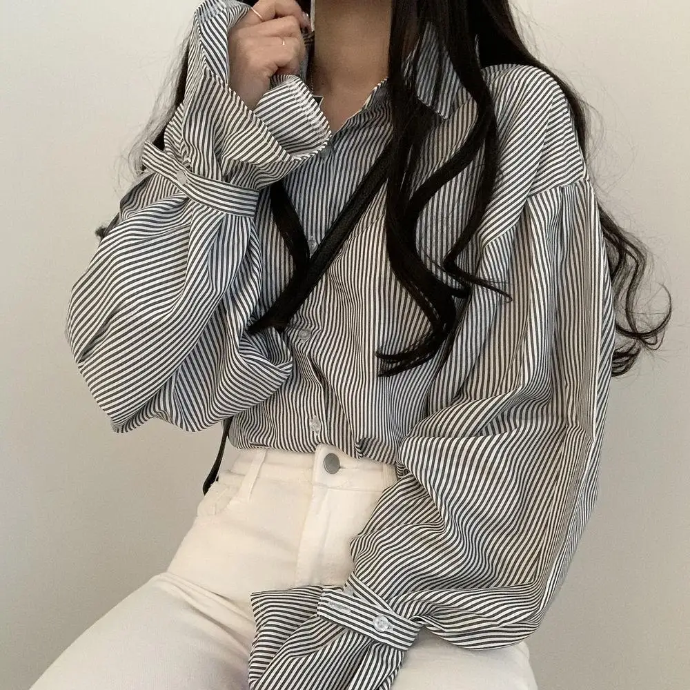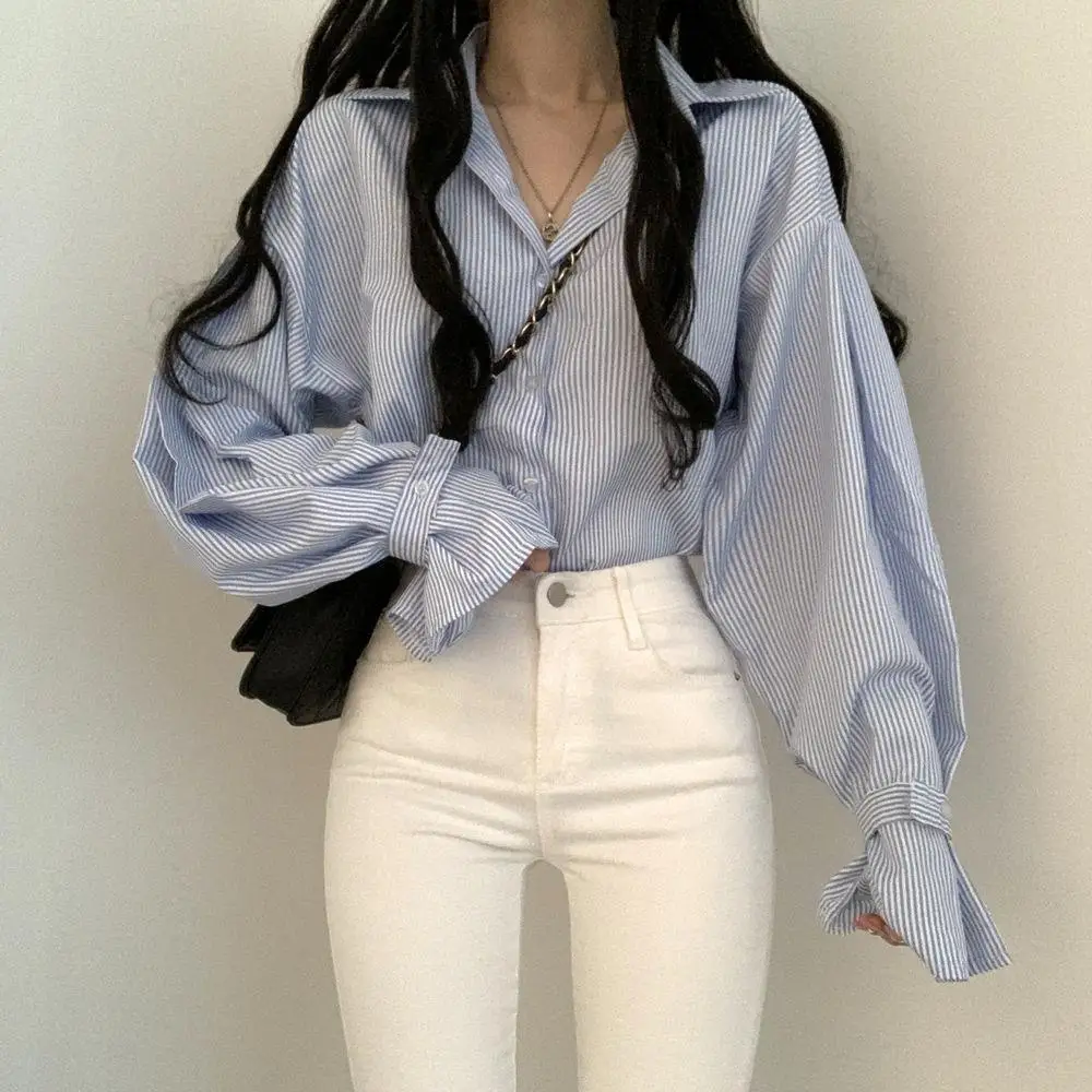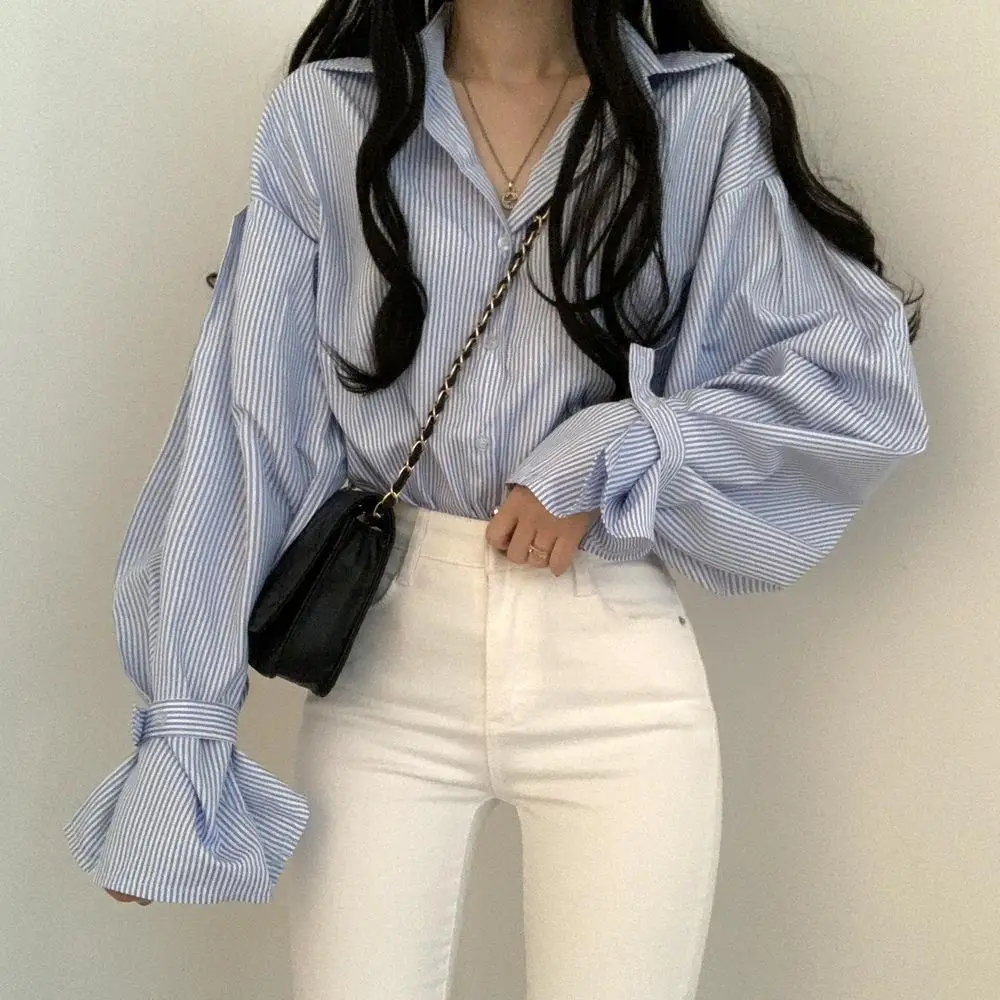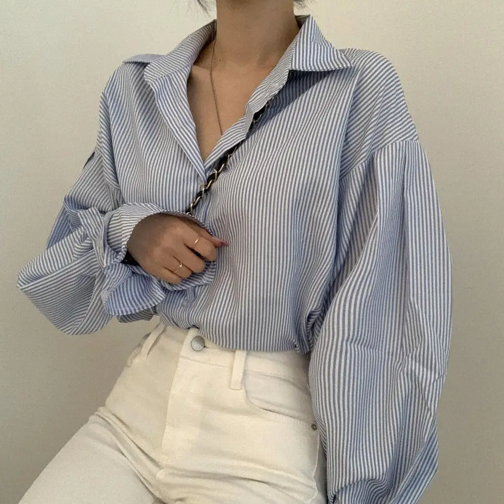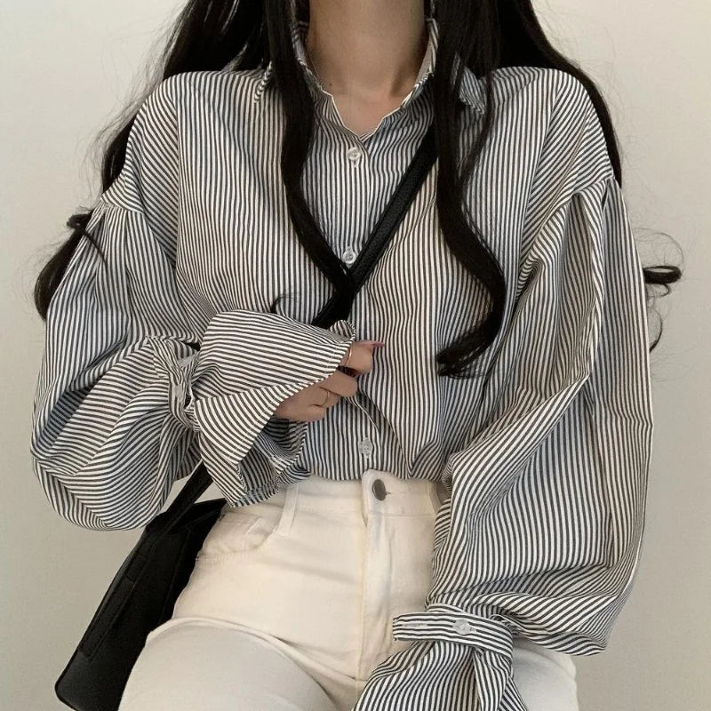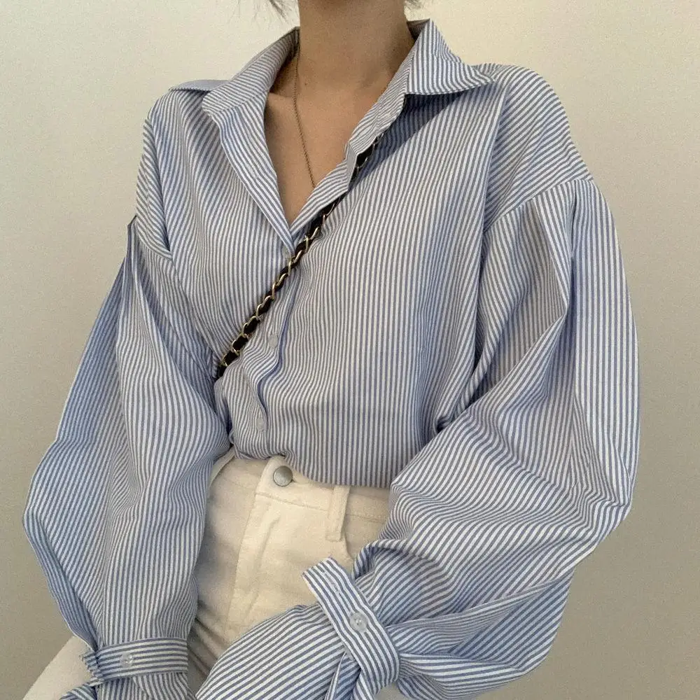 Yipinpay Lantern Sleeve Blue Stripe Shirt Camisas Blusas Mujer Loose Casual Black Top Women's Clothing Blouses Office Lady Shirts