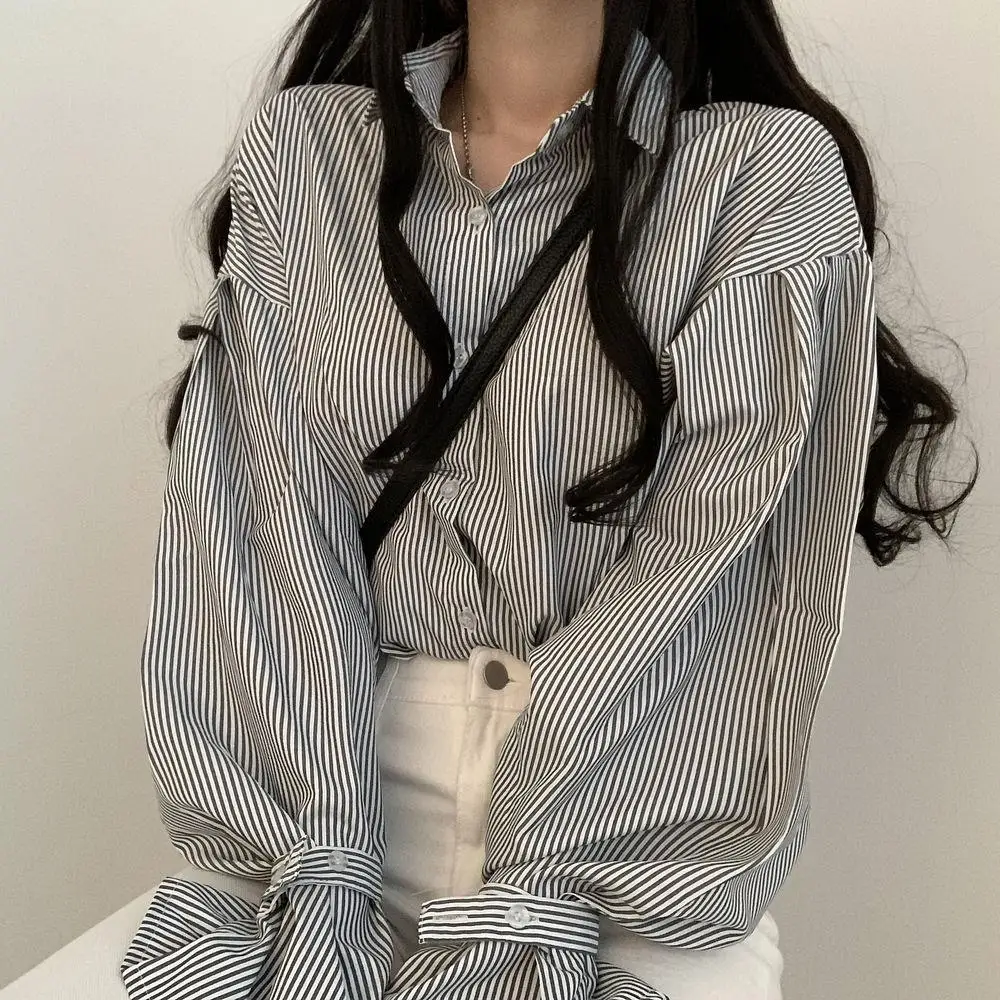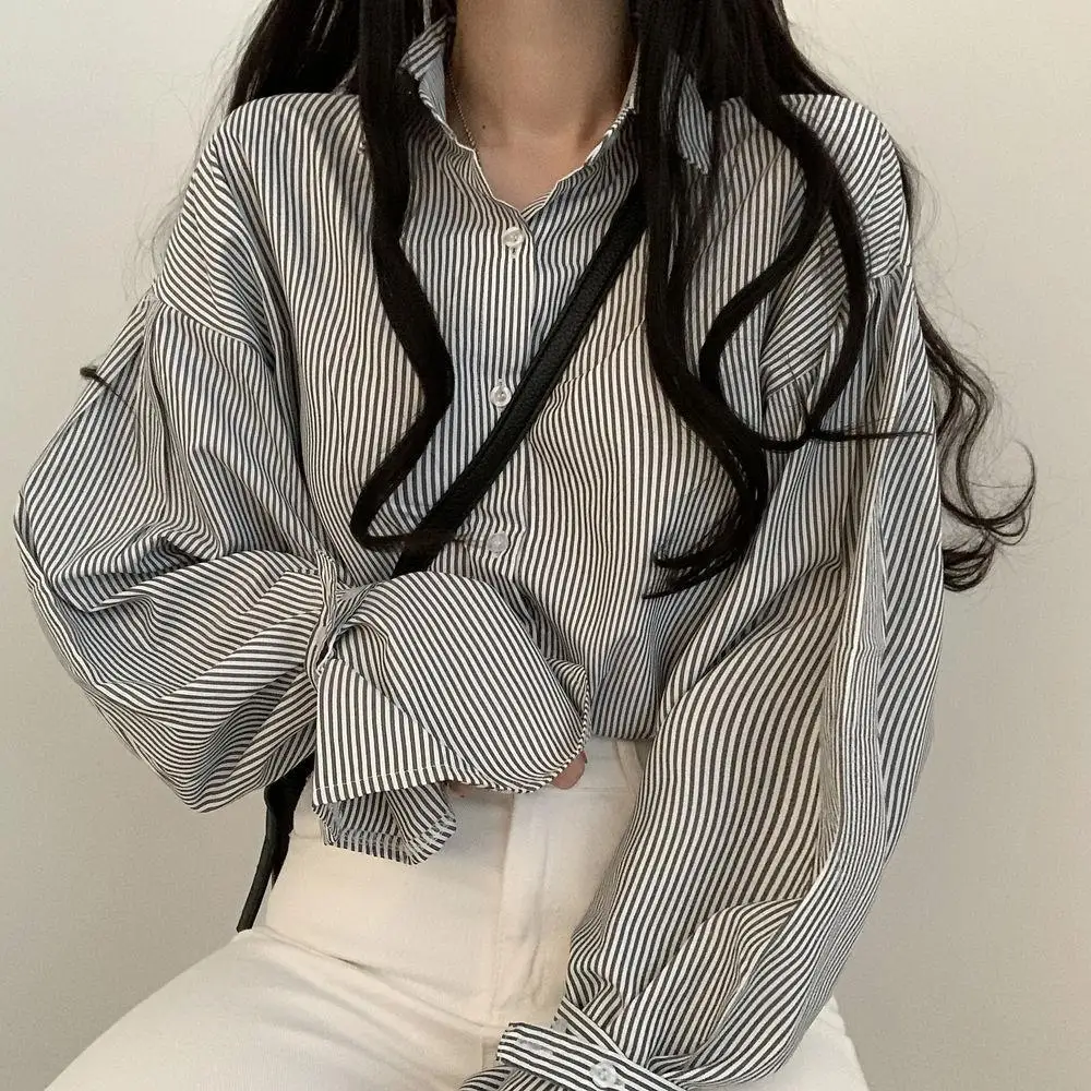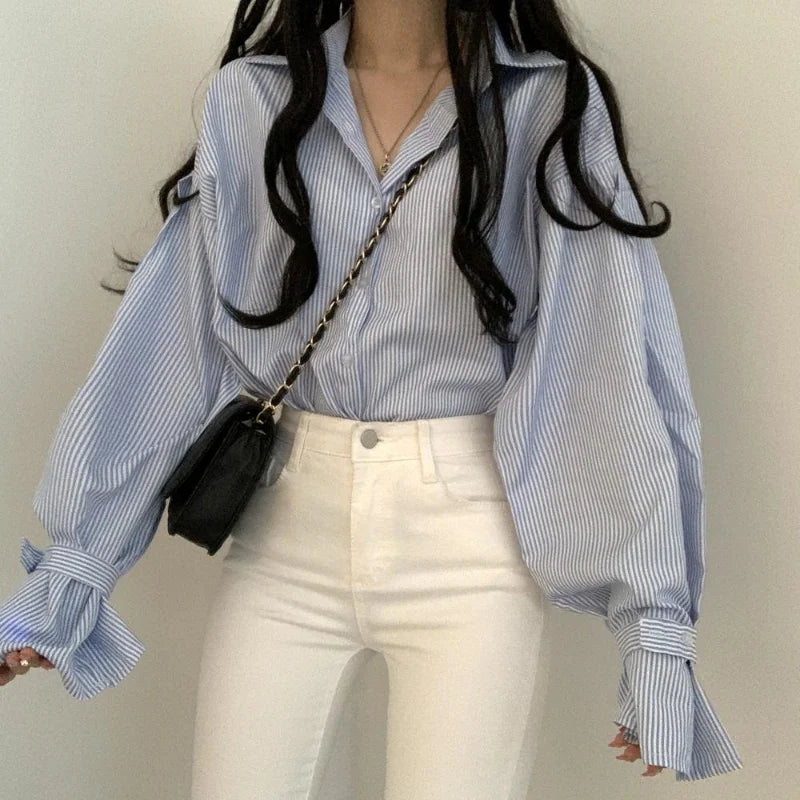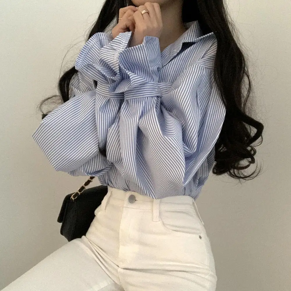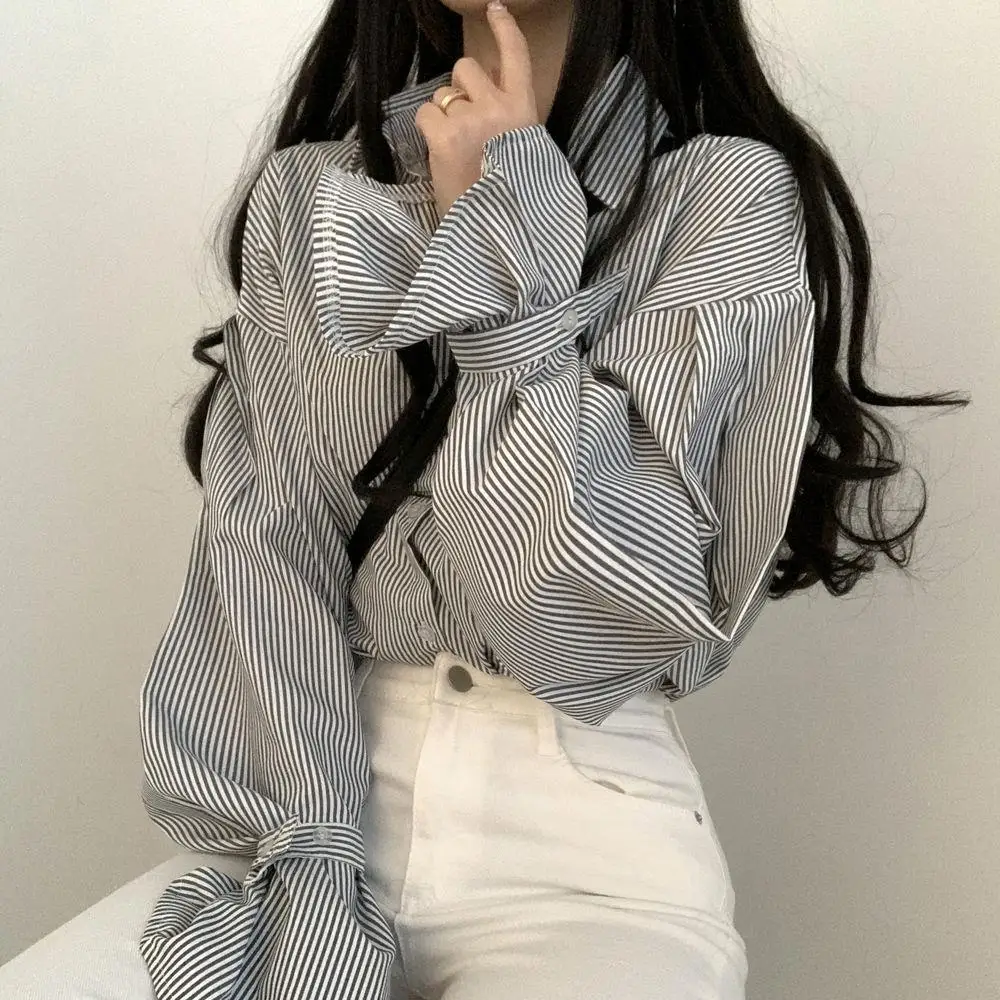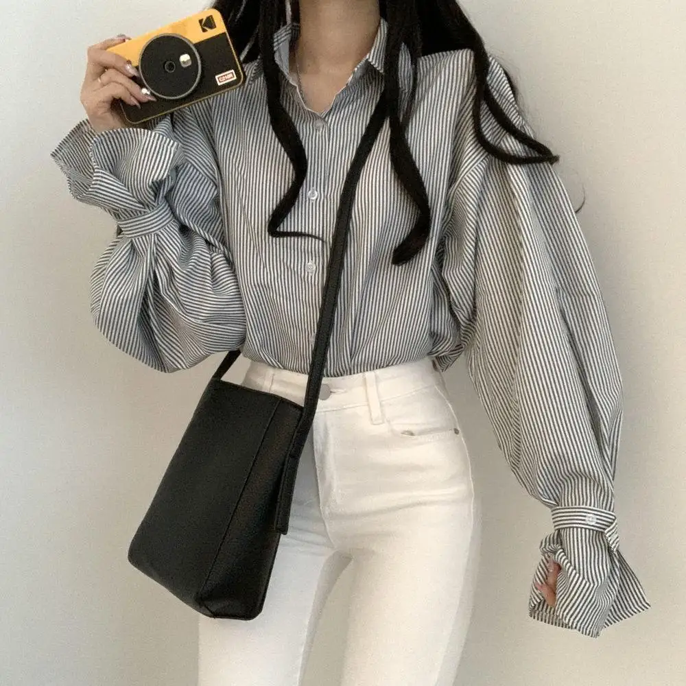 Yipinpay Lantern Sleeve Blue Stripe Shirt Camisas Blusas Mujer Loose Casual Black Top Women's Clothing Blouses Office Lady Shirts