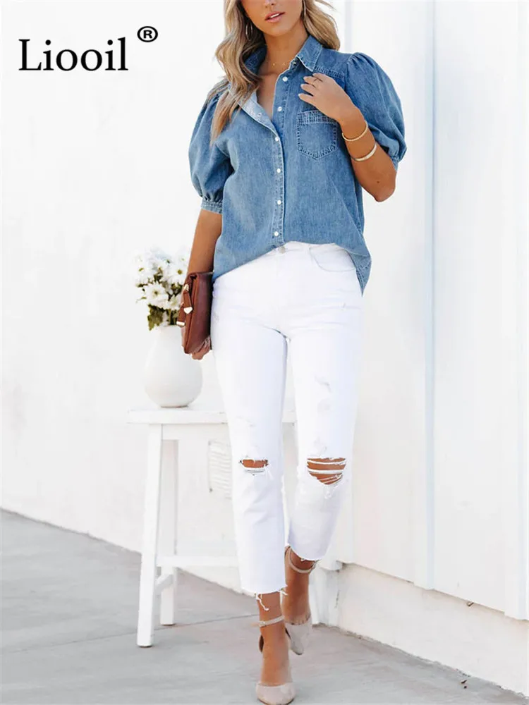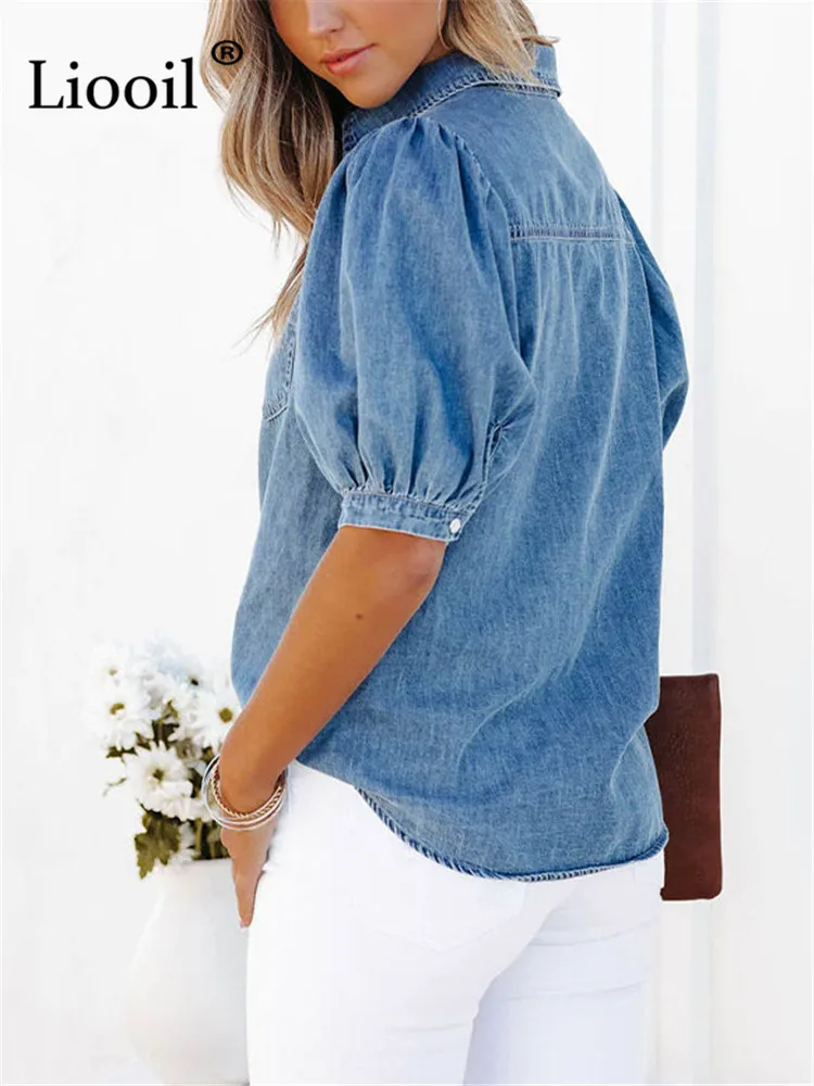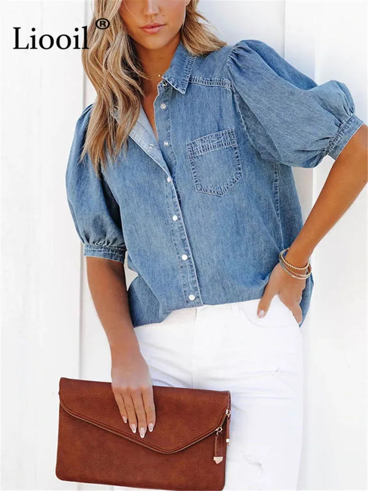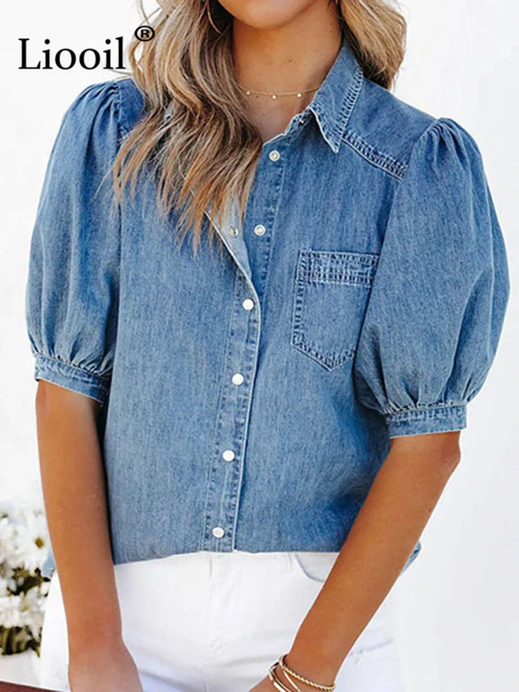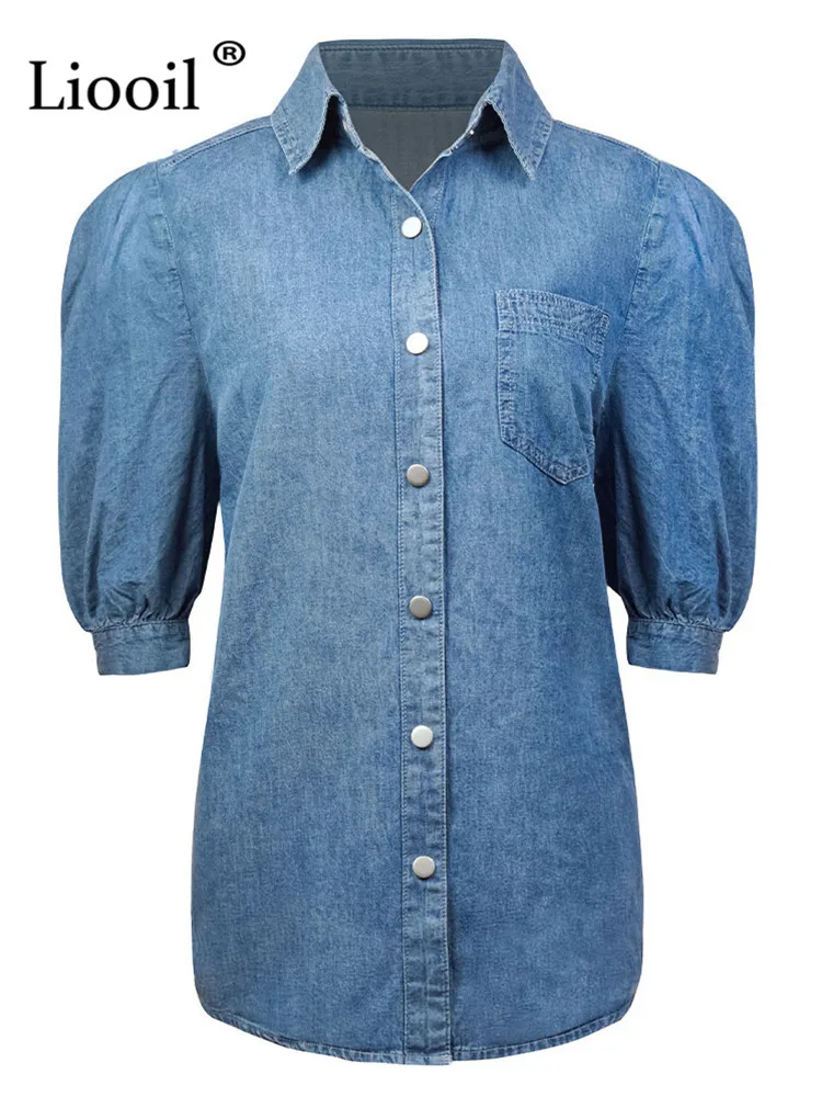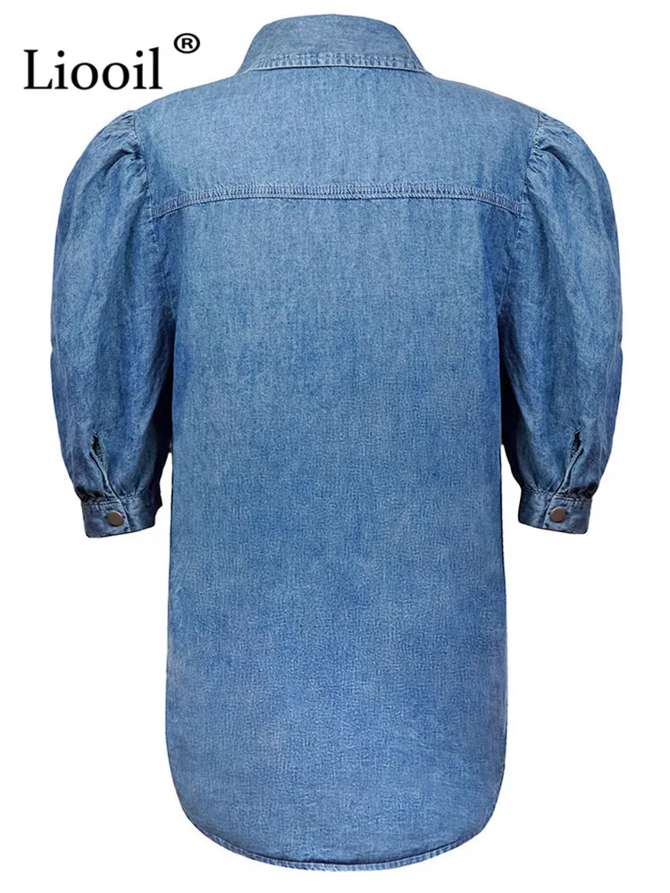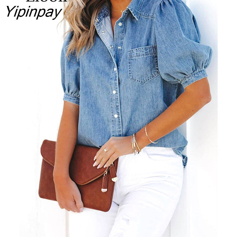 Yipinpay Lantern Sleeve Denim Shirt Women Button Up Cardigan Top With Pockets Streetwear Turndown Collar Sexy Tops And Blouses