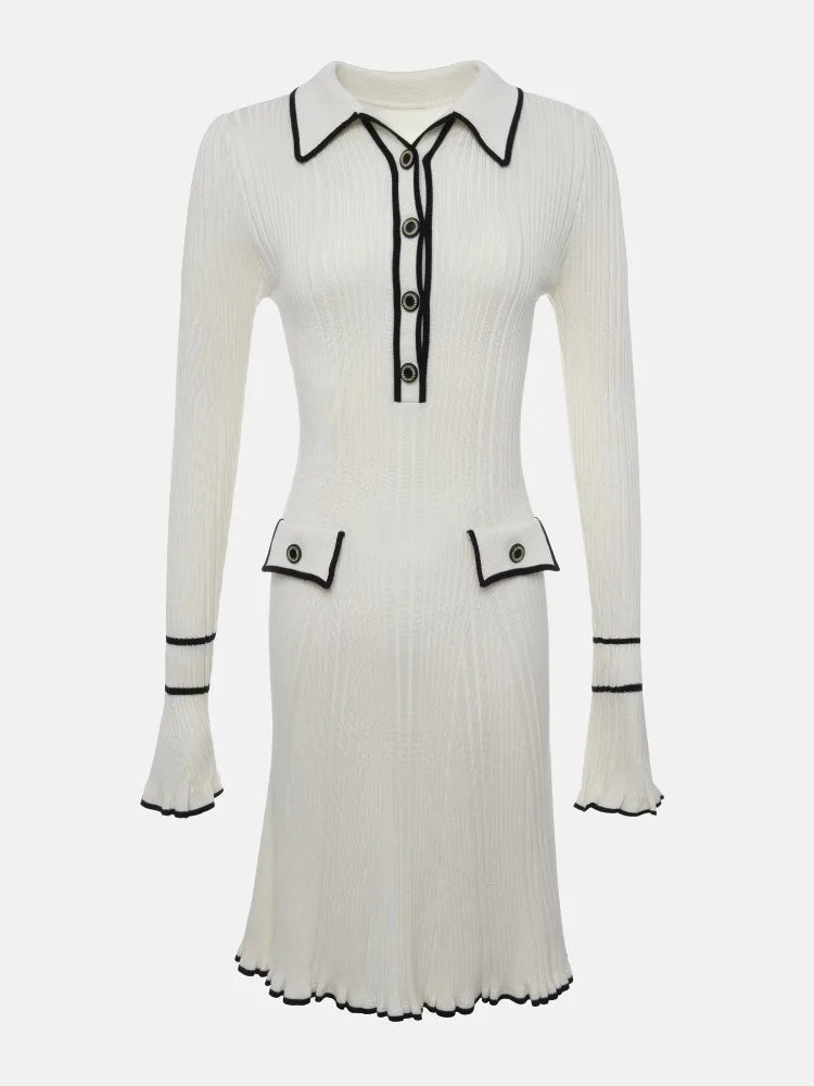 Yipinpay Lapel Contrast Mini Dress Ladies High Waist Autumn Ribbed Patchwork Long Sleeve Dress Fashion Elegant Ruffled Knit Dress