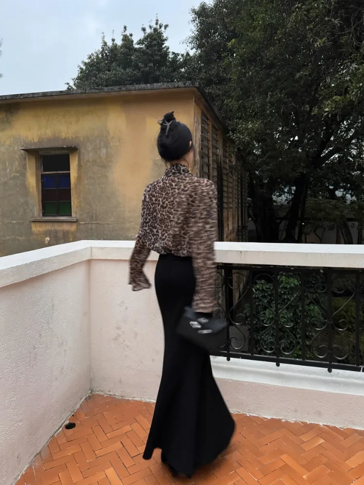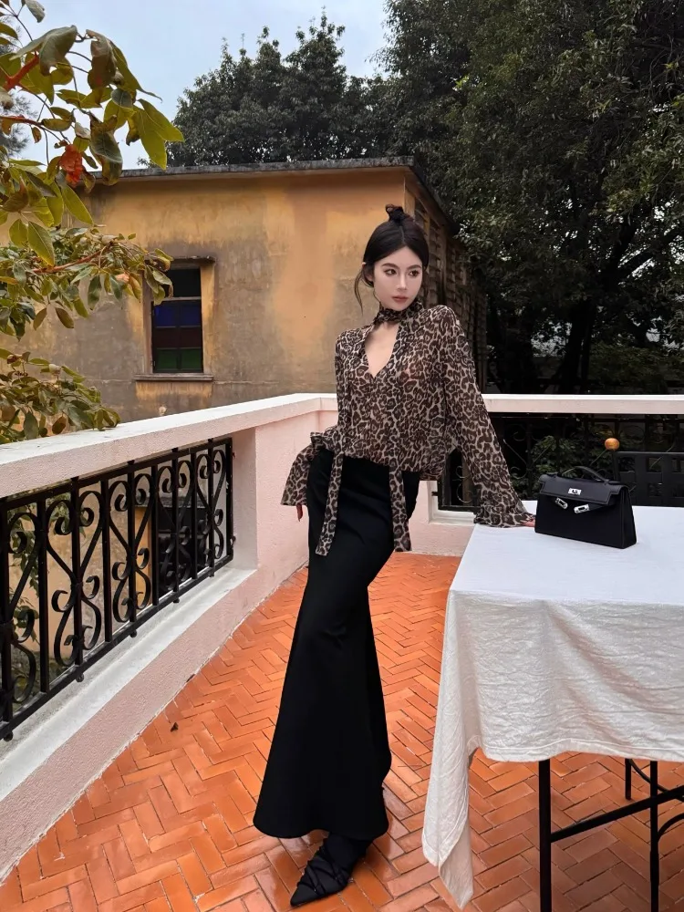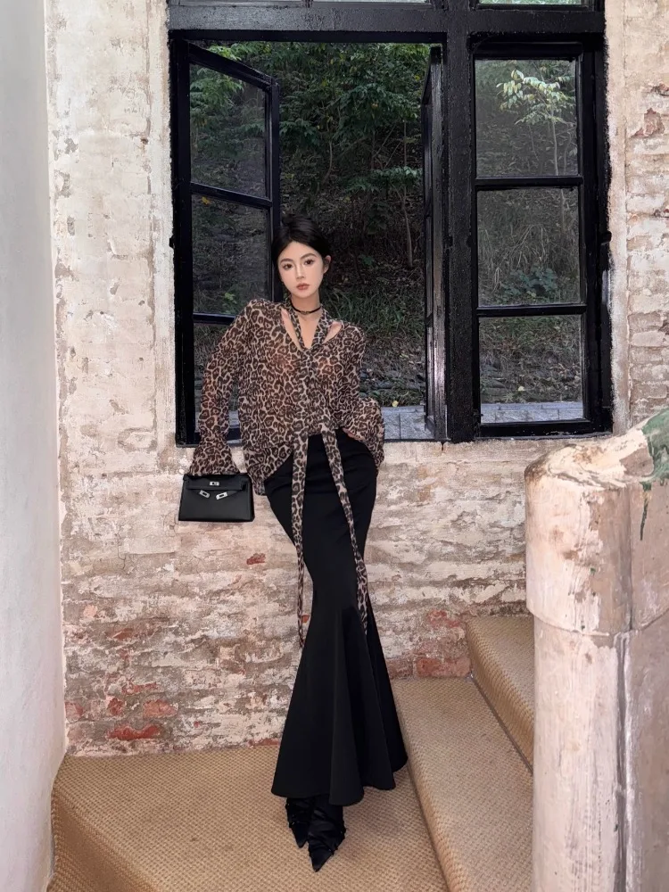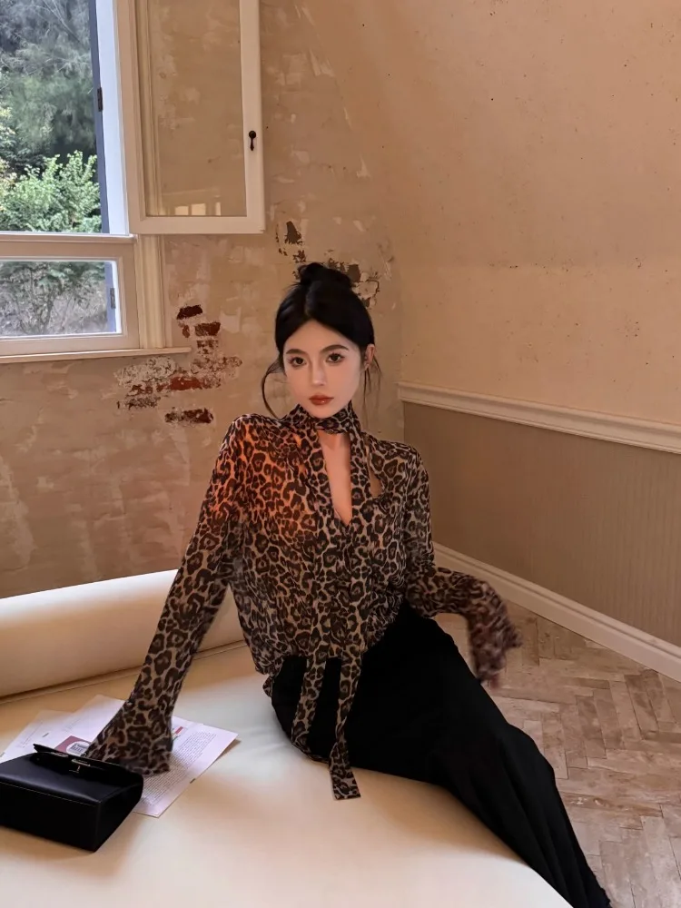 Yipinpay Leopard Printed Shirts Women V Neck Flare Long Sleeve Loose Female Fashion Sexy Elegant Blouse Streetwear Casual Tops