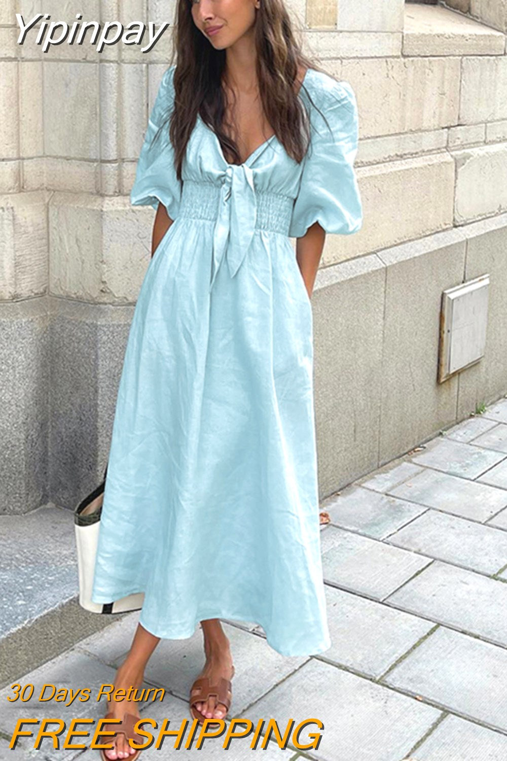 Yipinpay Light Blue Tunic Dress Puff Sleeve Women Twist Vacation Cotton Linen Dress Ladies Boho Casual Chic Dress Summer 2023