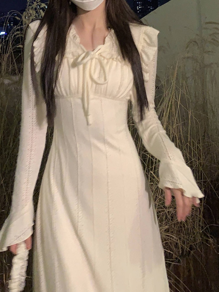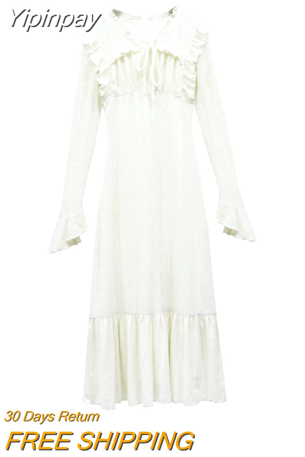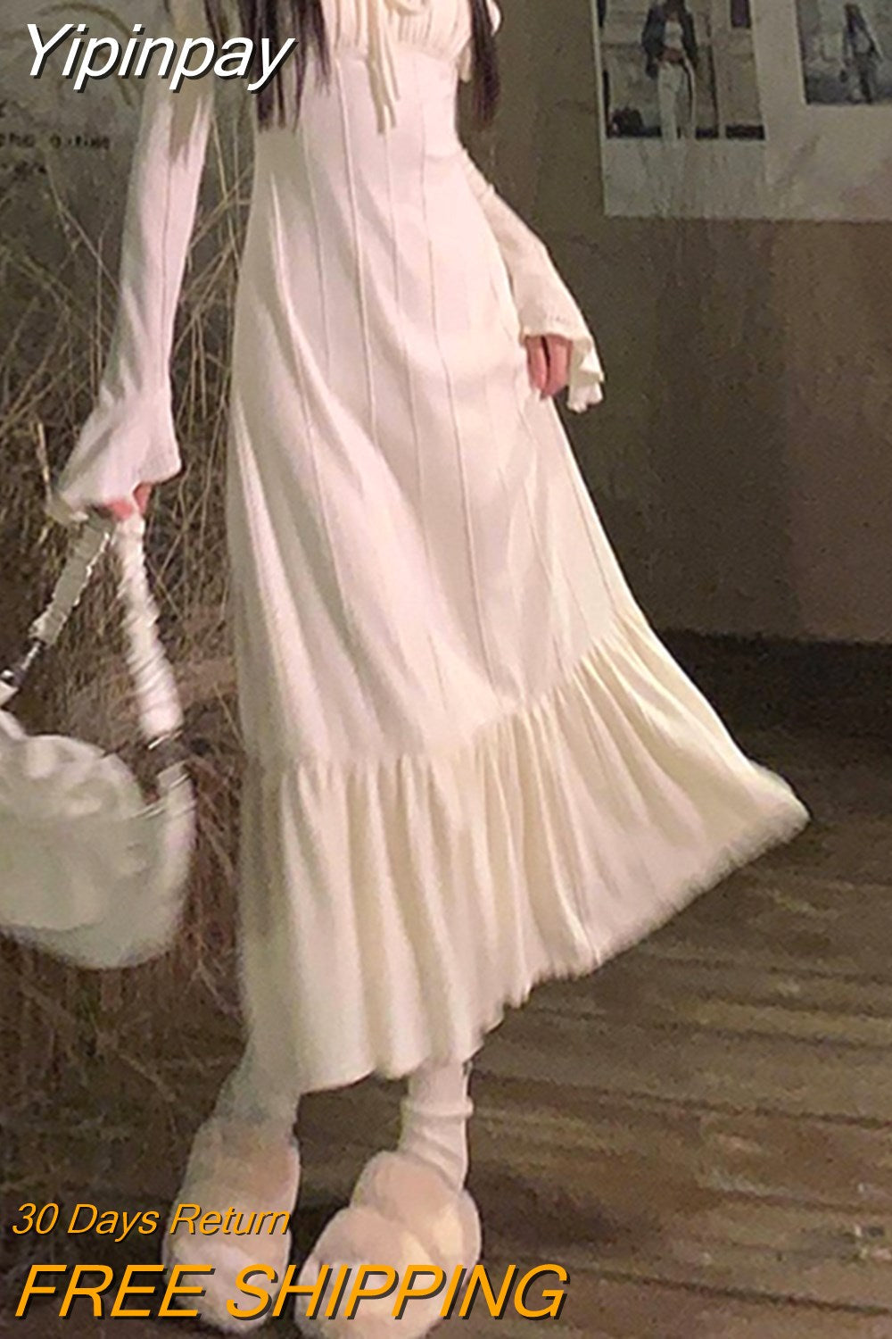 Yipinpay Long Sleeve Midi Dress Woman Casual Fairy One Piece Dress Korean Style Pure Color Short Party Dress Female 2023 Winter