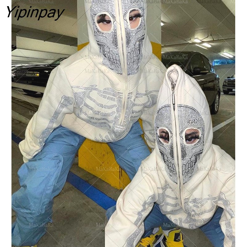 Yipinpay Long Sleeve Outerwear Womens Y2k Fashion Hoodie Skull Rhinestone Zip Up Hoodie grunge Women's Oversized Sweatshirt Punk 319