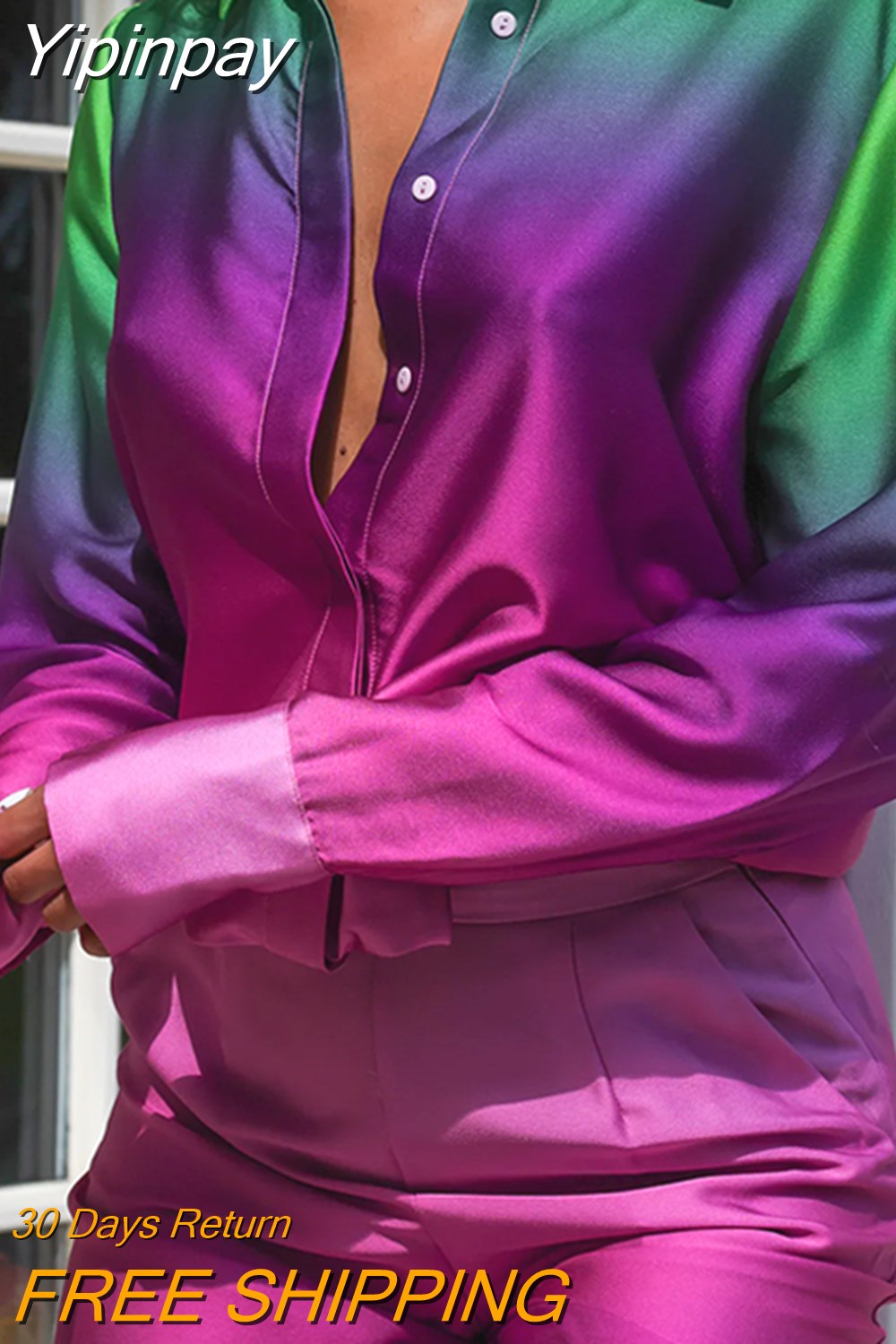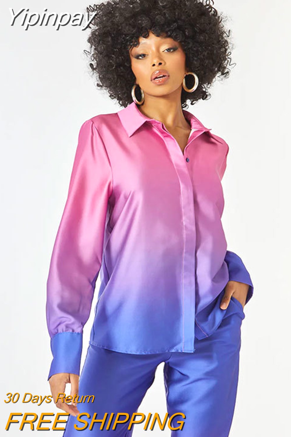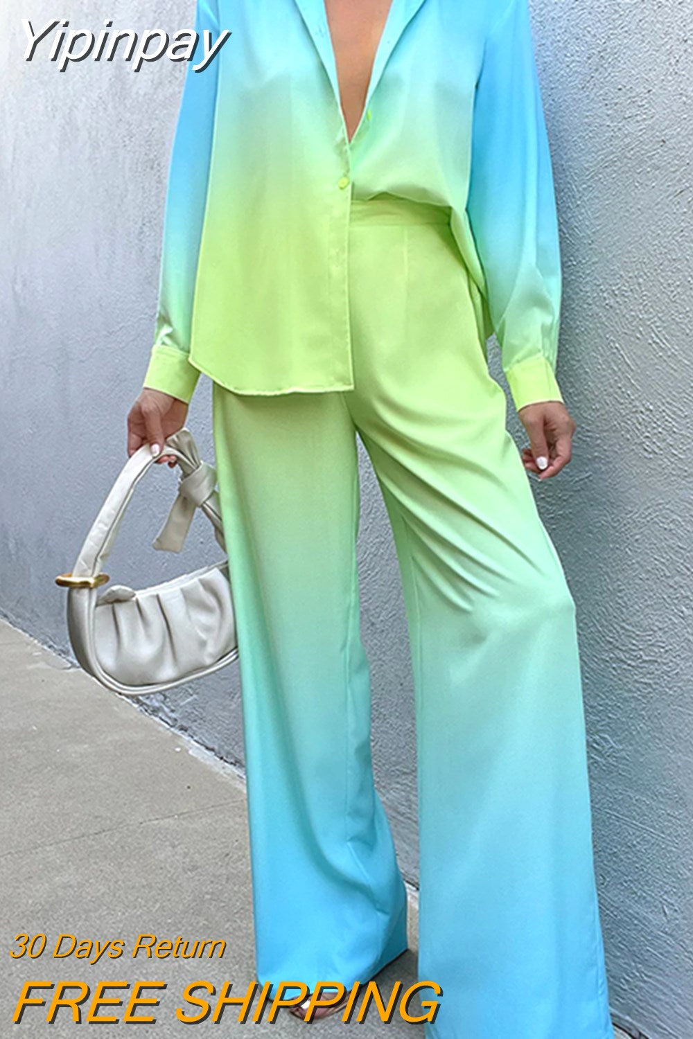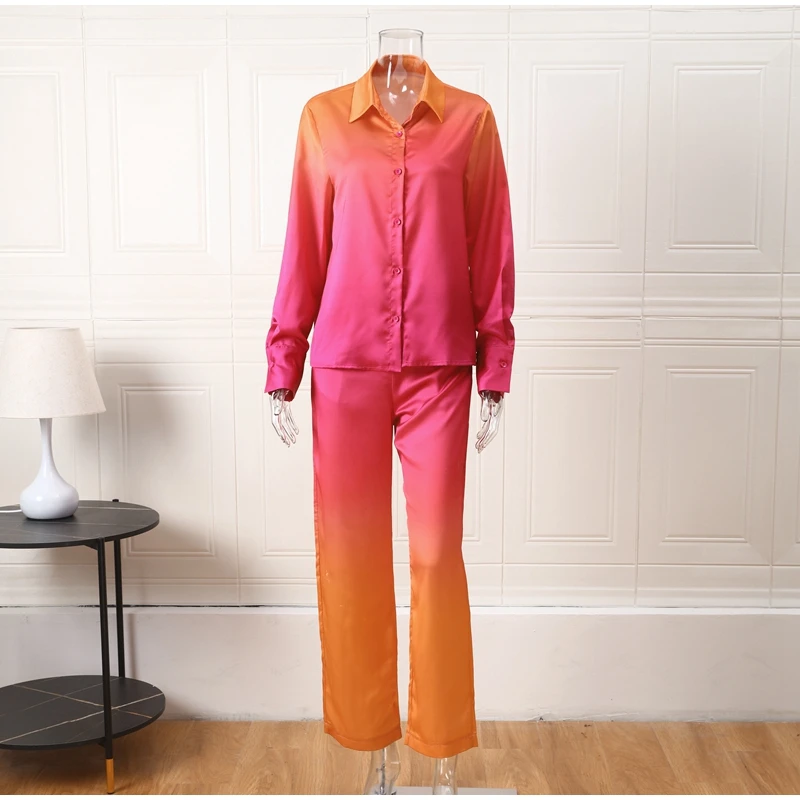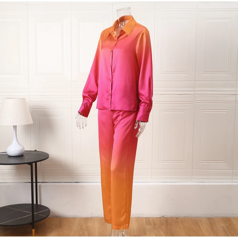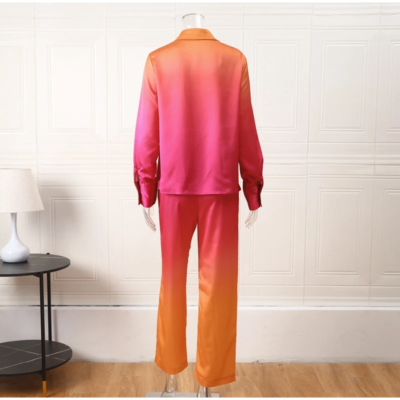 Yipinpay Loose Gradient Blouse 2 Piece Set Elegant Satin Long Sleeve Shirt Straight Pant Outfits 2023 Spring High Street Lady Suit
