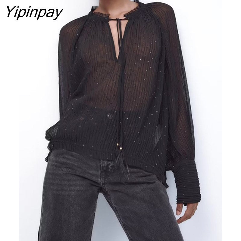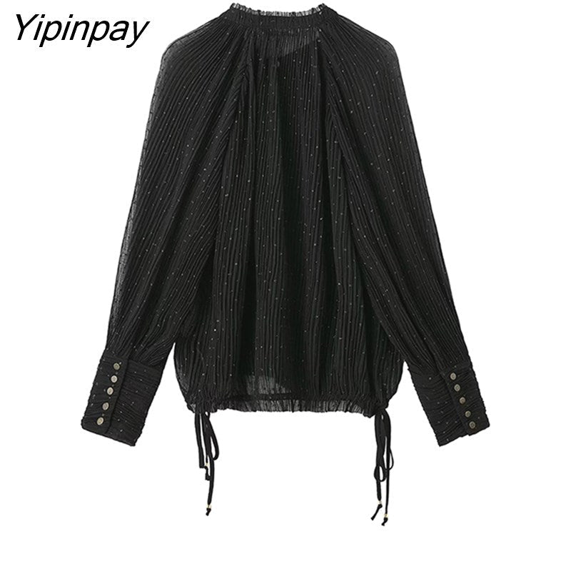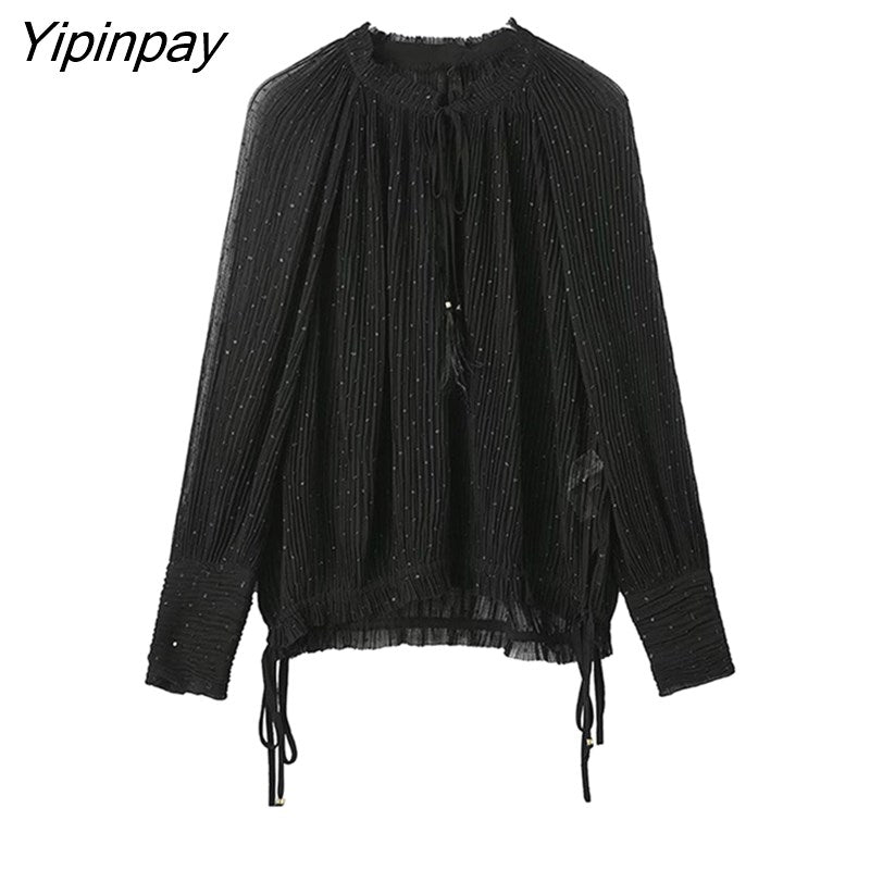 Yipinpay Loose Women Folds Blouses Shirt 2023 Spring Autumn Causal Bow Collar Long Sleeved Thin Tops Oversize Black T-Shirts