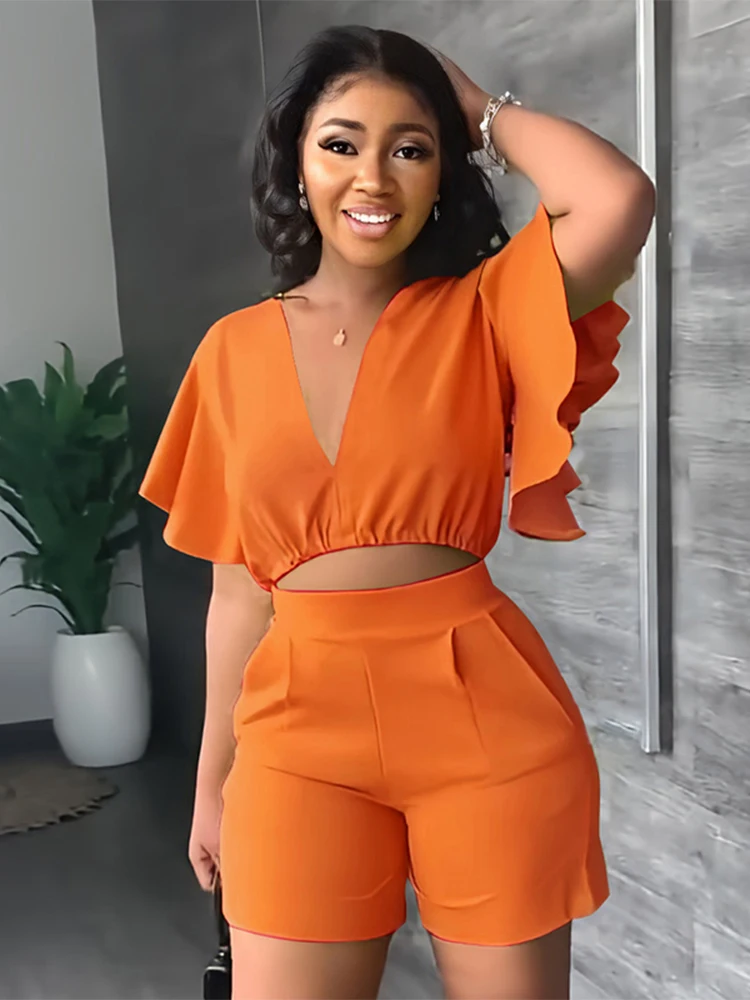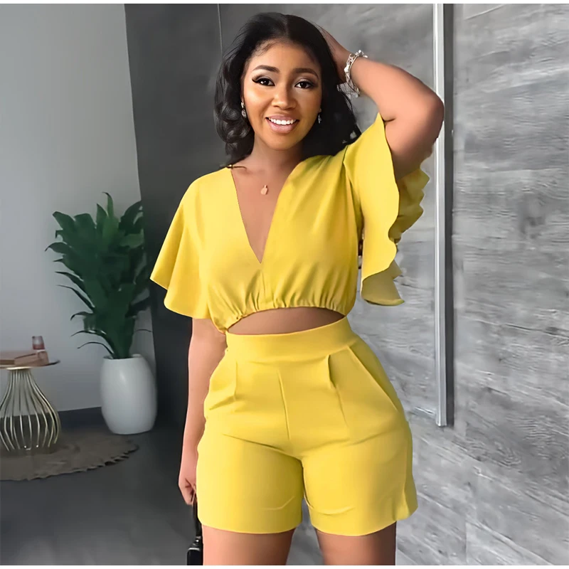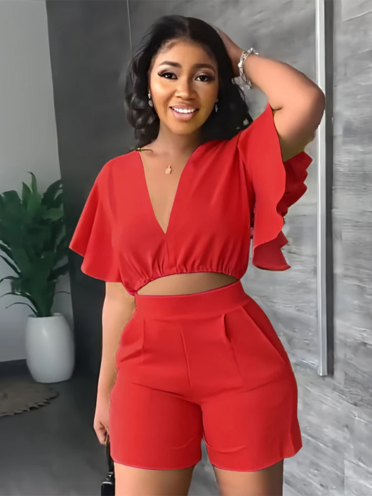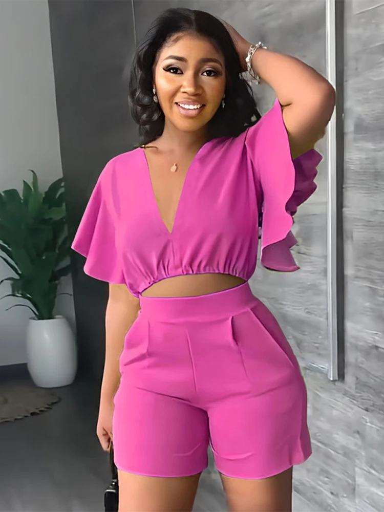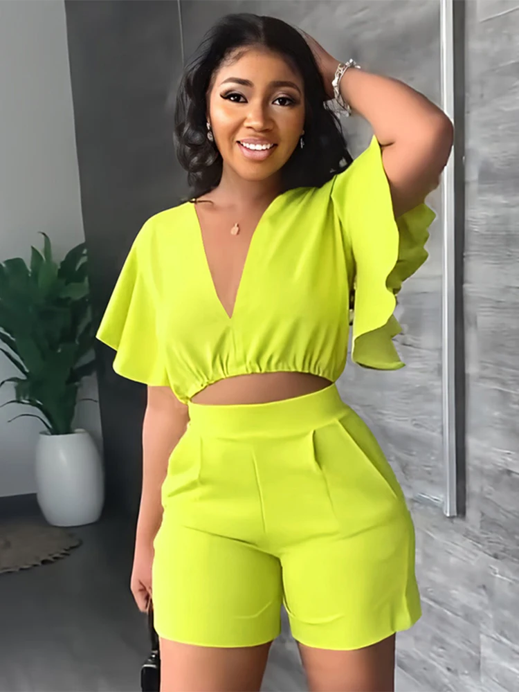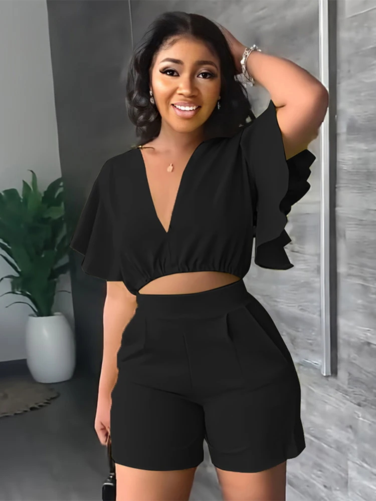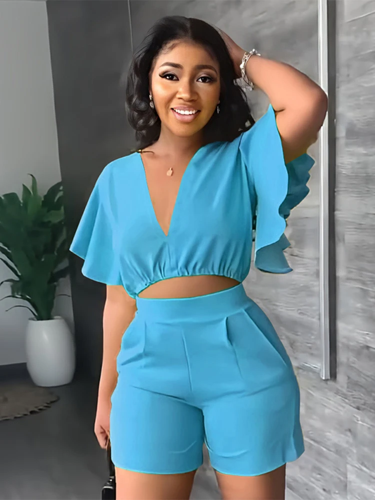 Yipinpay Lotus Leaf Sleeves Shirt Pants Suit Female V Neck Cropped Tops Short Pants 2 Piece Set Summer Girl Casual Club Outfits