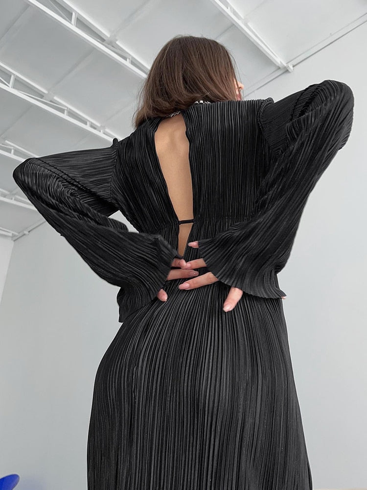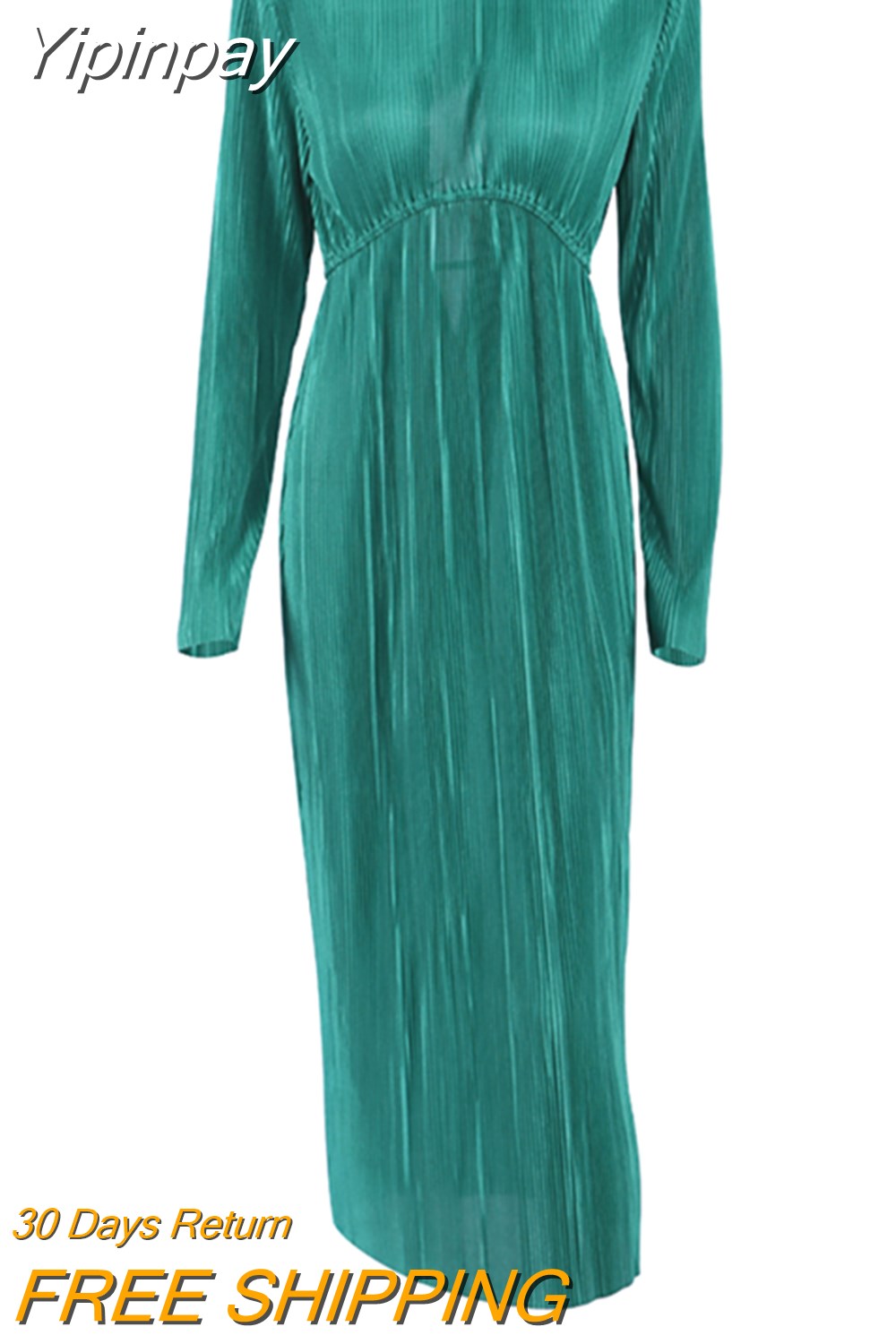 Yipinpay Luxury Elegant Dress Women Pleated Spring Party Dress Lady Slim Long Sleeve Midi Dress Evening 2023 Robe Hollow Out