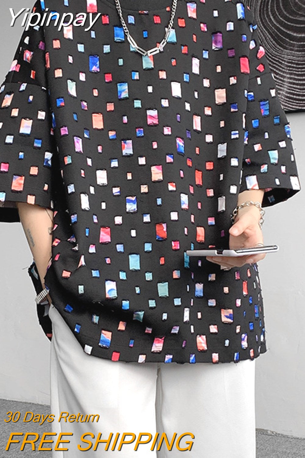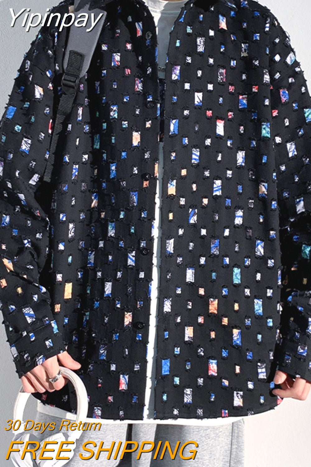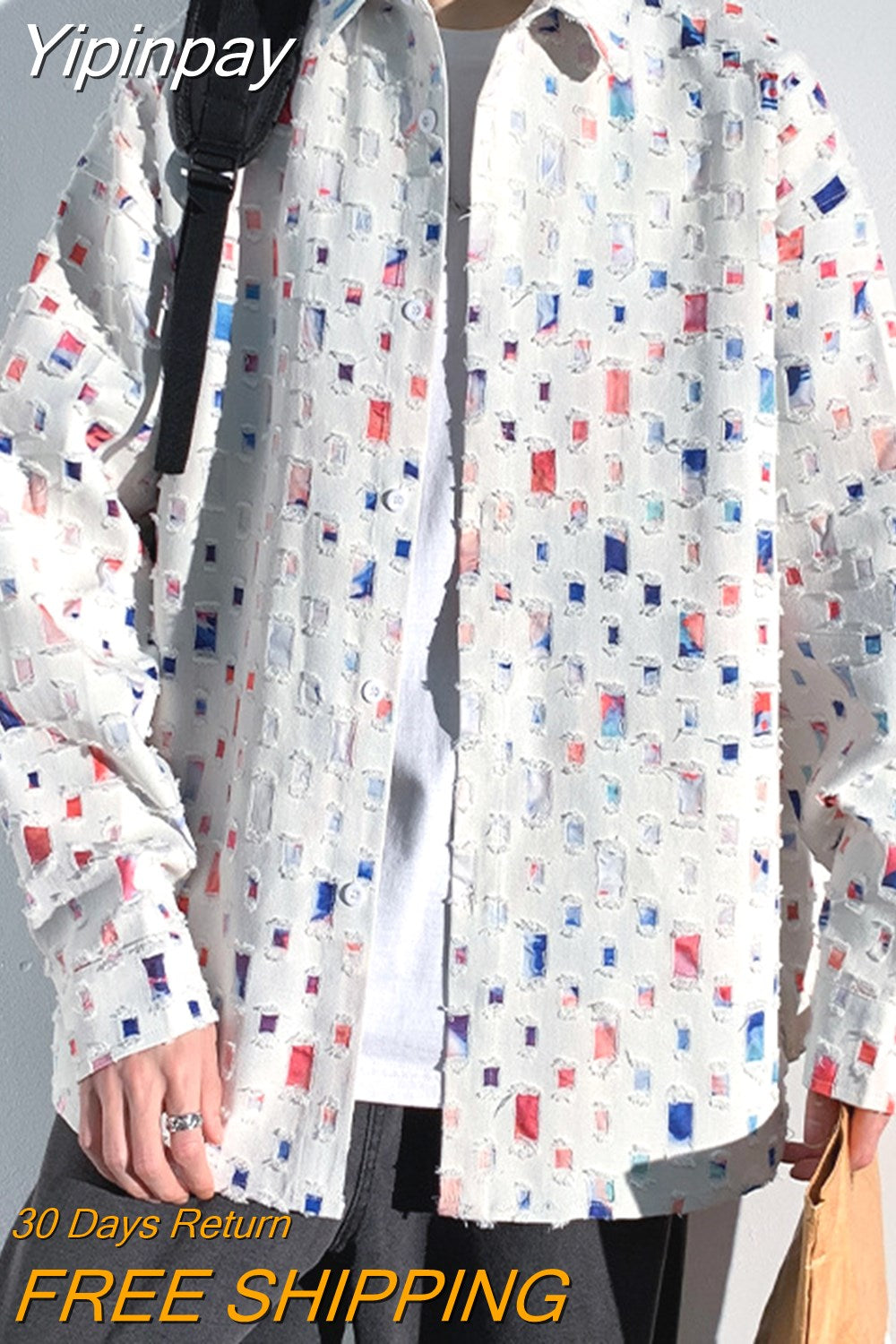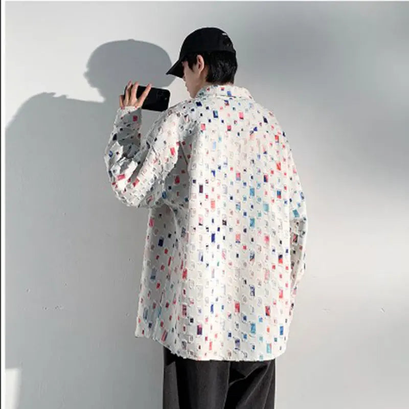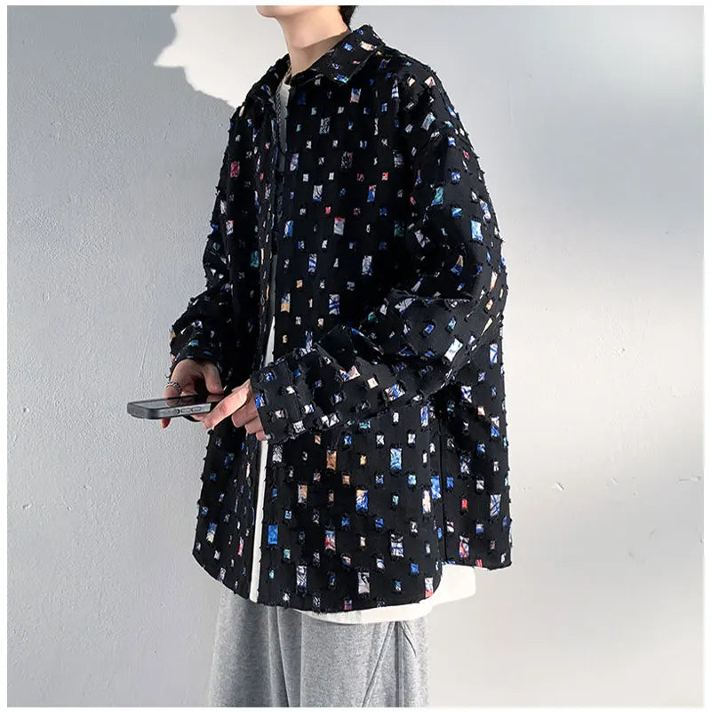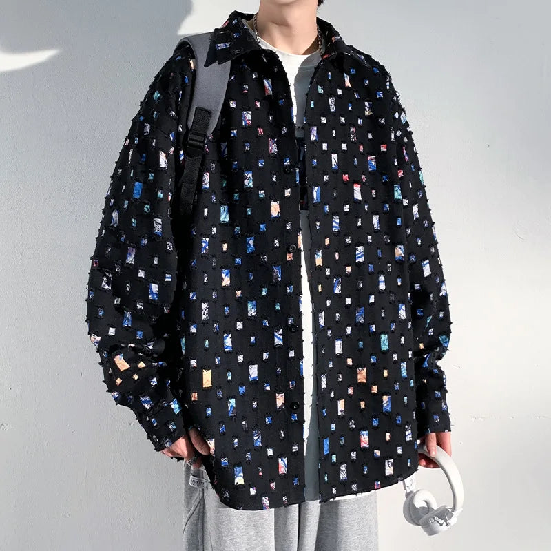 Yipinpay Men Plaid Shirts Fashion Colorful Oversized Hollowed Out Shirt Casual Large Size Patch Blouses Long Sleeve Jacket Male Clothes