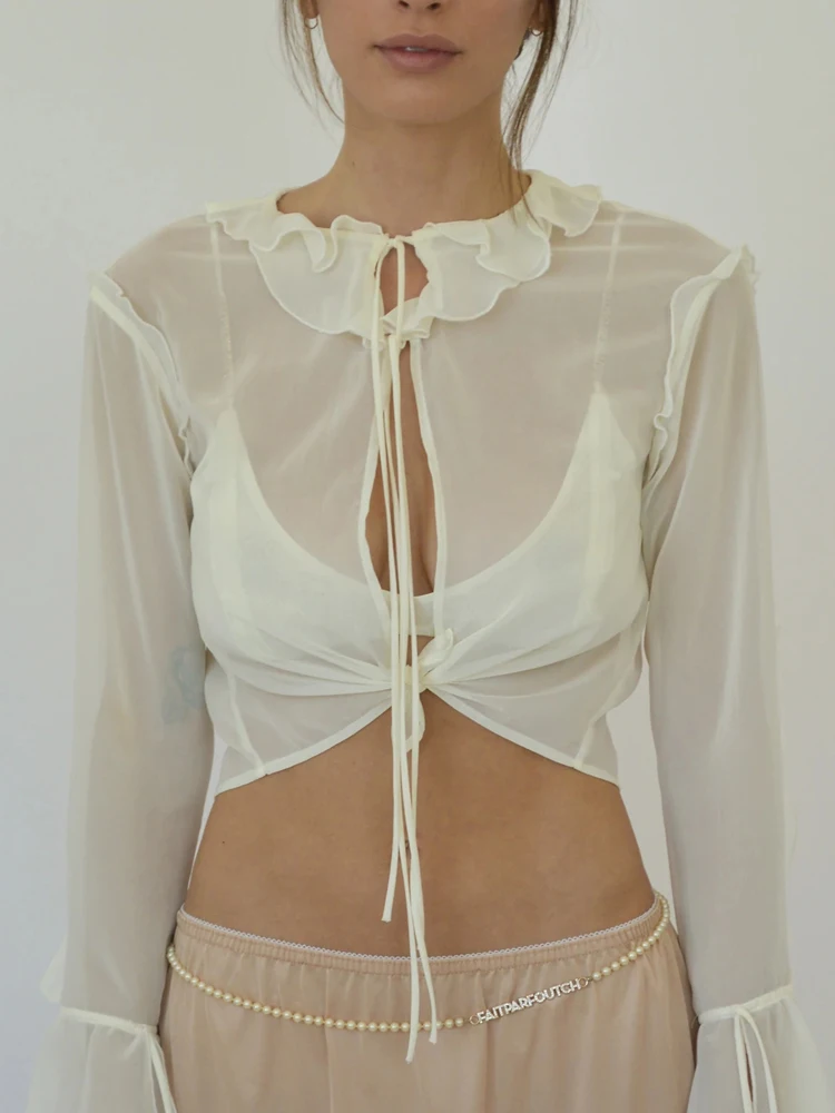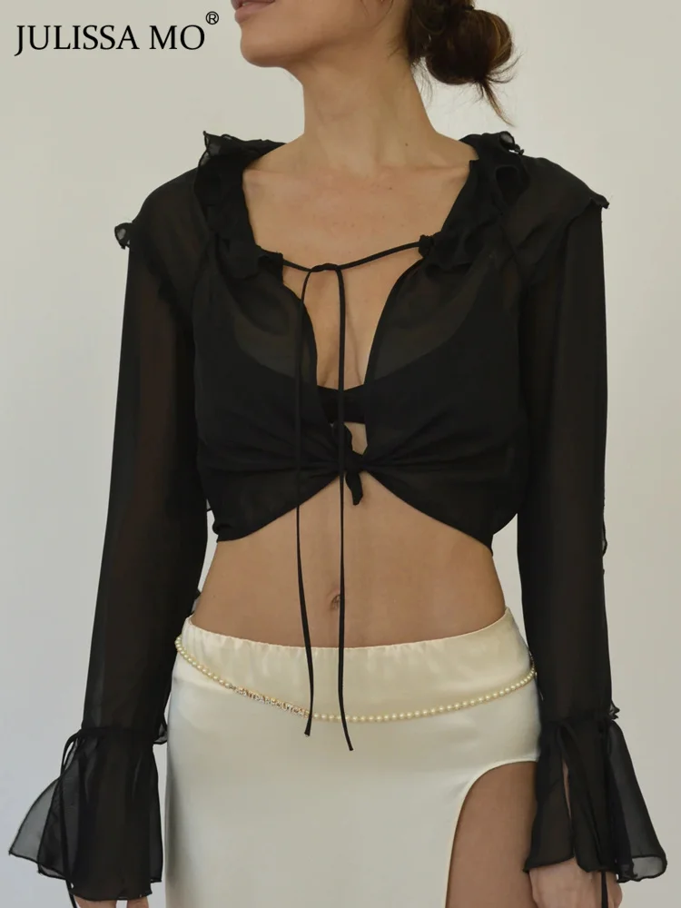 Yipinpay Mo 2023 Mesh See Through Hot Sexy Tops Blouses Women New Shirts Blouse Flare Sleeve Tie Up Tops Clothes Summer Elegant