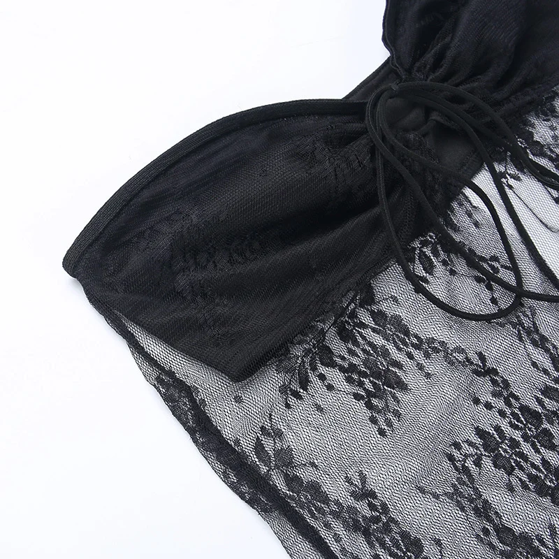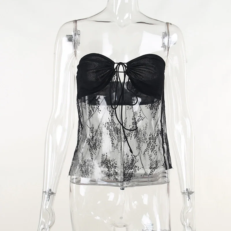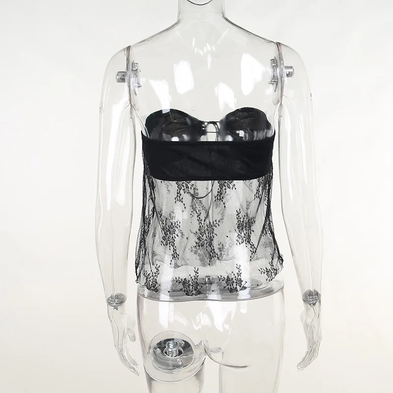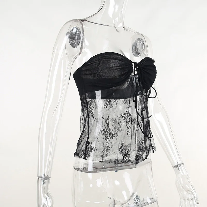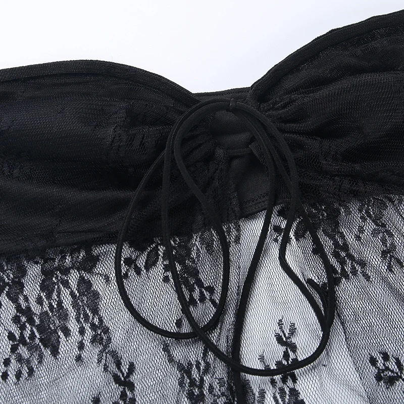 Yipinpay MO 2023 Slim Ruched Mesh Patchwork Lace Crop Tops Women Sexy Bandage Off-shuolder Backless Cropped Top Vest