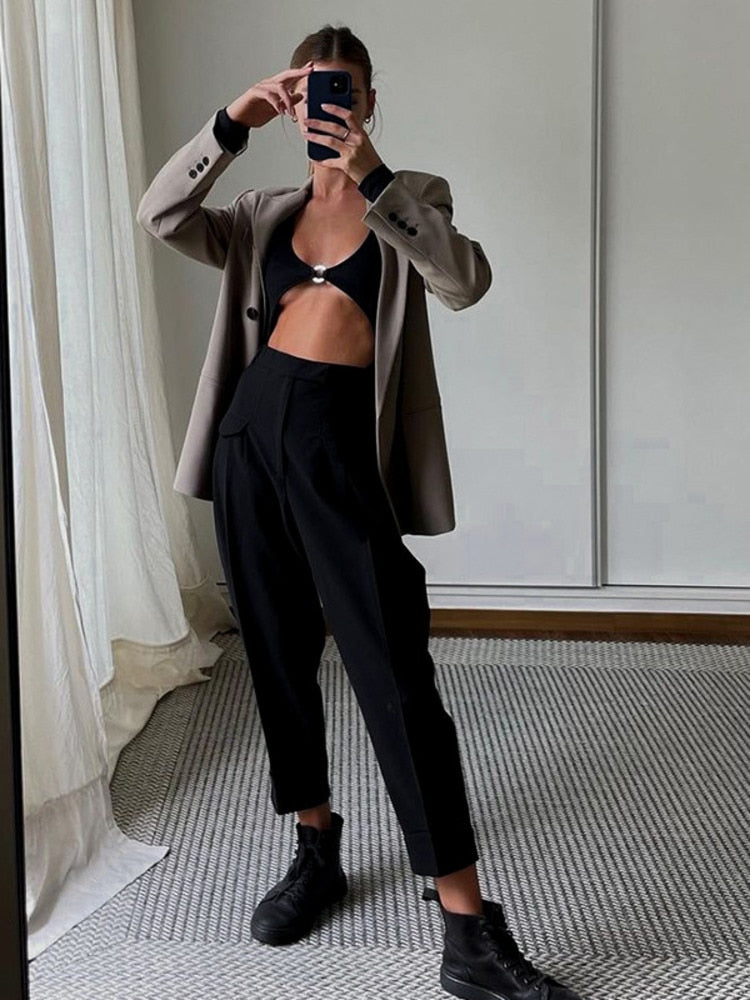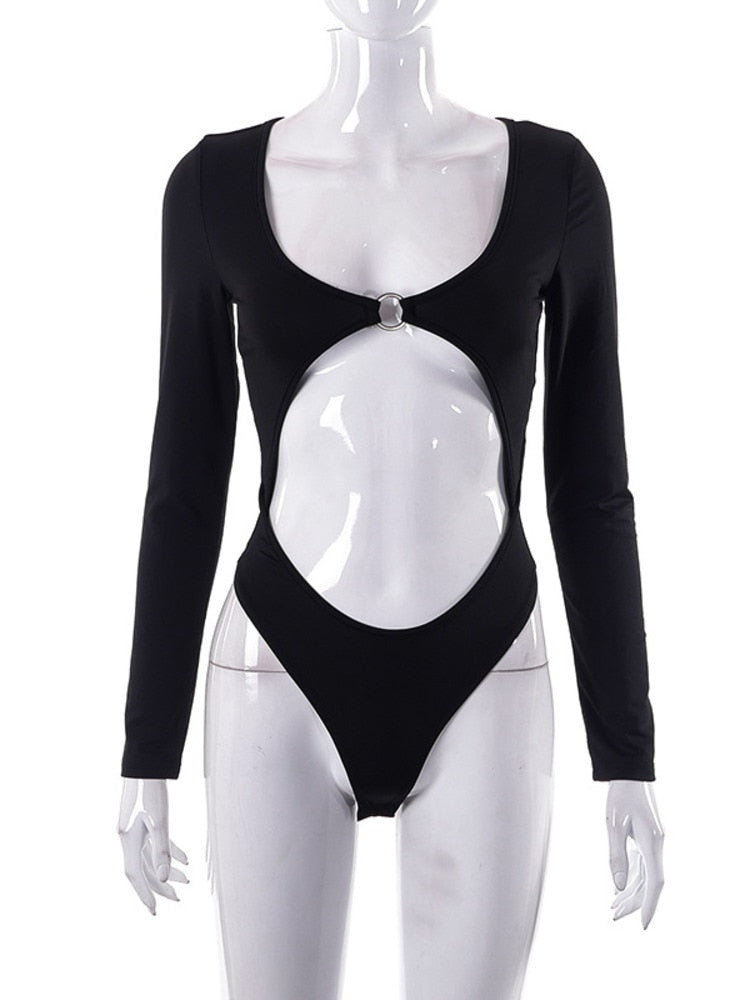 Yipinpay MO 2023New Cut Out Sexy Long Sleeve Bodysuits For Women Elegant O-Ring Metal Slim Tops High Rise Bodysuit Clothes