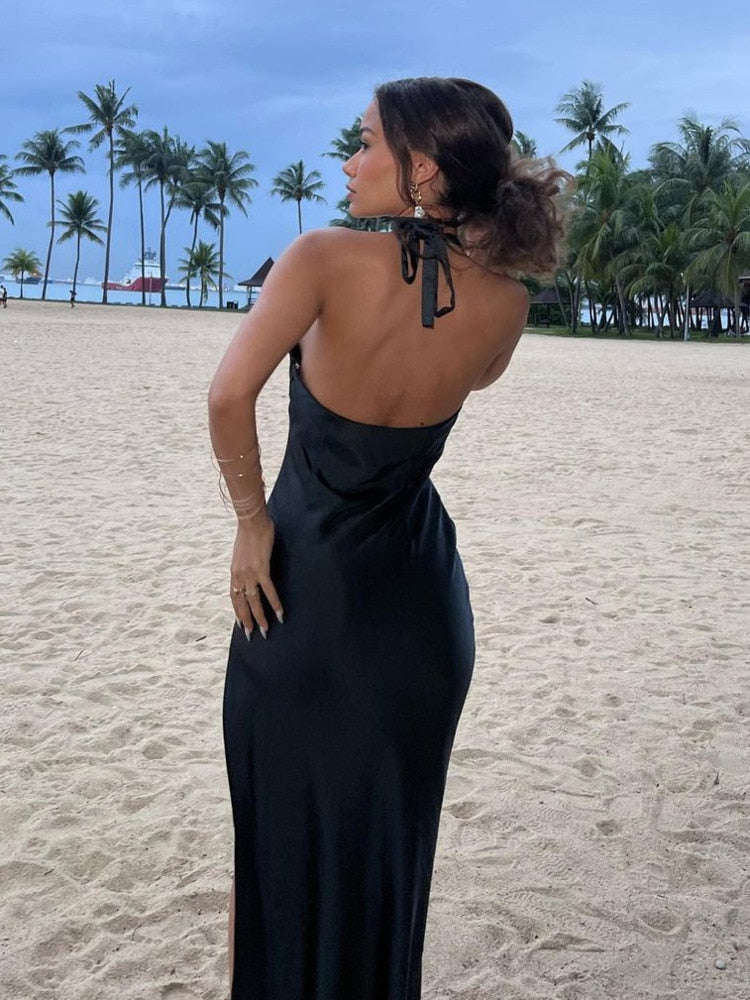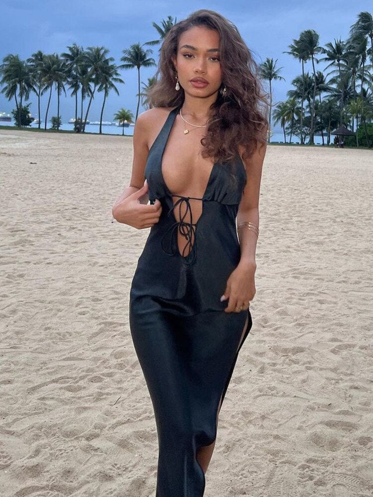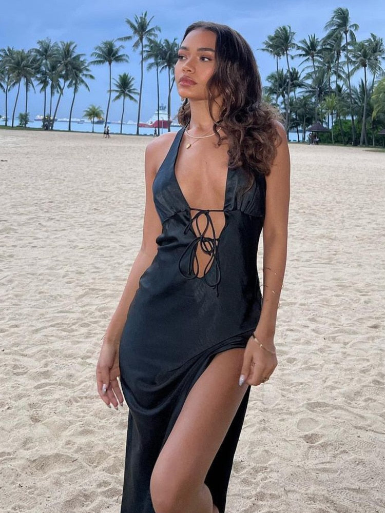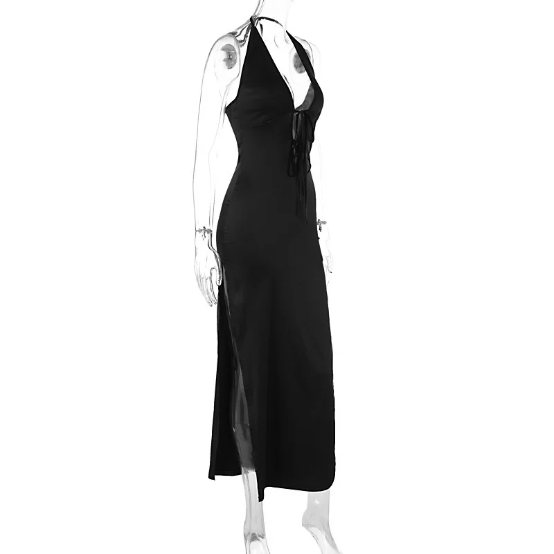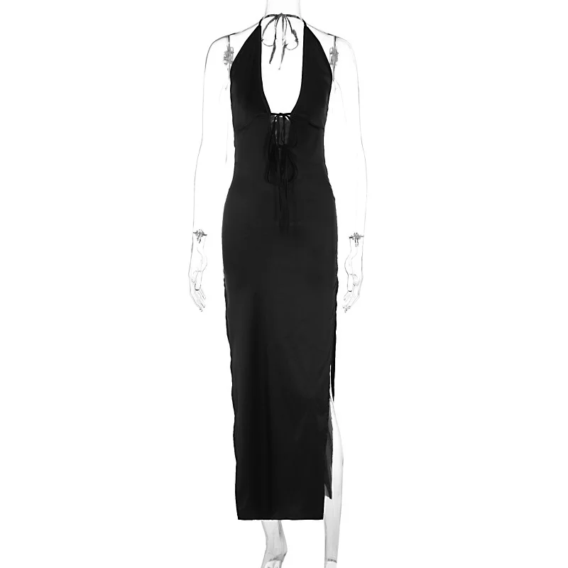 Yipinpay MO Deep V-Neck Lacing Hollow Out Women Elegant Halter Backless Slip Maxi Dress For Femme Side Split Slim Party Night