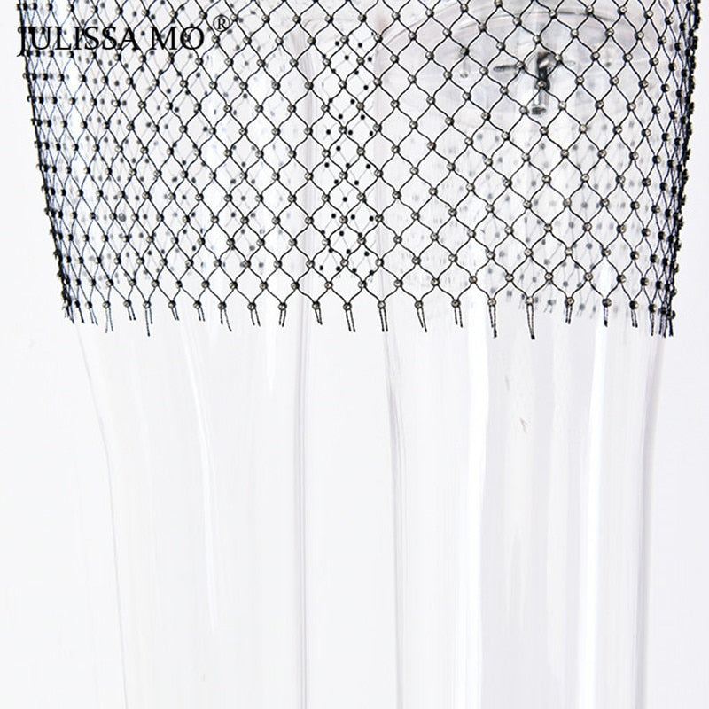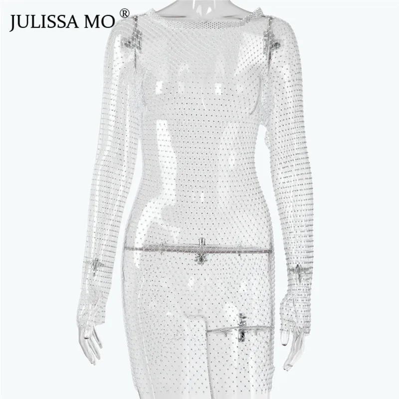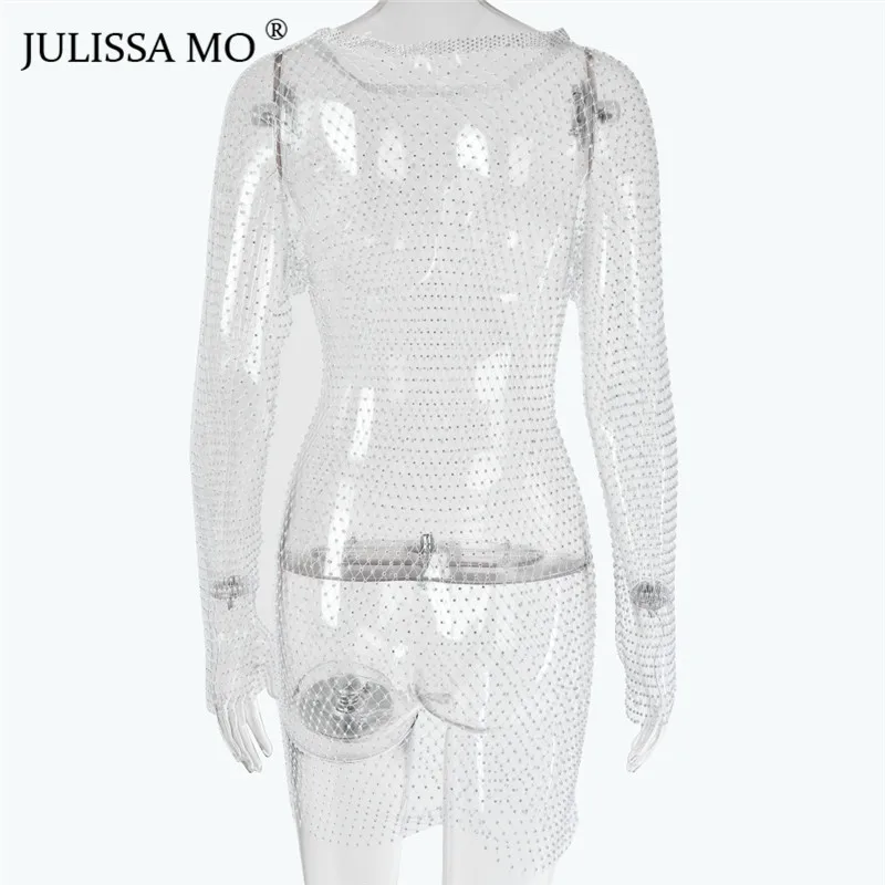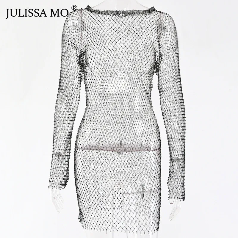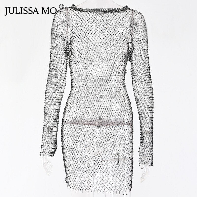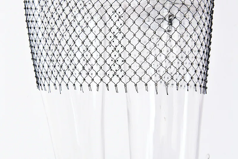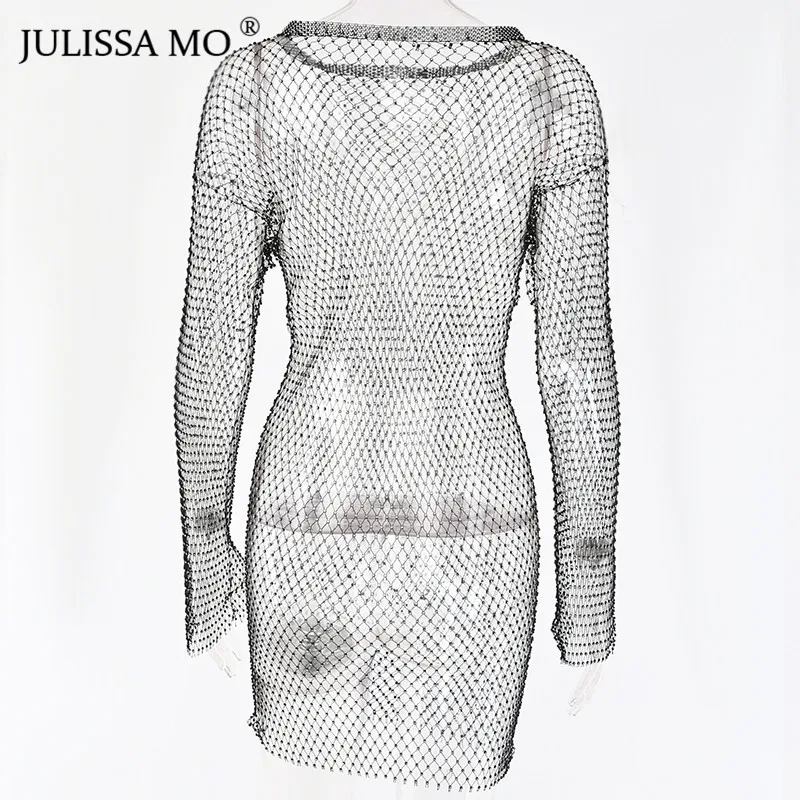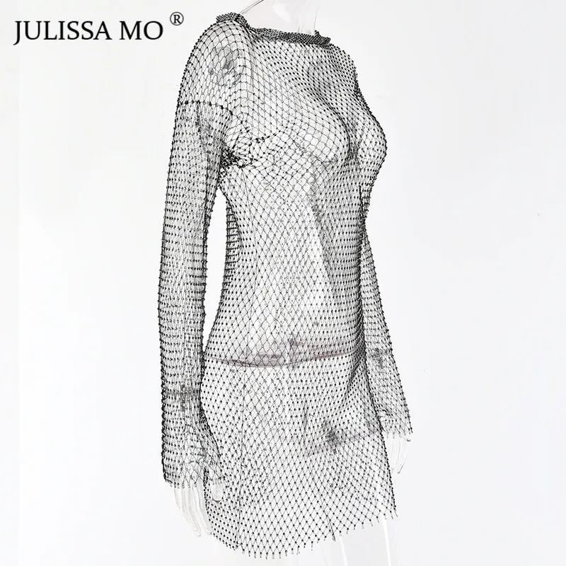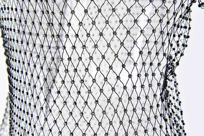 Yipinpay MO Diamonds Mesh Crochet Bodycon Dress Women Sexy Hollow Out Mini Summer Dress 2023 New See Through Nightclub Dresses