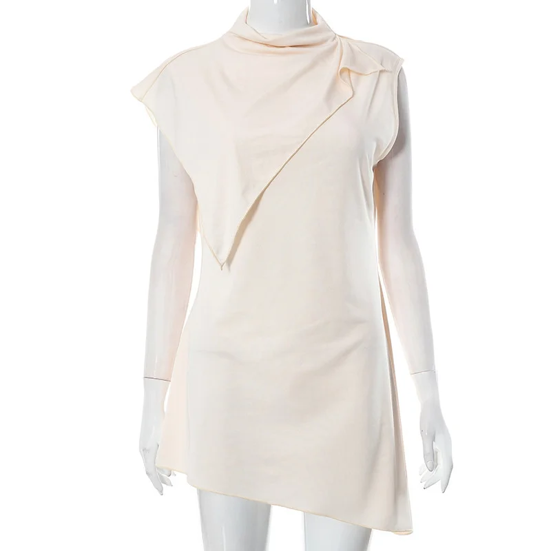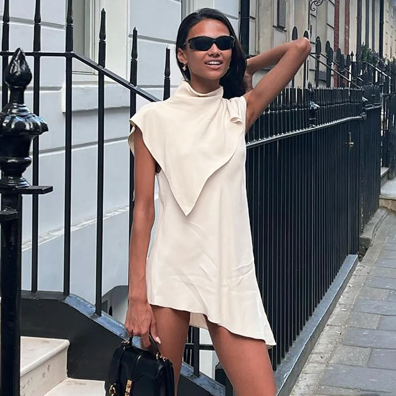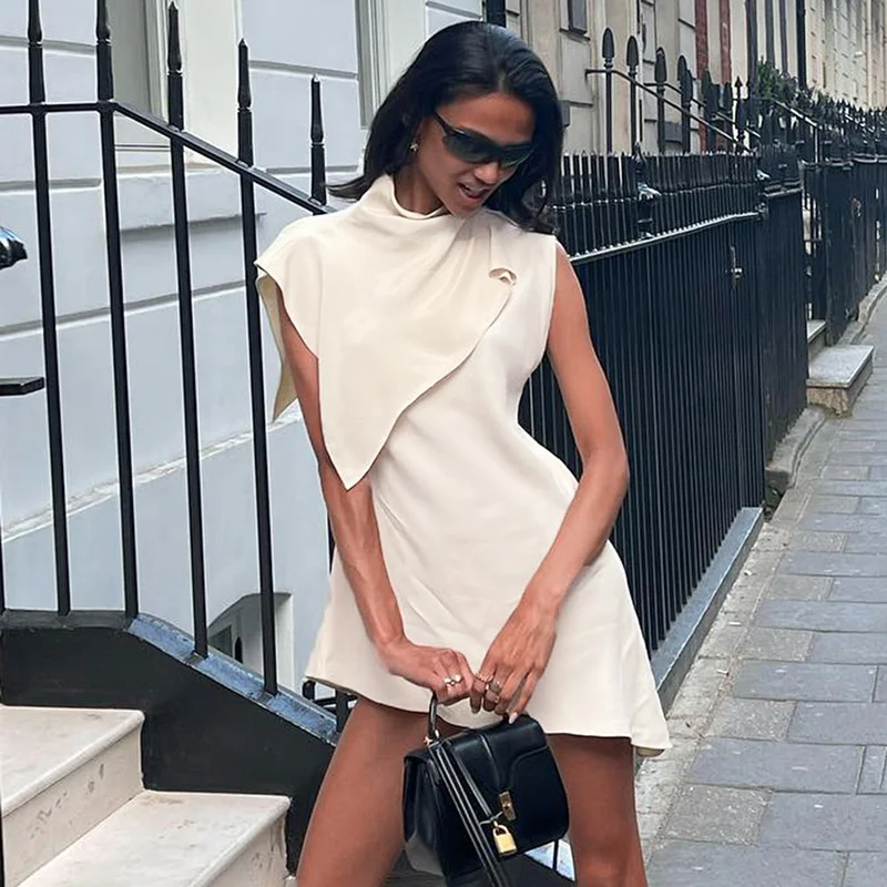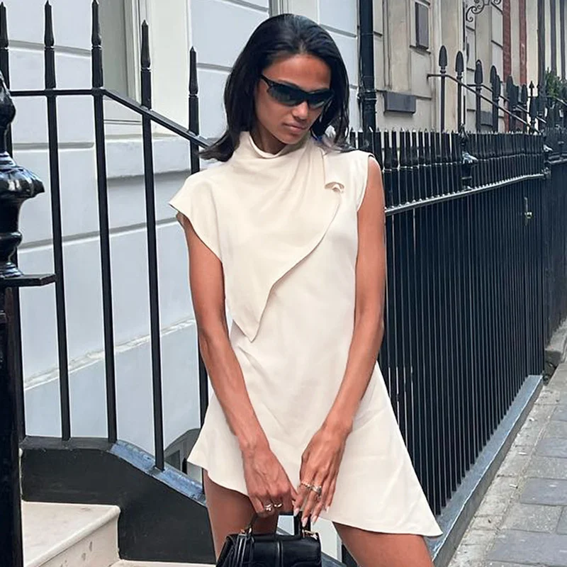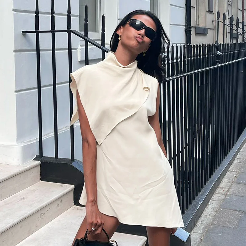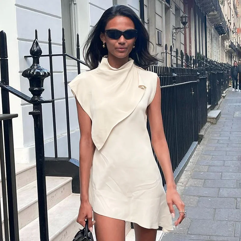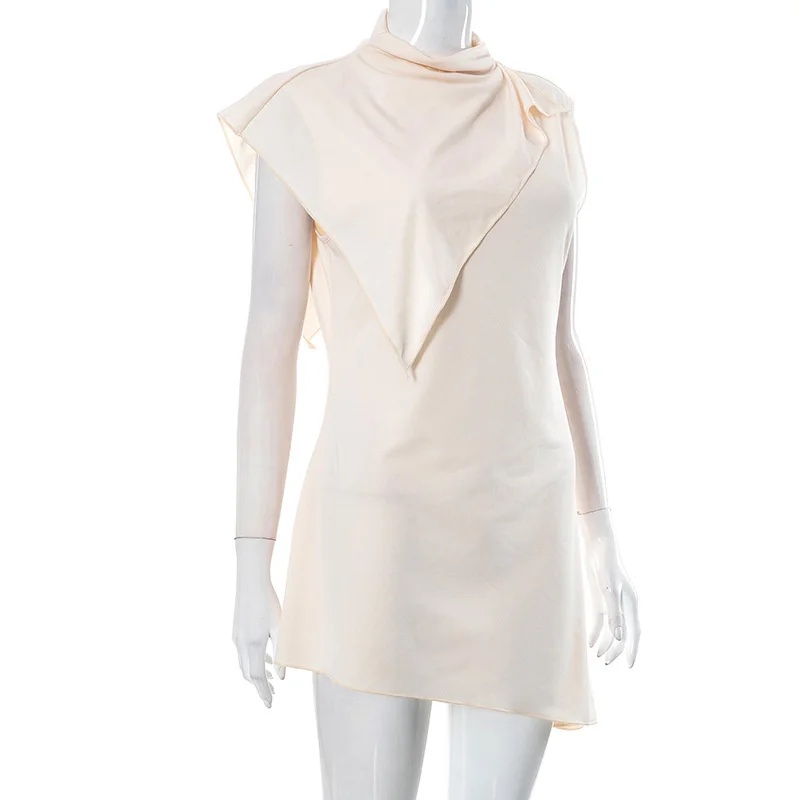 Yipinpay MO Fashion Pile Collar Irregular Solid Sleeveless Mini Dress For Women's Summer Outfits Chic Shawl Slim Sexy Dress 2023