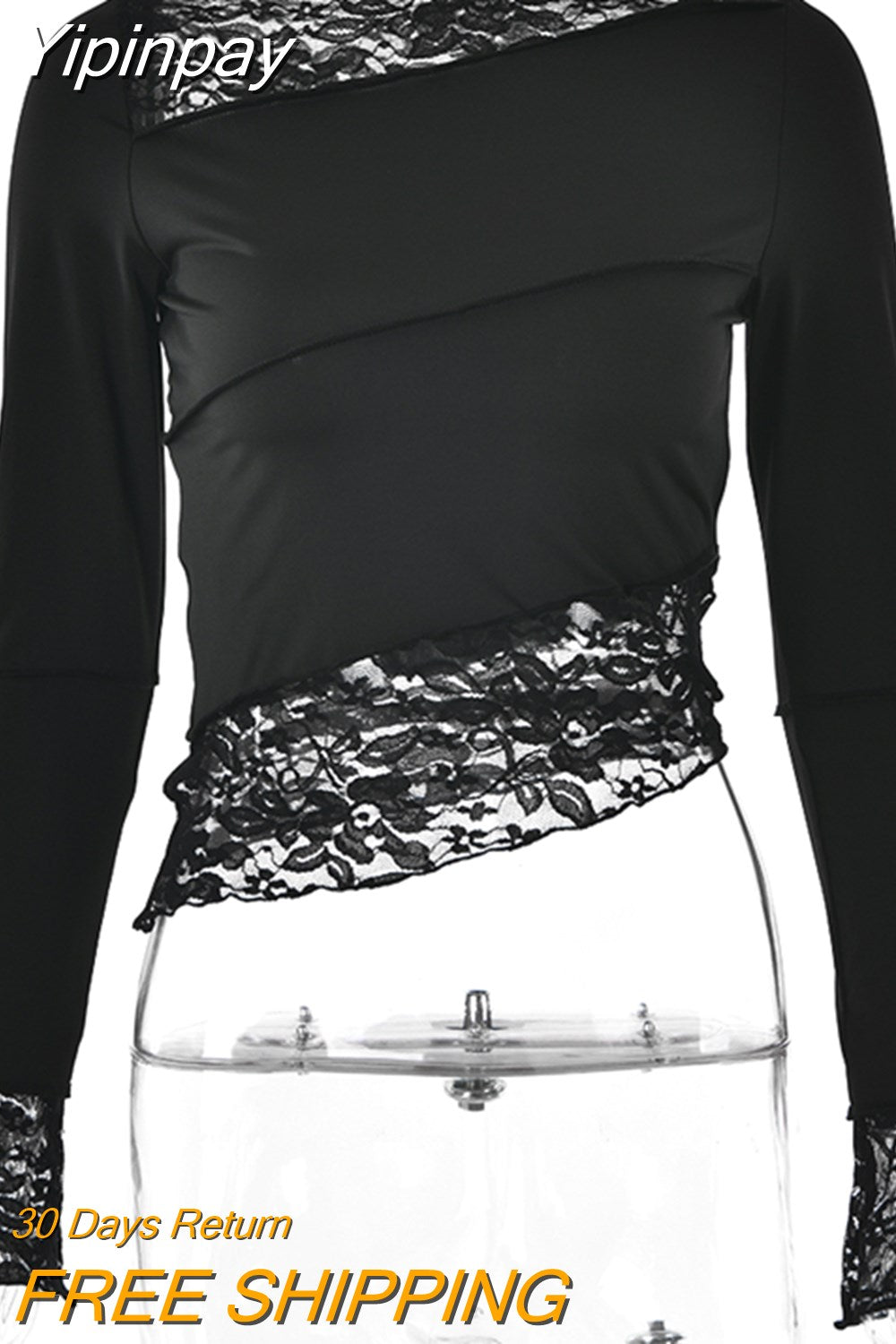 Yipinpay MO Lace Patchwork Long Sleeve Pullover Women Tops Elegant Skinny Tee Shirt Slim T-Shirts Clothes 2023 Summer New