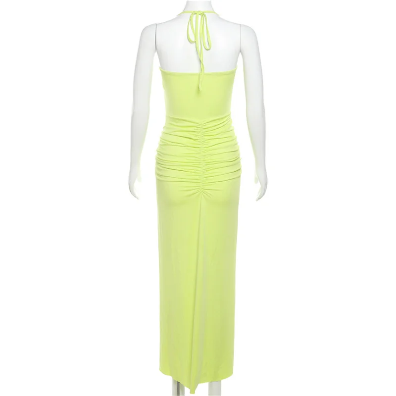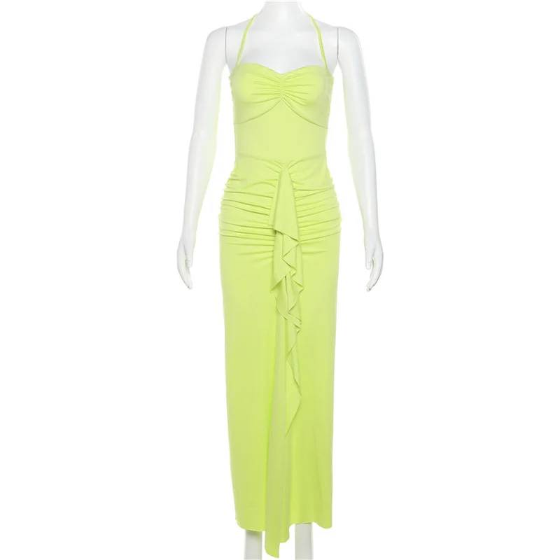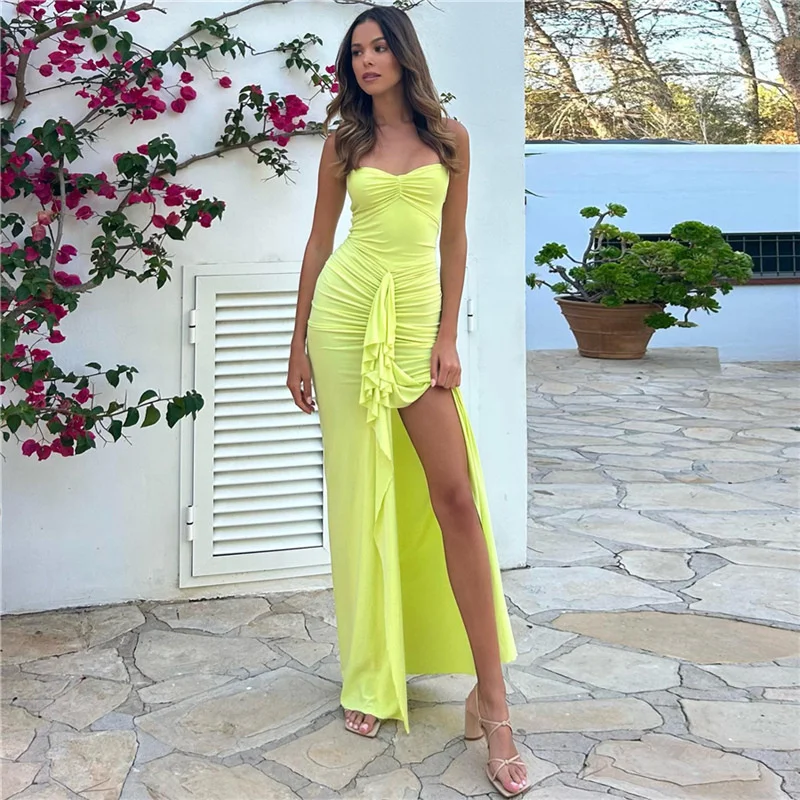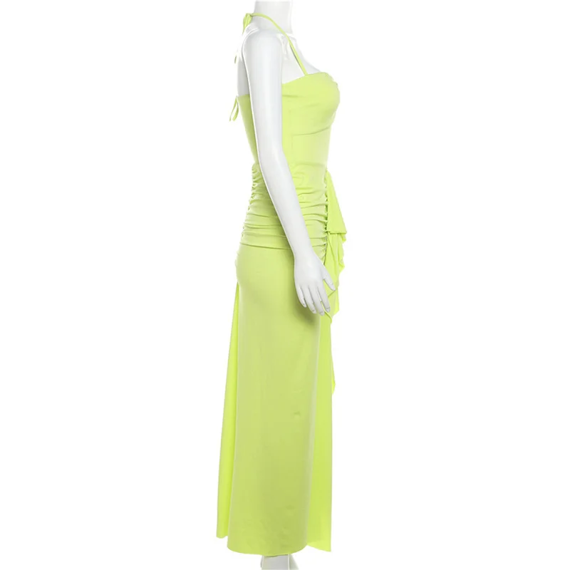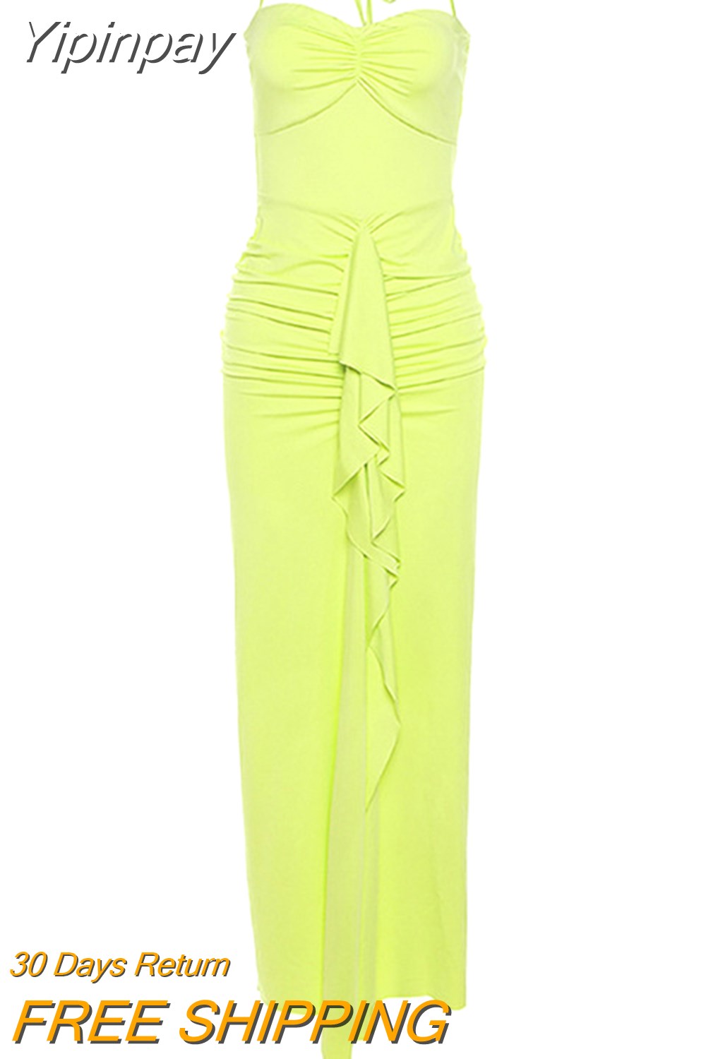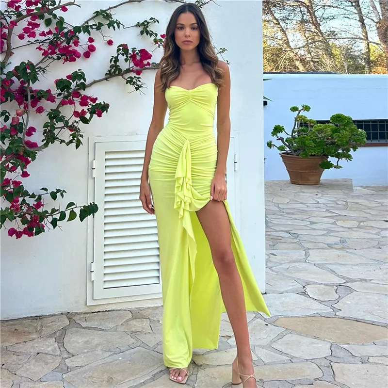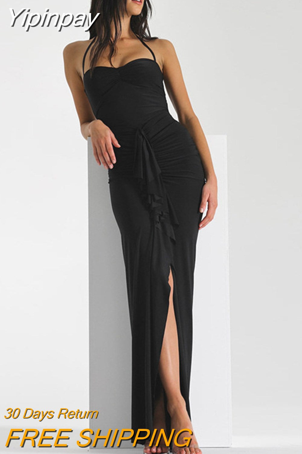 Yipinpay MO Women Sexy Halter Ruched Split Strapless Maxi Dress For Women 2023 Fall Backless Slim Evening Dress Beach Holiday