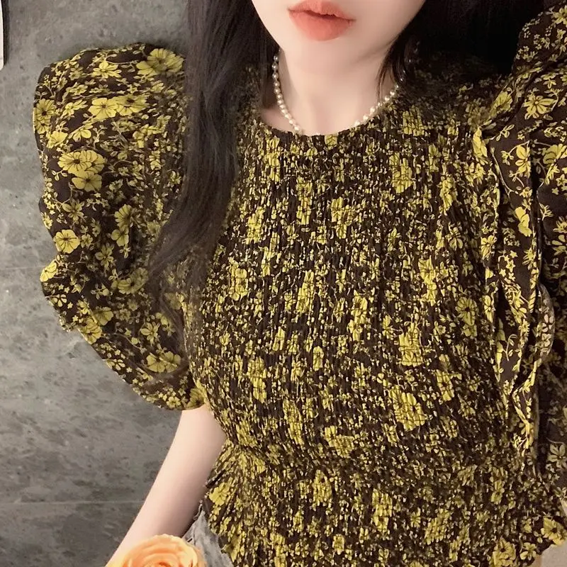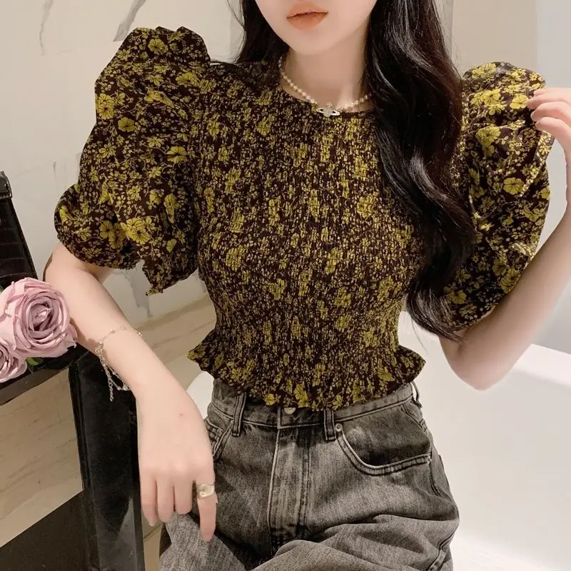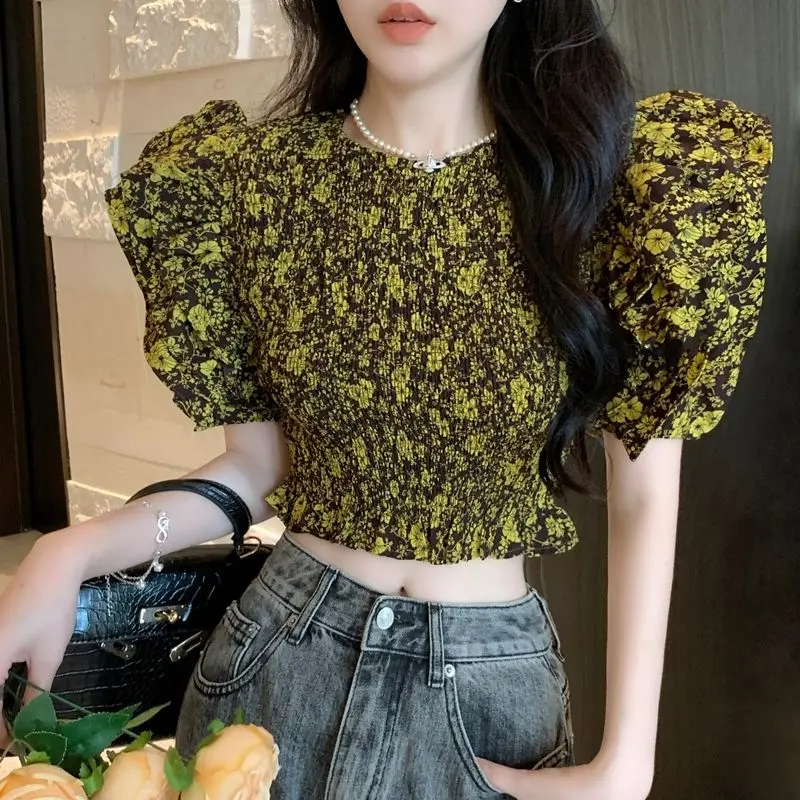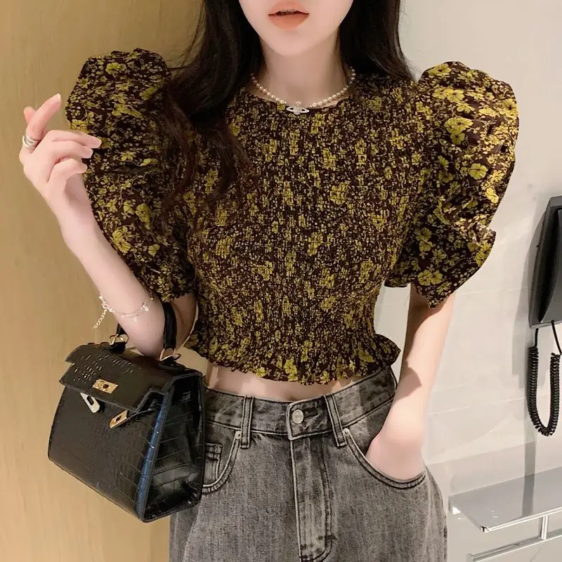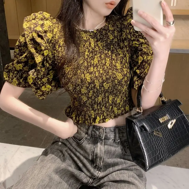 Yipinpay Mujer De Moda Sexy Floral Blouse Print Crop Top O Neck Ruffles Summer Shirts for Women 2023 Slim Shirt Femme Chic