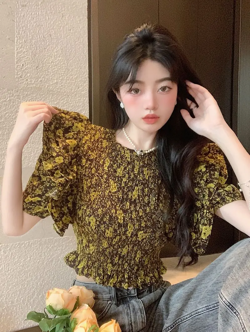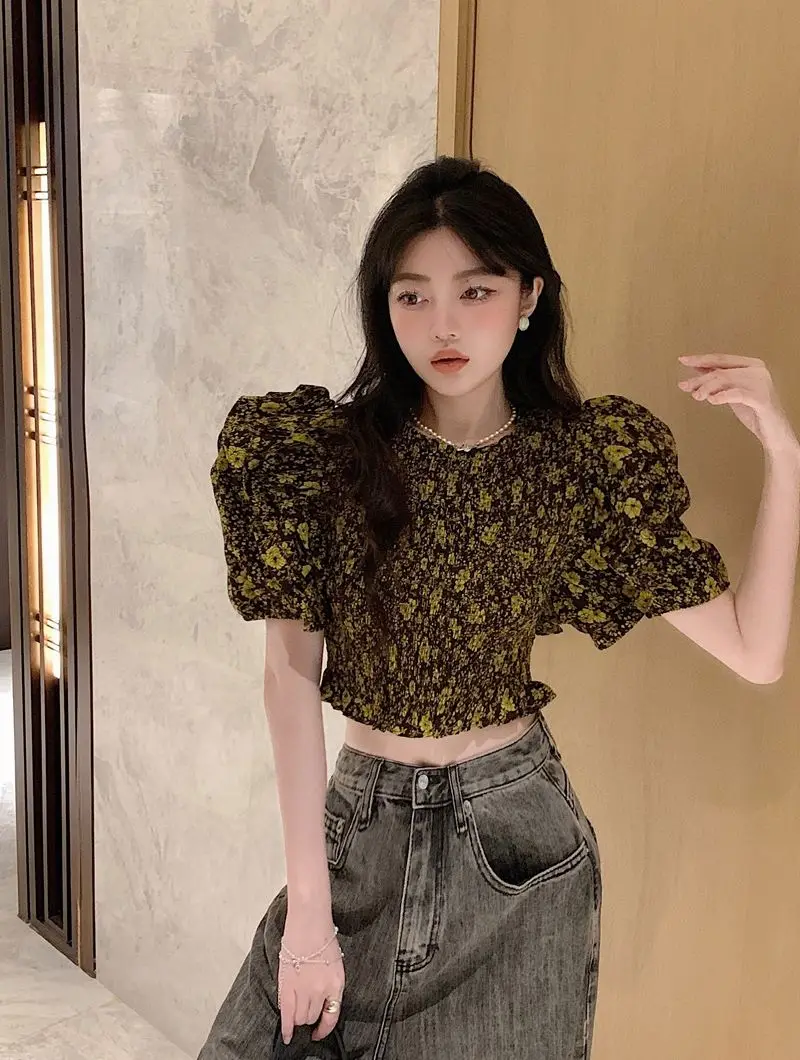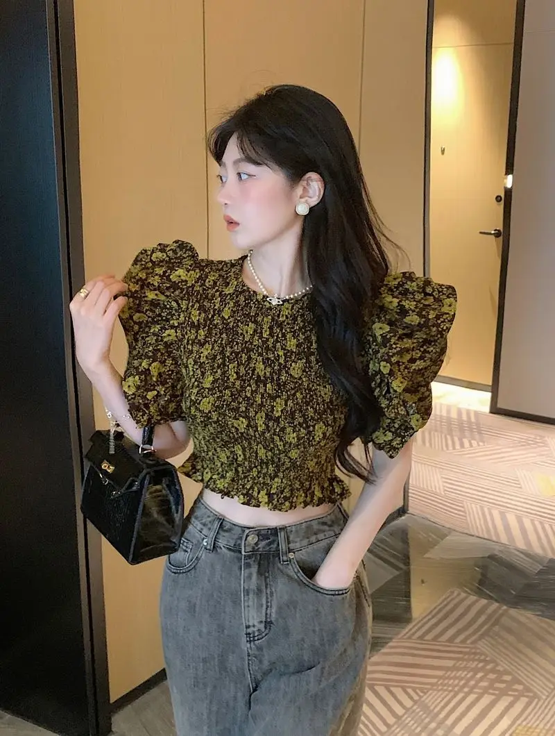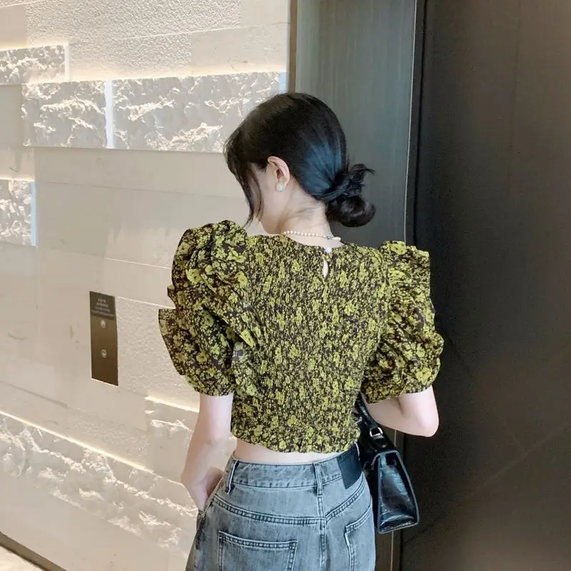 Yipinpay Mujer De Moda Sexy Floral Blouse Print Crop Top O Neck Ruffles Summer Shirts for Women 2023 Slim Shirt Femme Chic