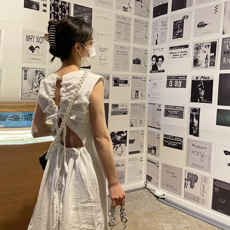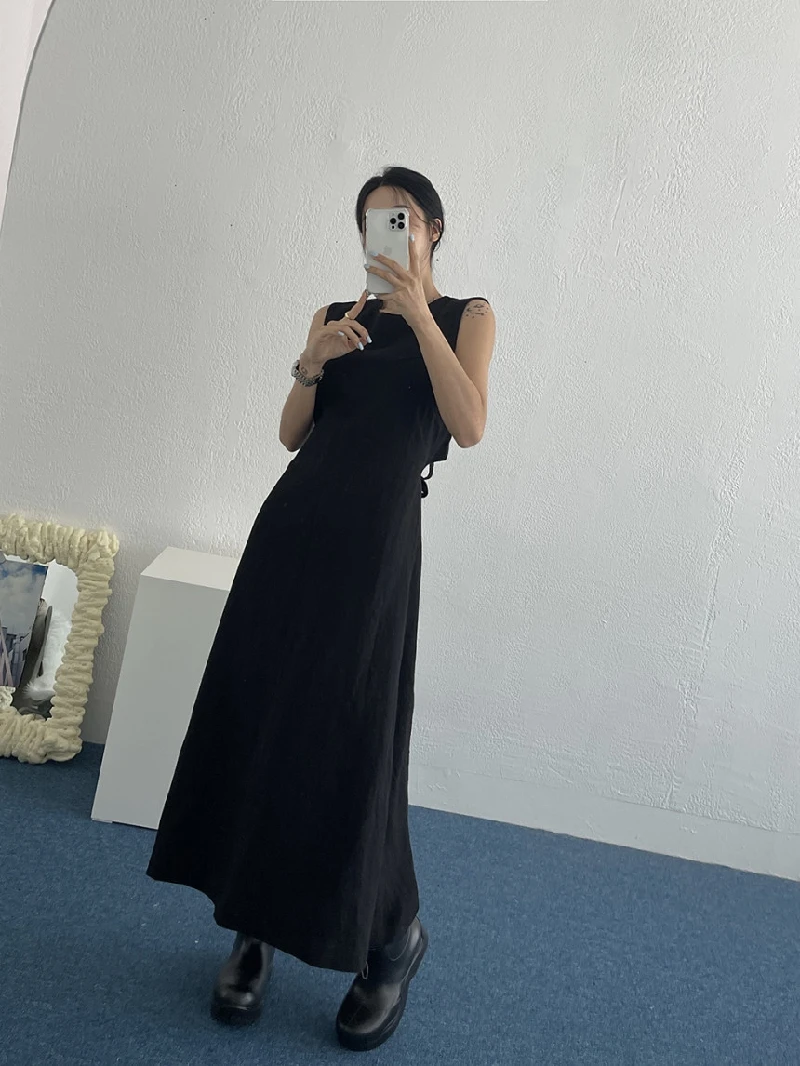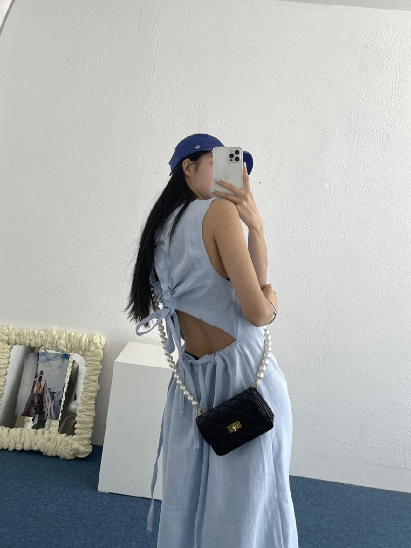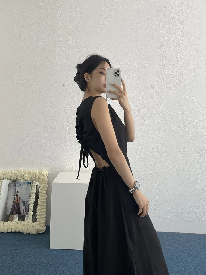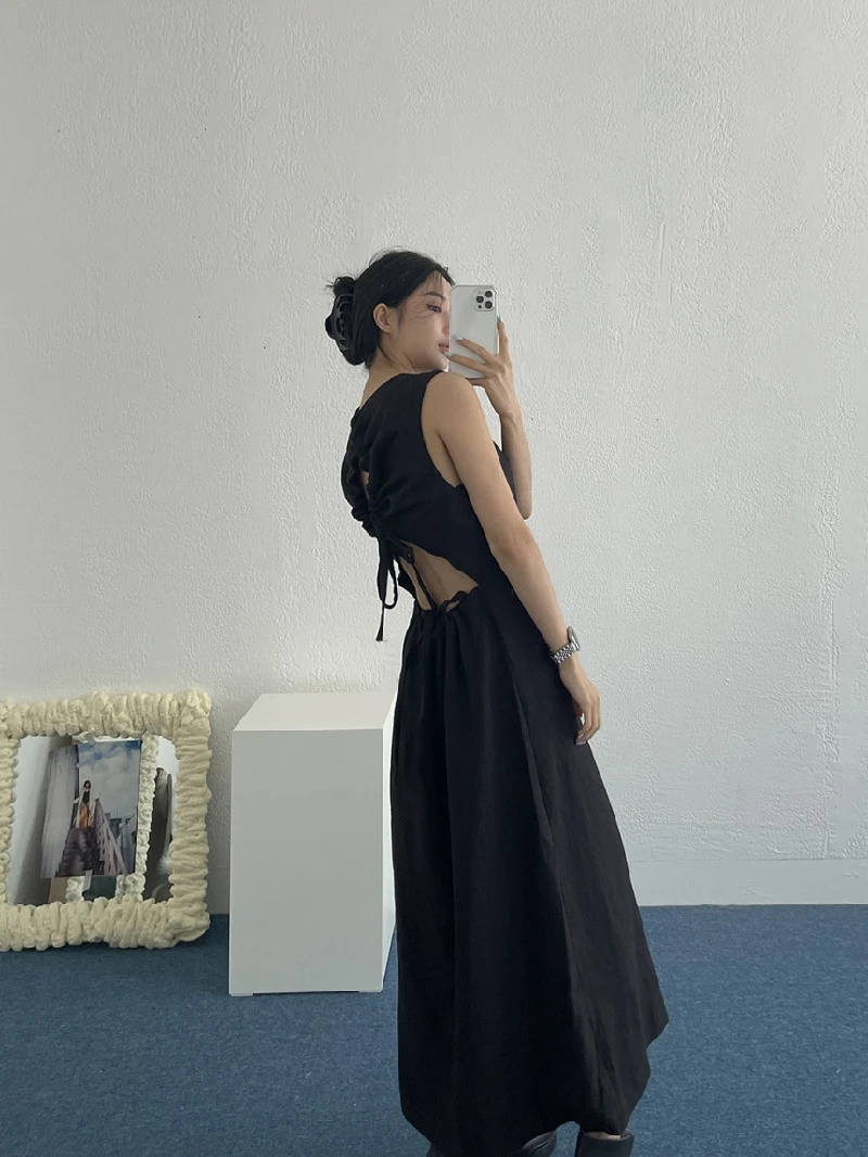 Yipinpay Neck Back Lace Up Ruffle Open Back Sleeveless Dress Women Casual Vestidos Mujer Black White Vest Minimalism Summer Dress