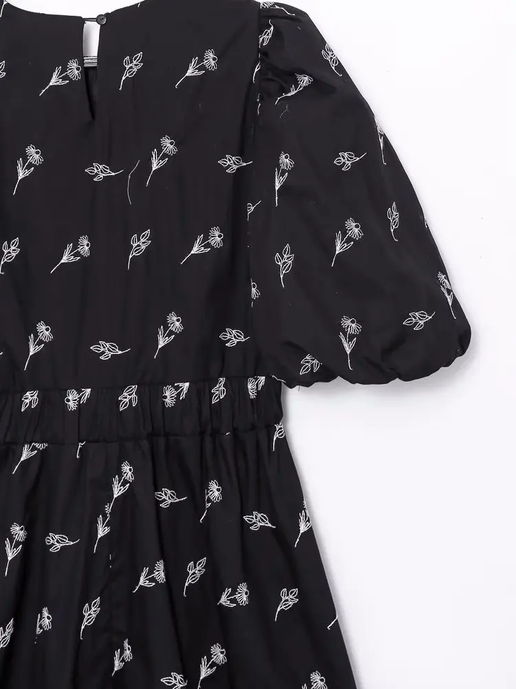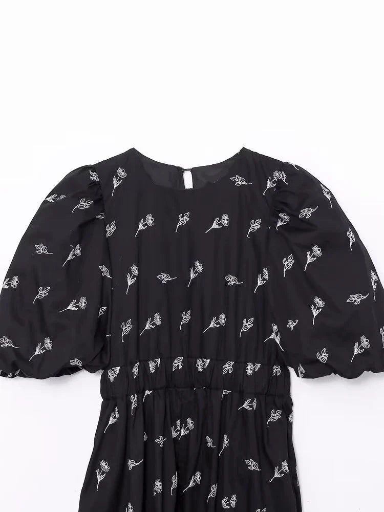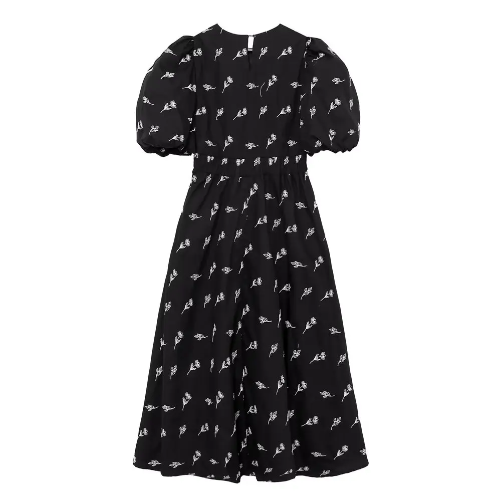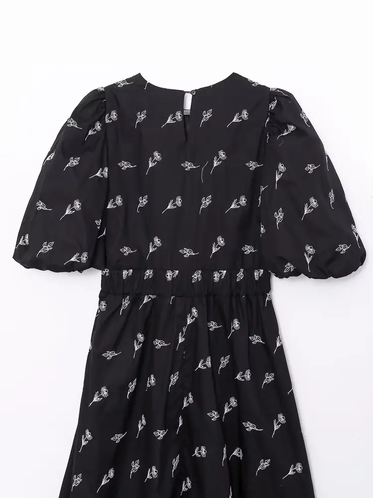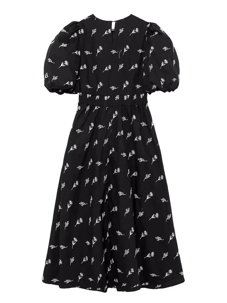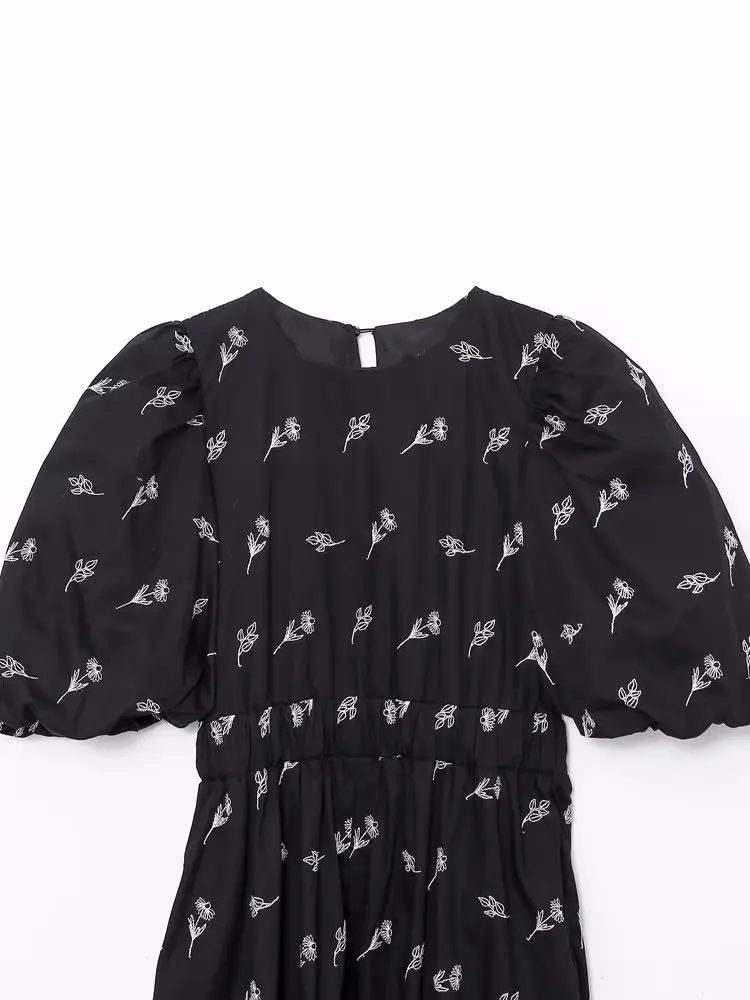Yipinpay New Fashion Women Floral Embroidery Black Midi Dress Vintage Puff Sleeve O Neck Female Dress