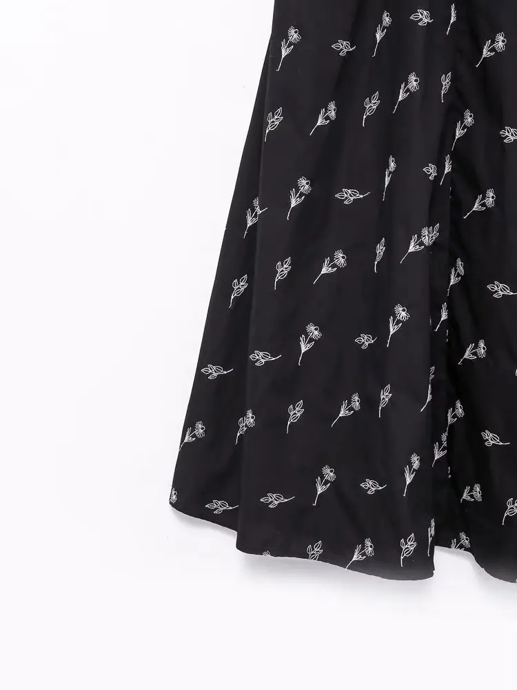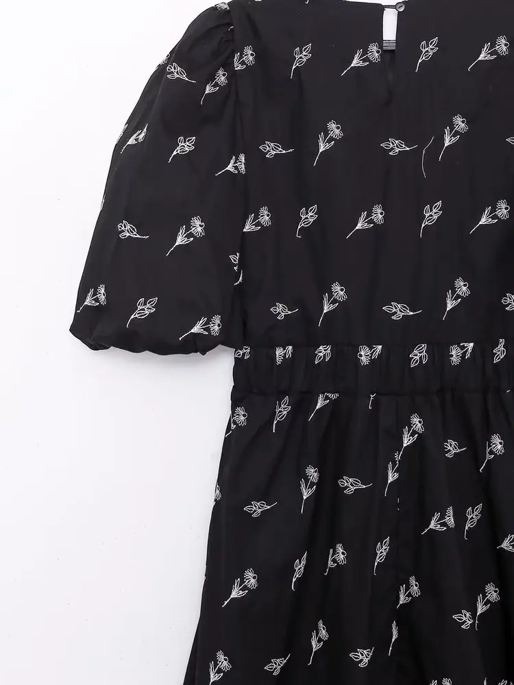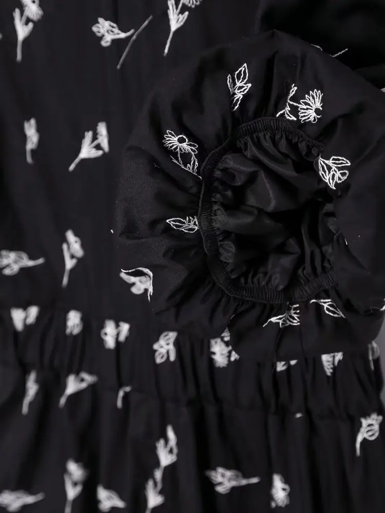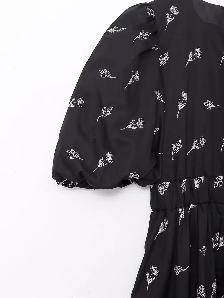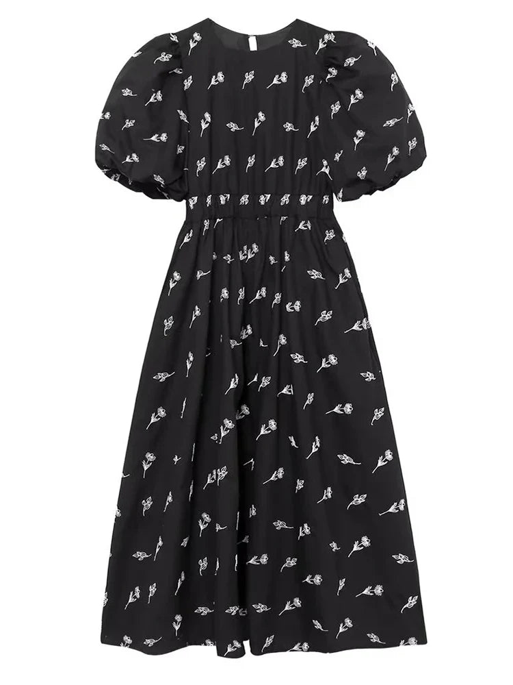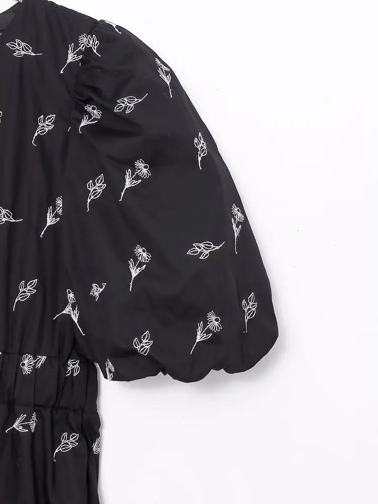 Yipinpay New Fashion Women Floral Embroidery Black Midi Dress Vintage Puff Sleeve O Neck Female Dress