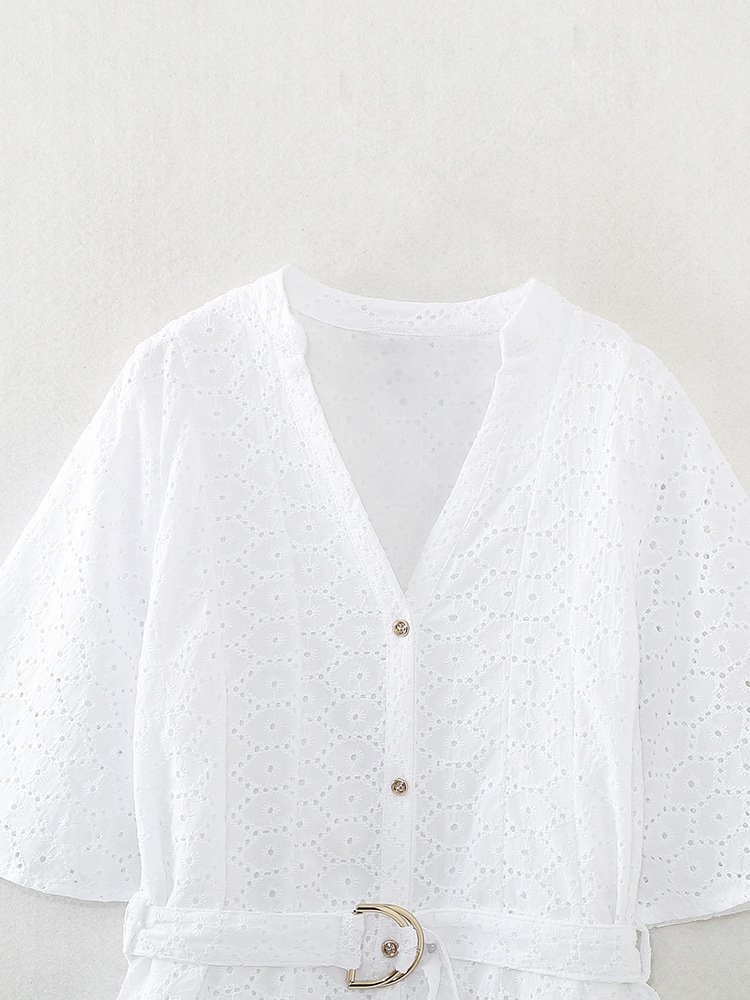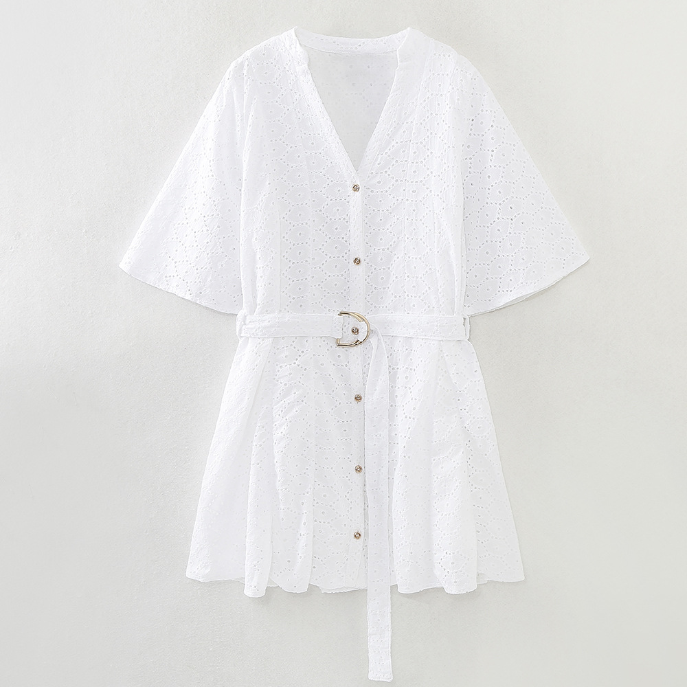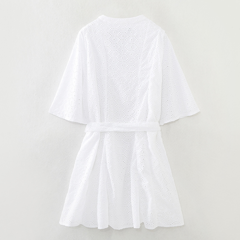 Yipinpay New Hollowed-Out Embroidery With Belt Mini Dress 8175960