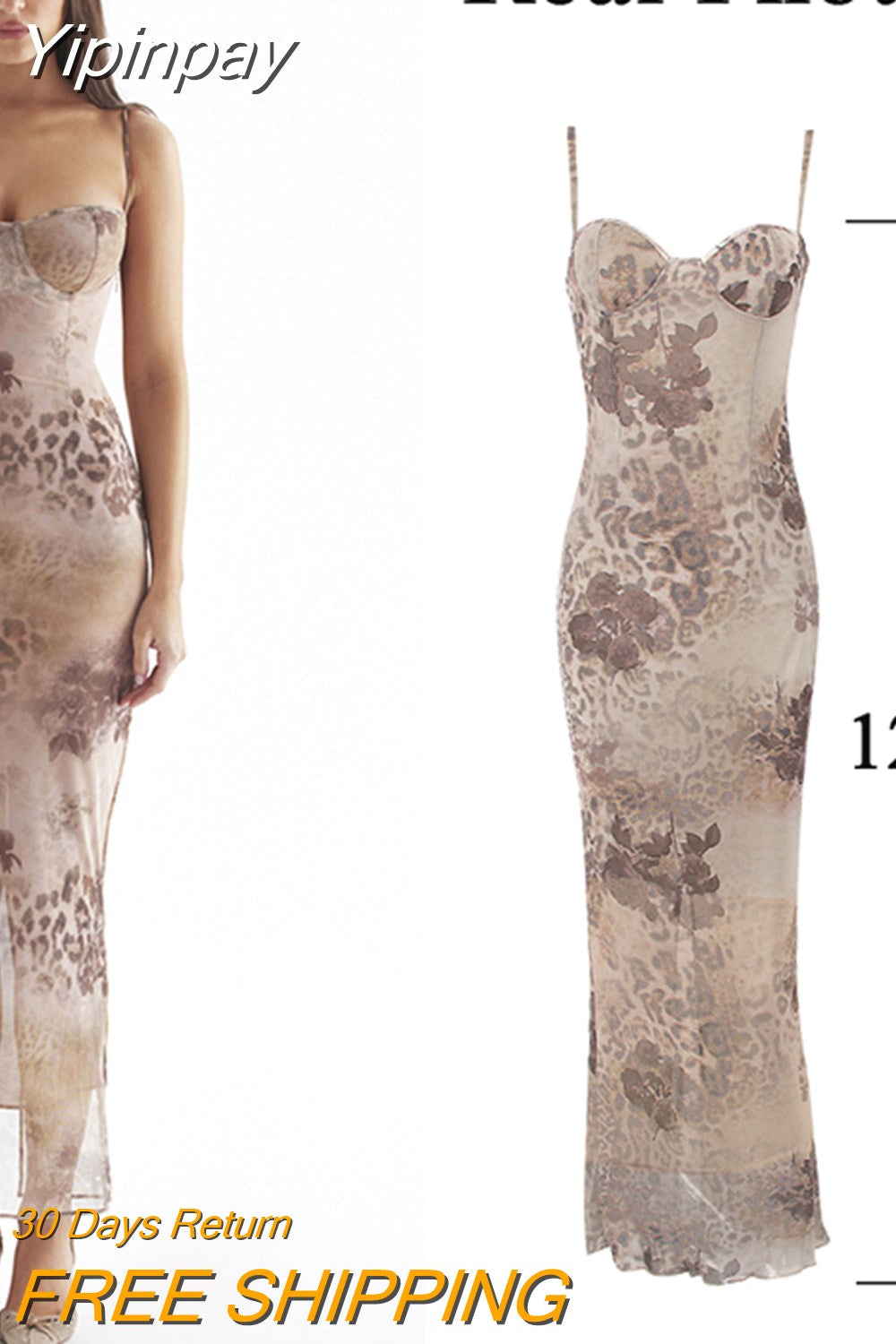Yipinpay New Mesh Print Long Dress with Chest Padded Sexy Back Lace Up Vacays Party Going Out Outfits Summer Dress Women 2023