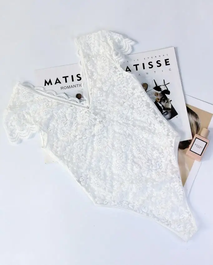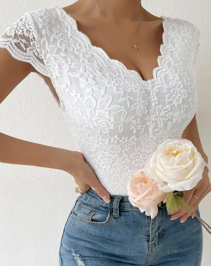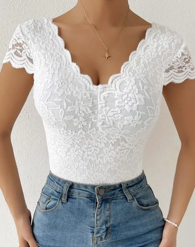 Yipinpay new sexy women's jumpsuit casual Scallop Trim V-Neck Lace Bodysuit short sleeve tops jumpsuit skinny female slim bodysuit