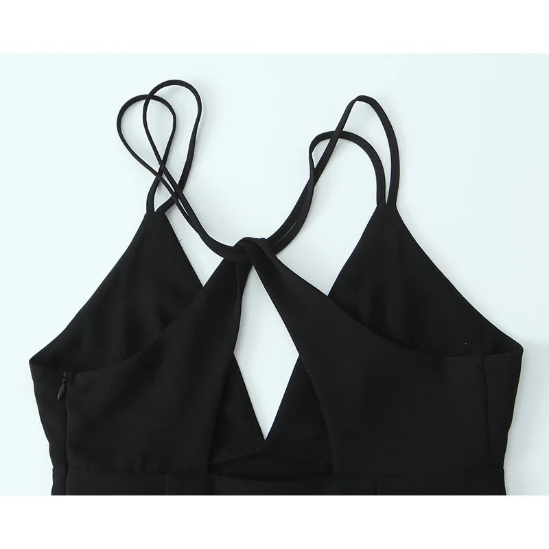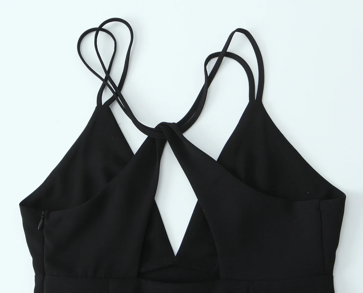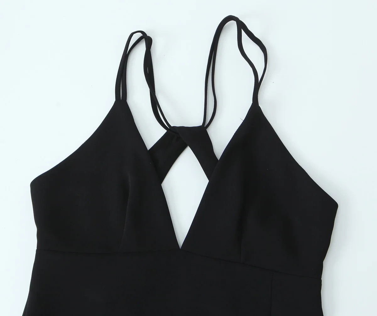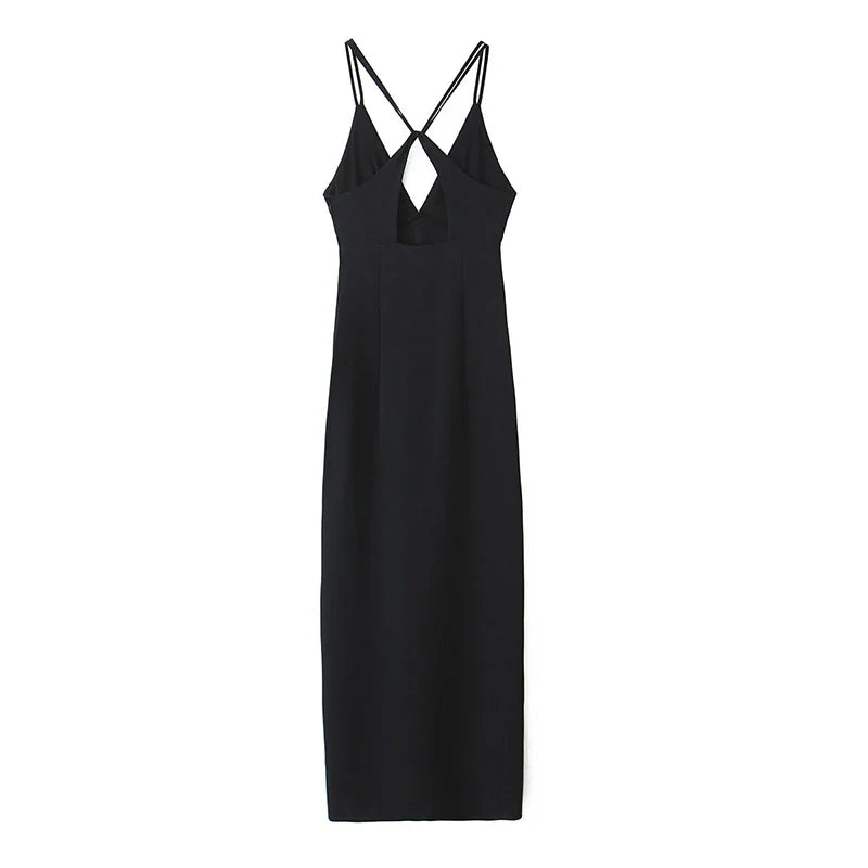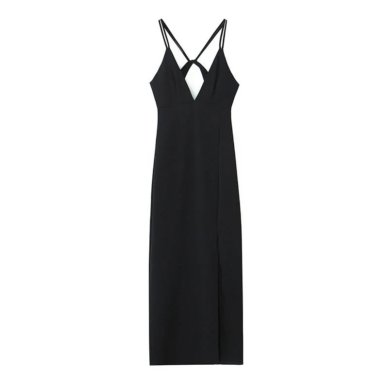 Yipinpay New Women Double Spaghetti Straps Black Midi Sexy Dress Front Slit V Neck Backless Female Party Vestidos