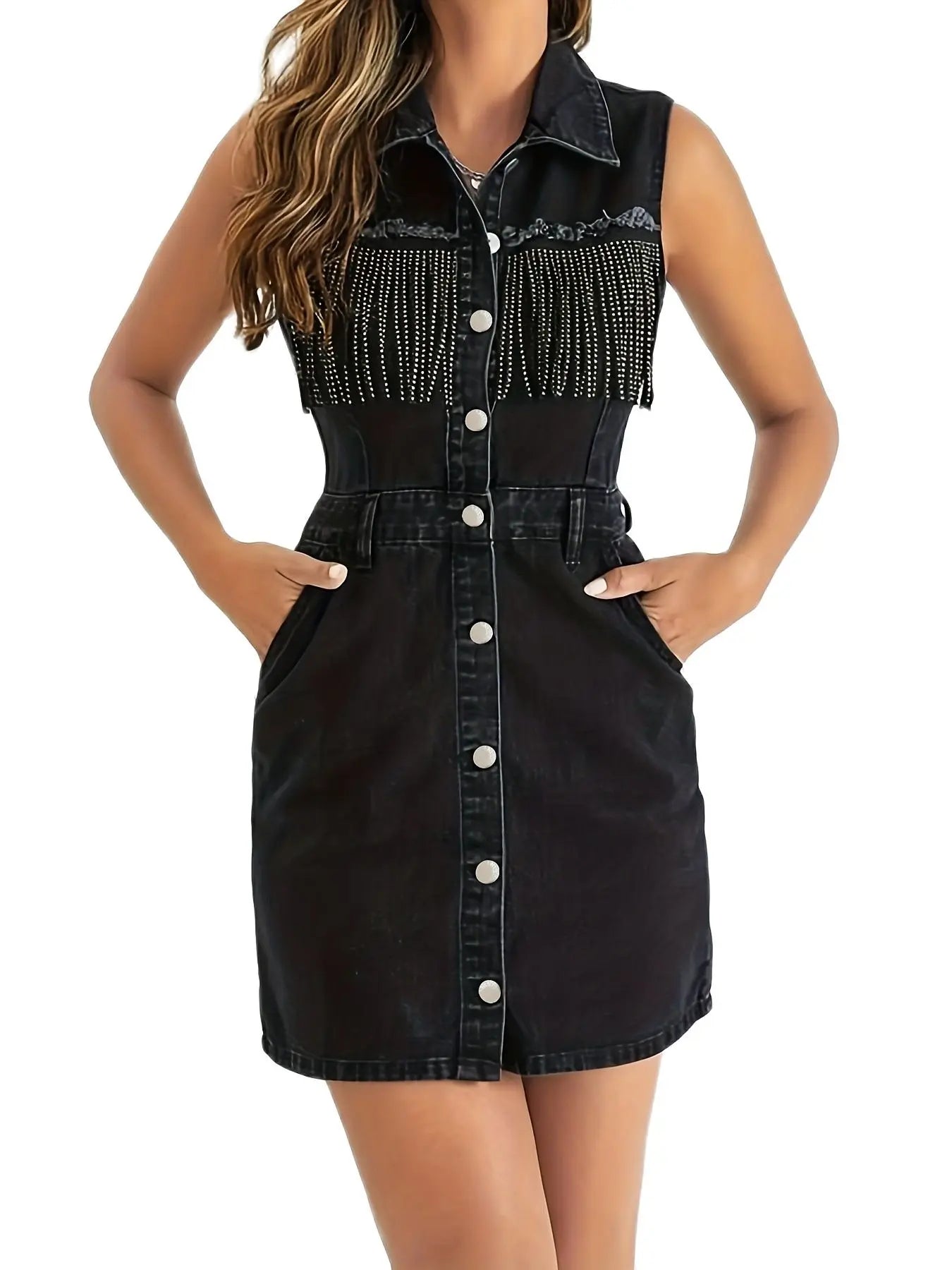 Yipinpay New Women Summer Black Beaded Tassel Denim Dress Fashion Slim Sleeveless Mini Jeans Dress Casual Clothing S-2XL